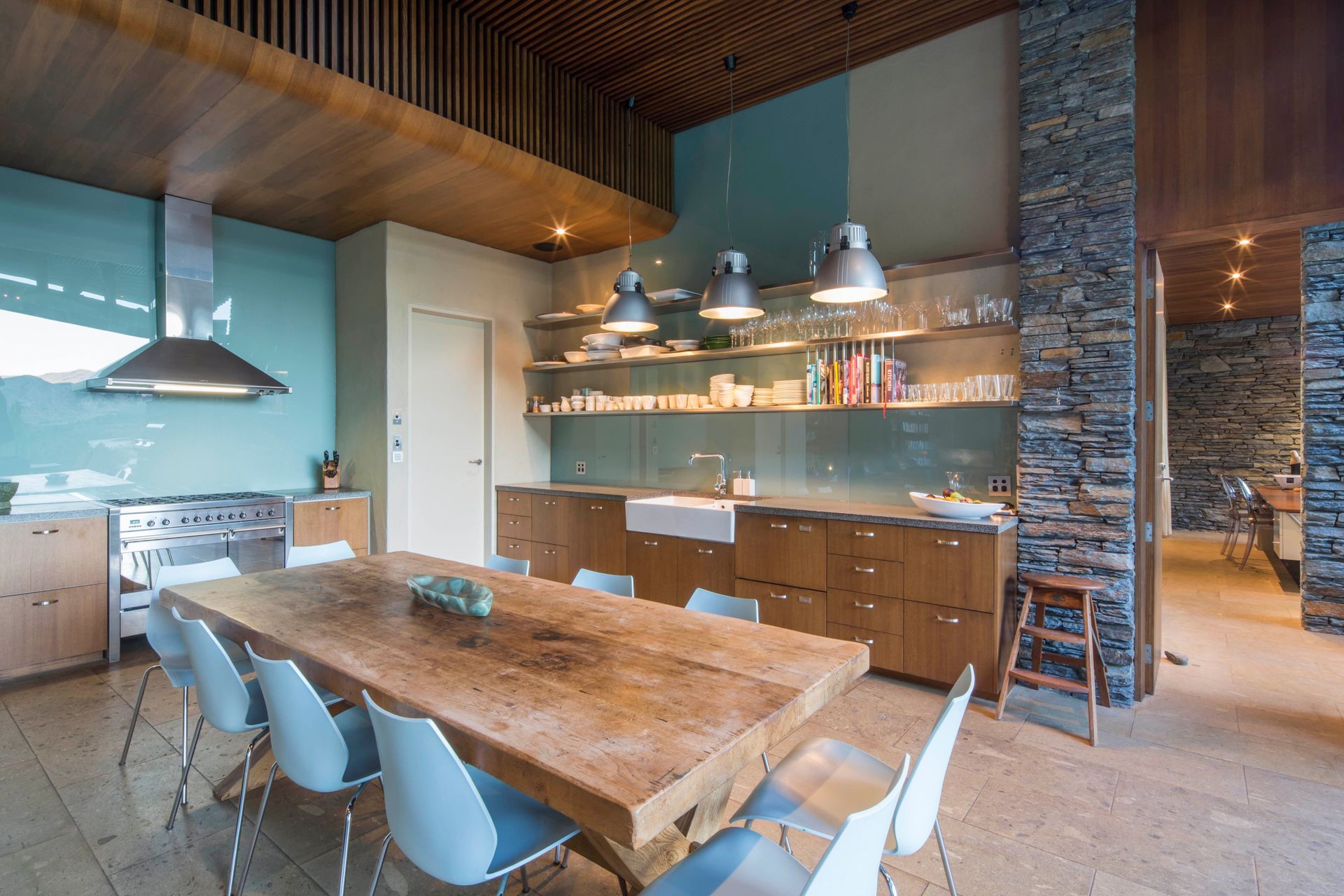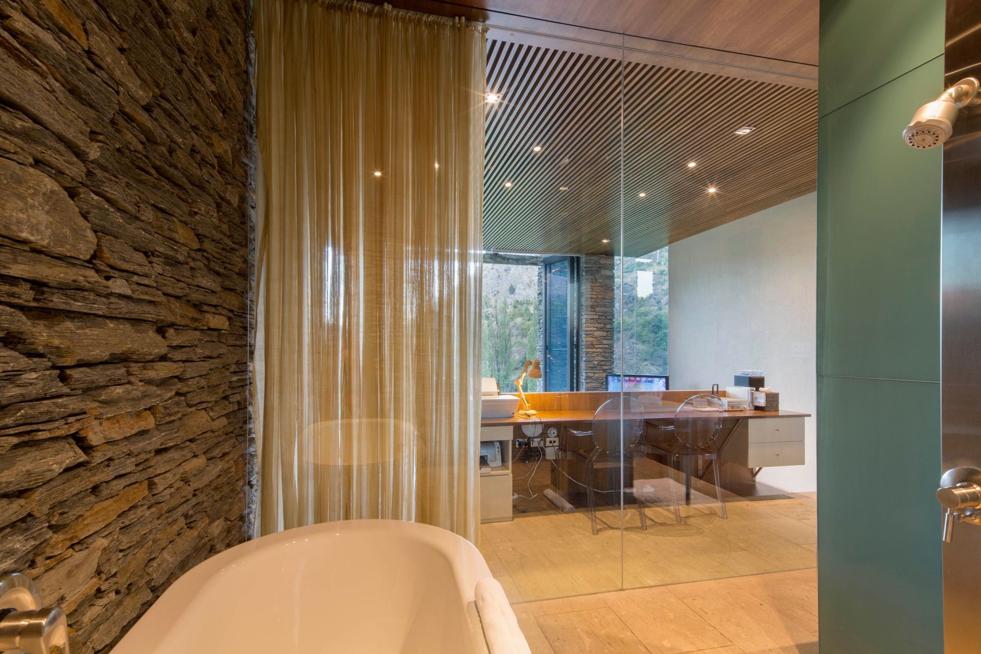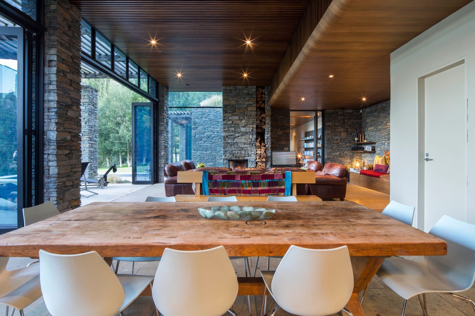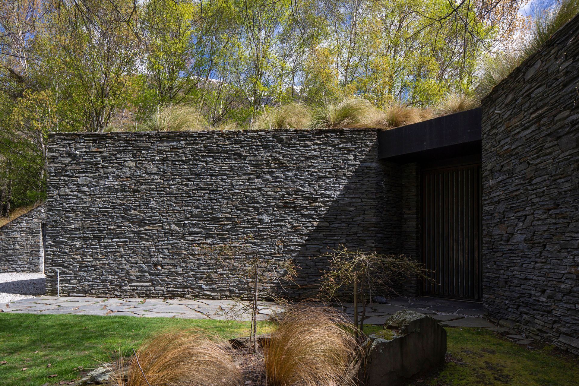 ArchiPro Project Summary - Award-winning environmentally designed house in Arthurs Point, featuring schist stone and natural wood beams, with stunning views of the Shotover River and Coronet Peak.