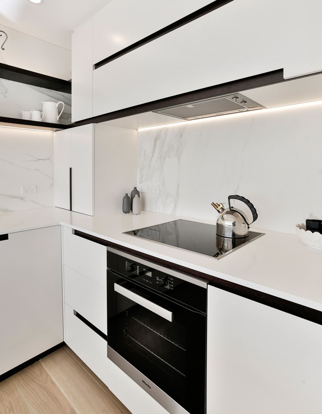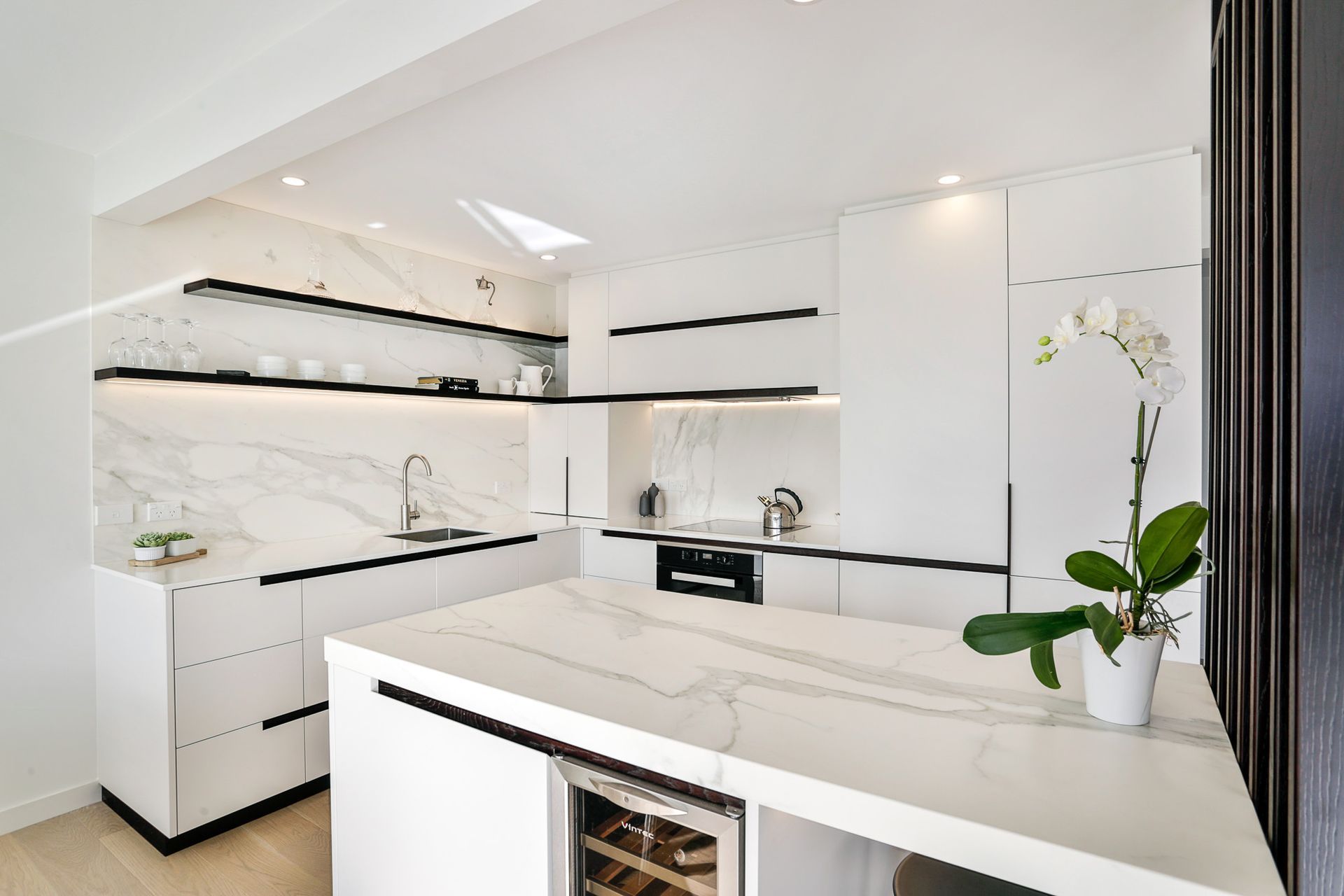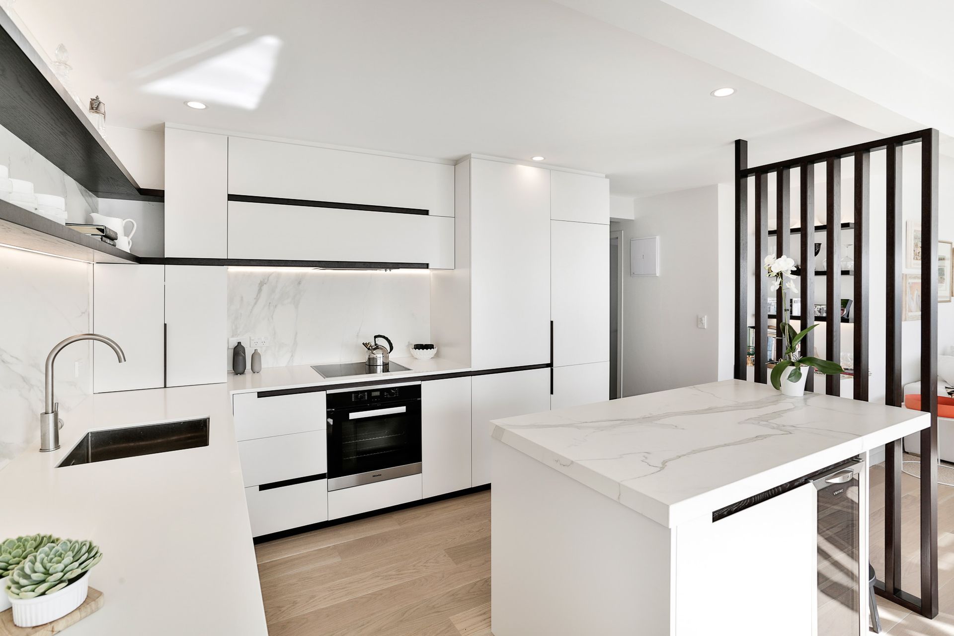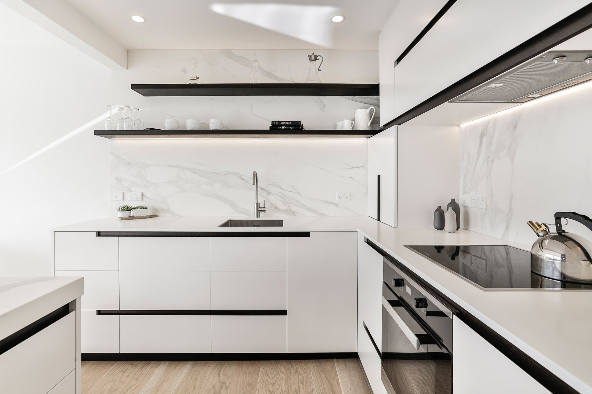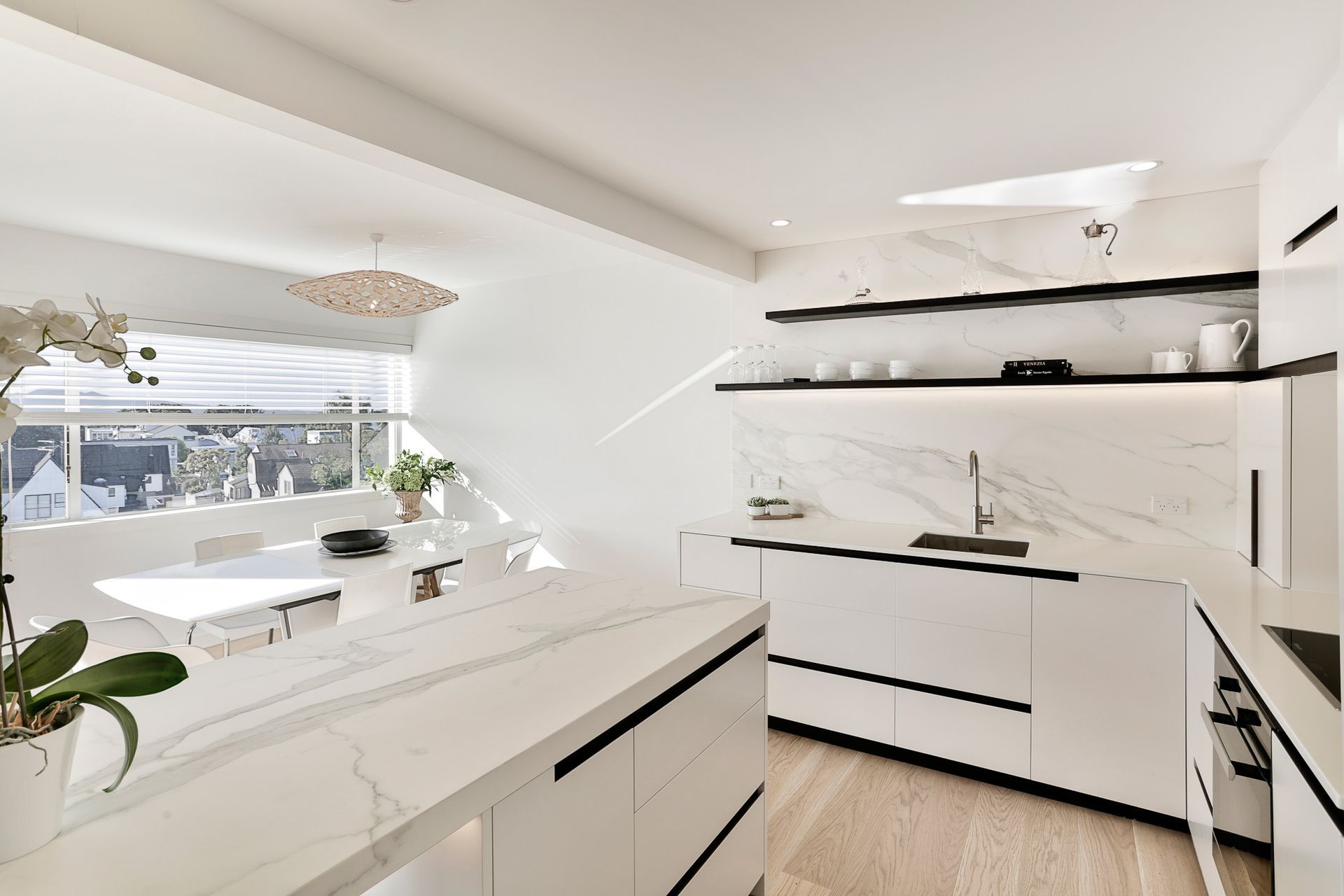 ArchiPro Project Summary - A beautifully designed kitchen and bathroom refurbishment in a compact Auckland apartment, featuring an open layout, integrated appliances, and a minimalistic material palette that enhances functionality and aesthetics while maximizing panoramic harbour views.