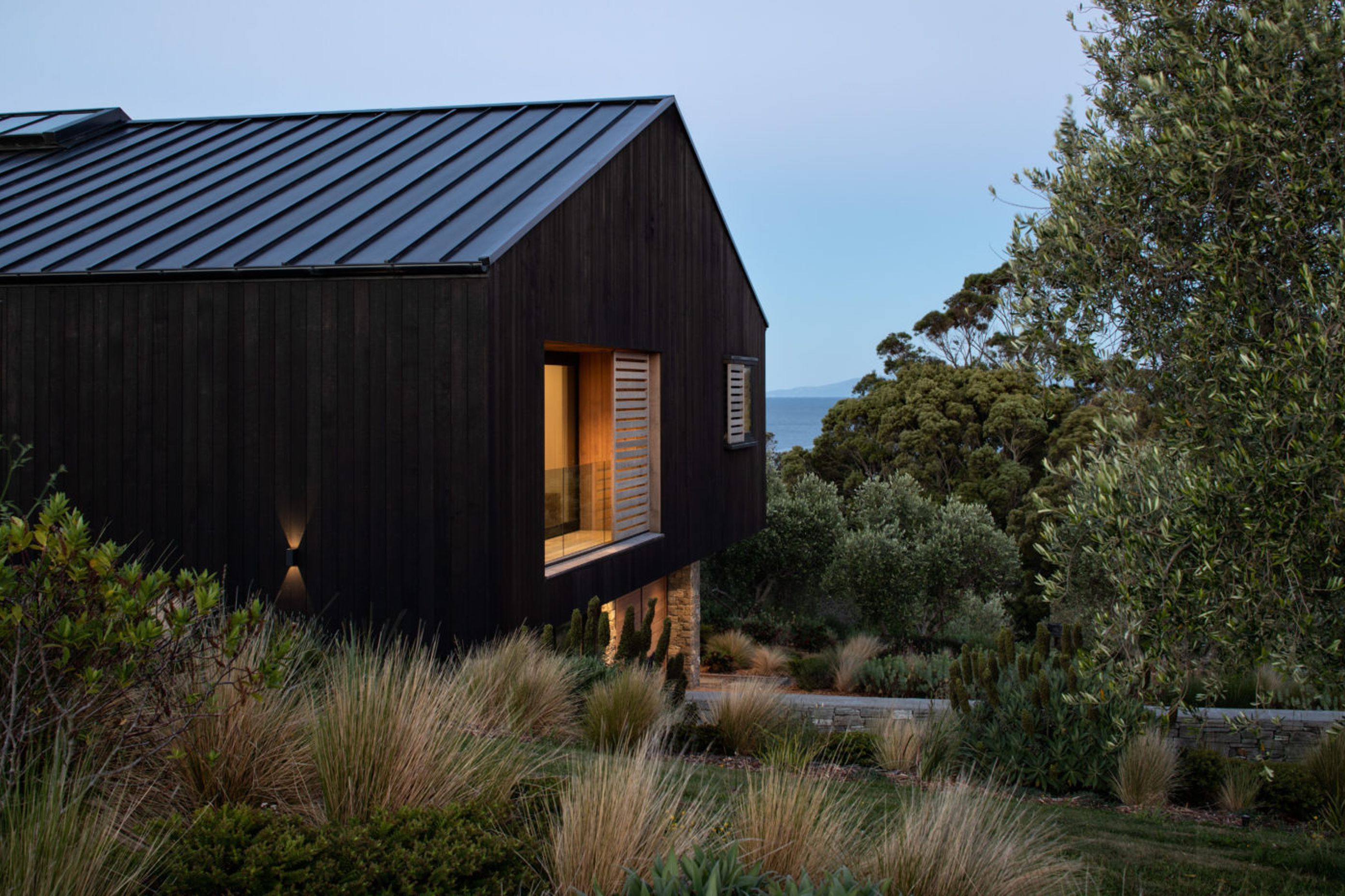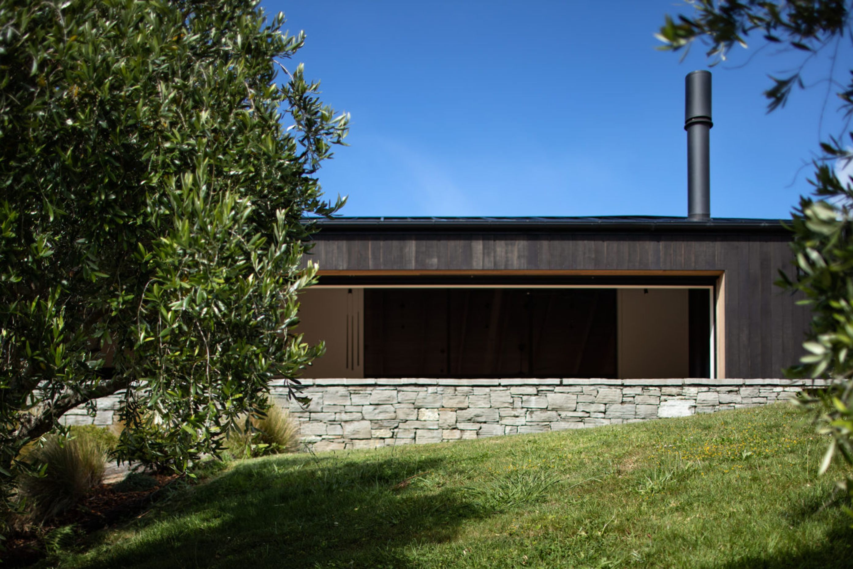 ArchiPro Project Summary - Award-winning residence nestled in an olive grove, featuring a harmonious blend of natural materials and modern design, offering stunning views of Waiheke's outer harbour.