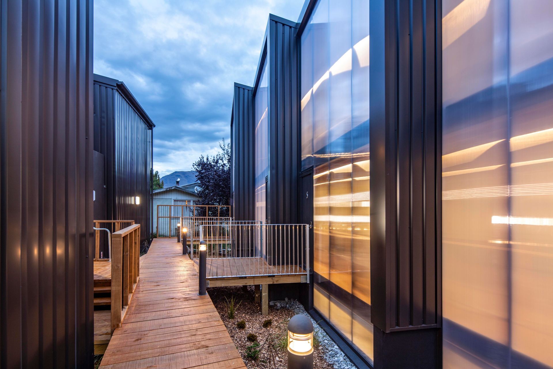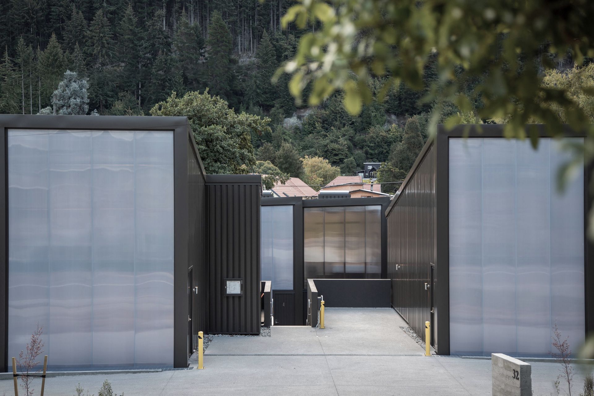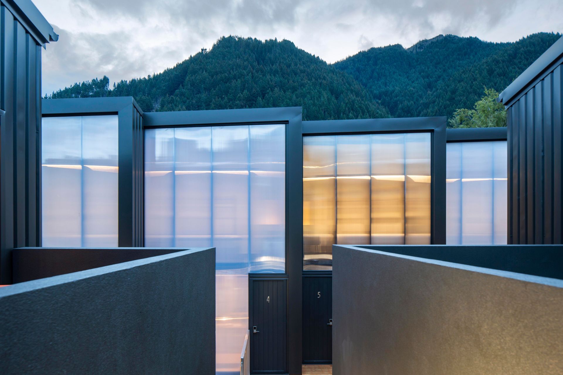 ArchiPro Project Summary - Koura Apartments offer six spacious self-contained units in downtown Queenstown, featuring large translucent end walls for privacy and natural light, complemented by industrial detailing and warm natural timbers for a light and airy interior.