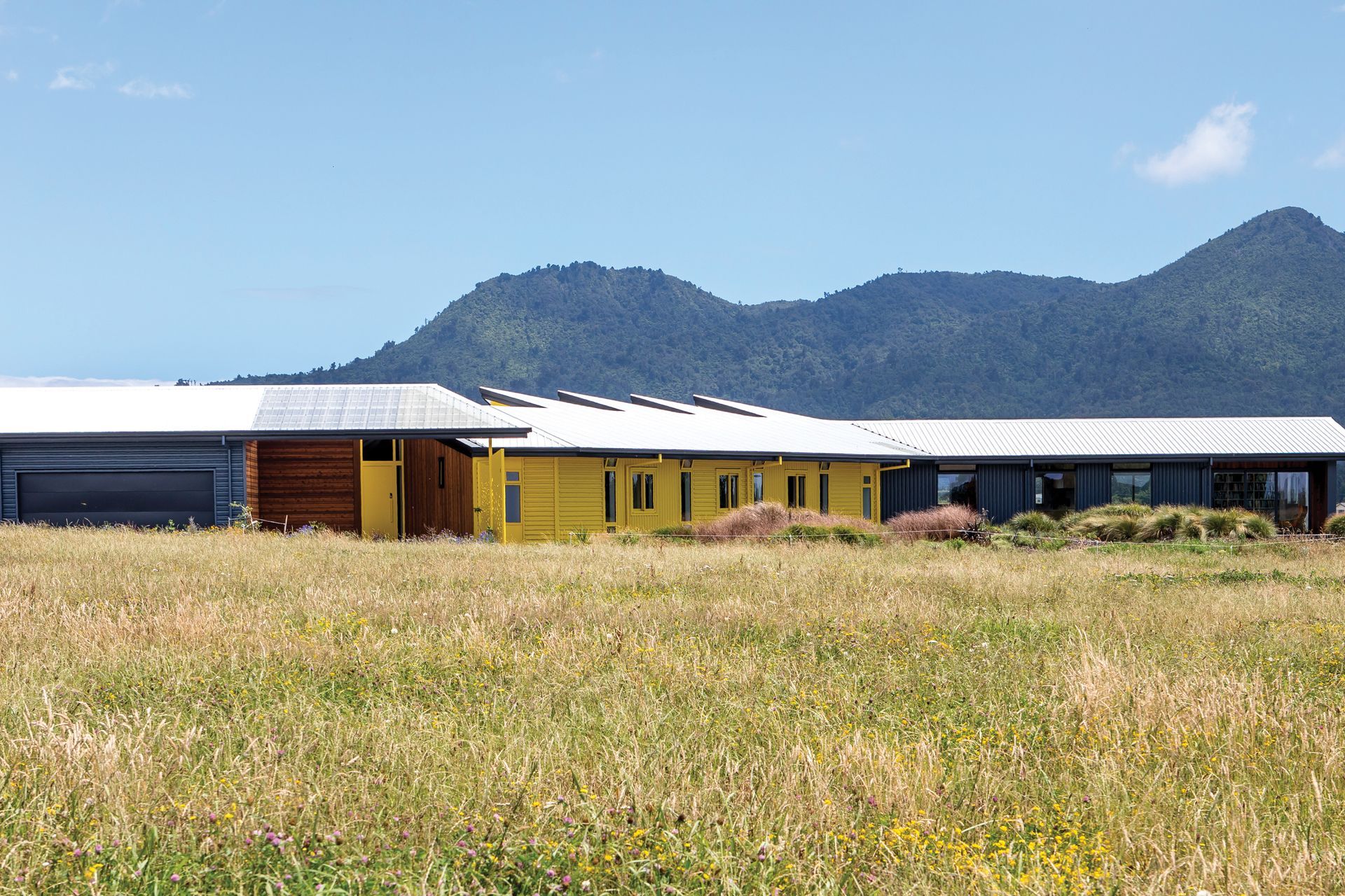 ArchiPro Project Summary - Kowhai House: A stunning, energy-efficient residence in rural Taranaki, featuring dramatic interiors, vibrant exteriors, and innovative sustainability solutions, all while maximizing breathtaking views of Mount Taranaki and the Kaitake Ranges.