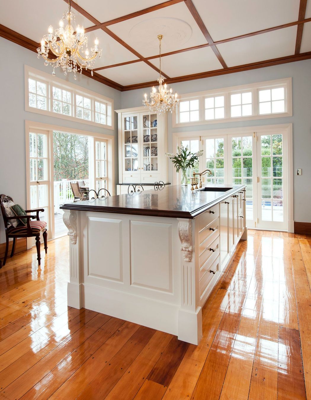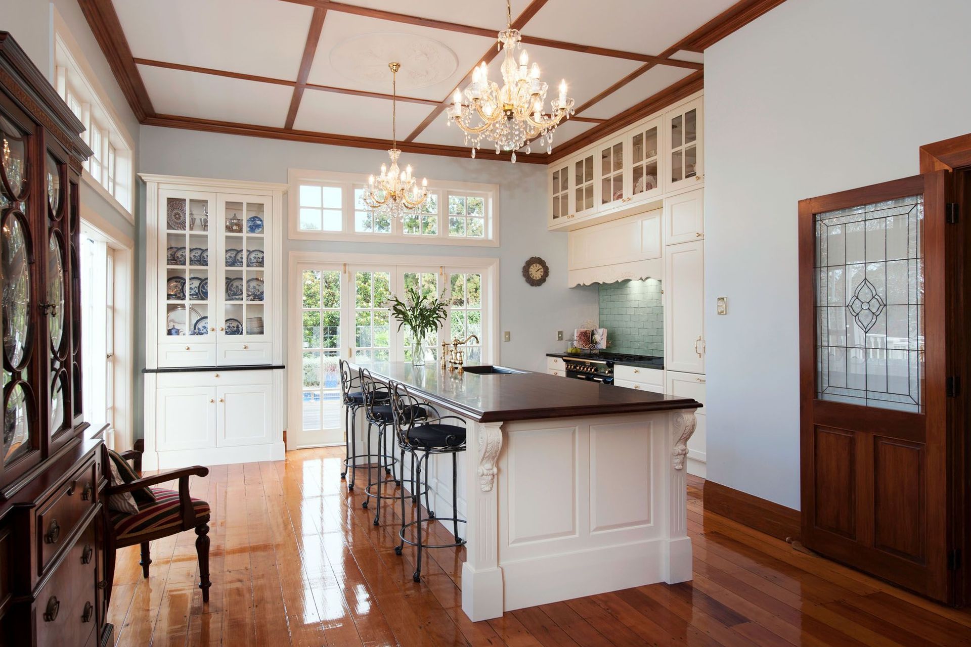 ArchiPro Project Summary - The Kumeu Kitchen project highlights modern design with wood flooring, a stunning chandelier, and a spacious worktop, creating an inviting space for cooking and entertaining.