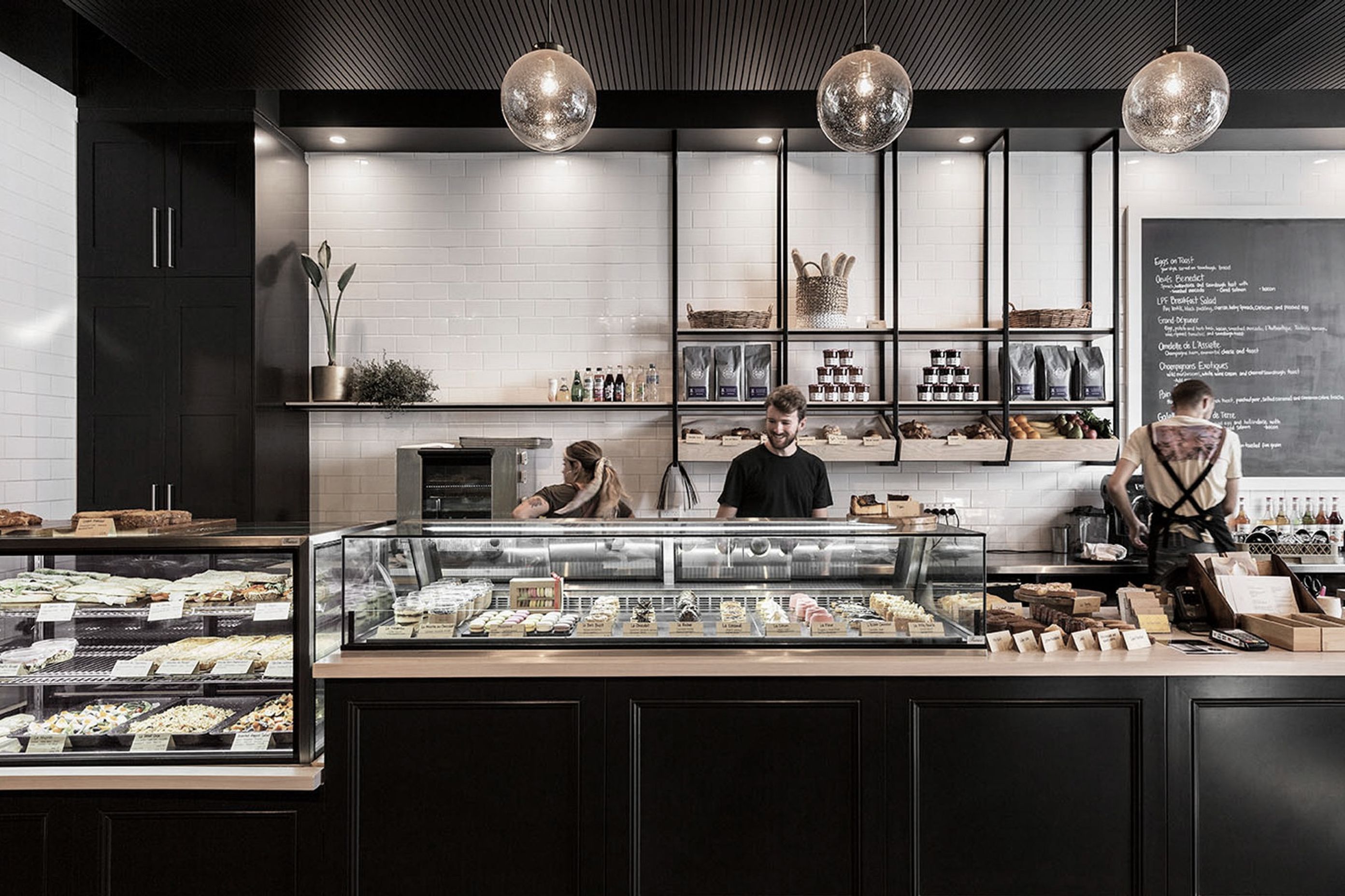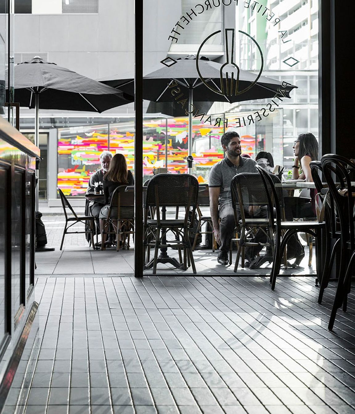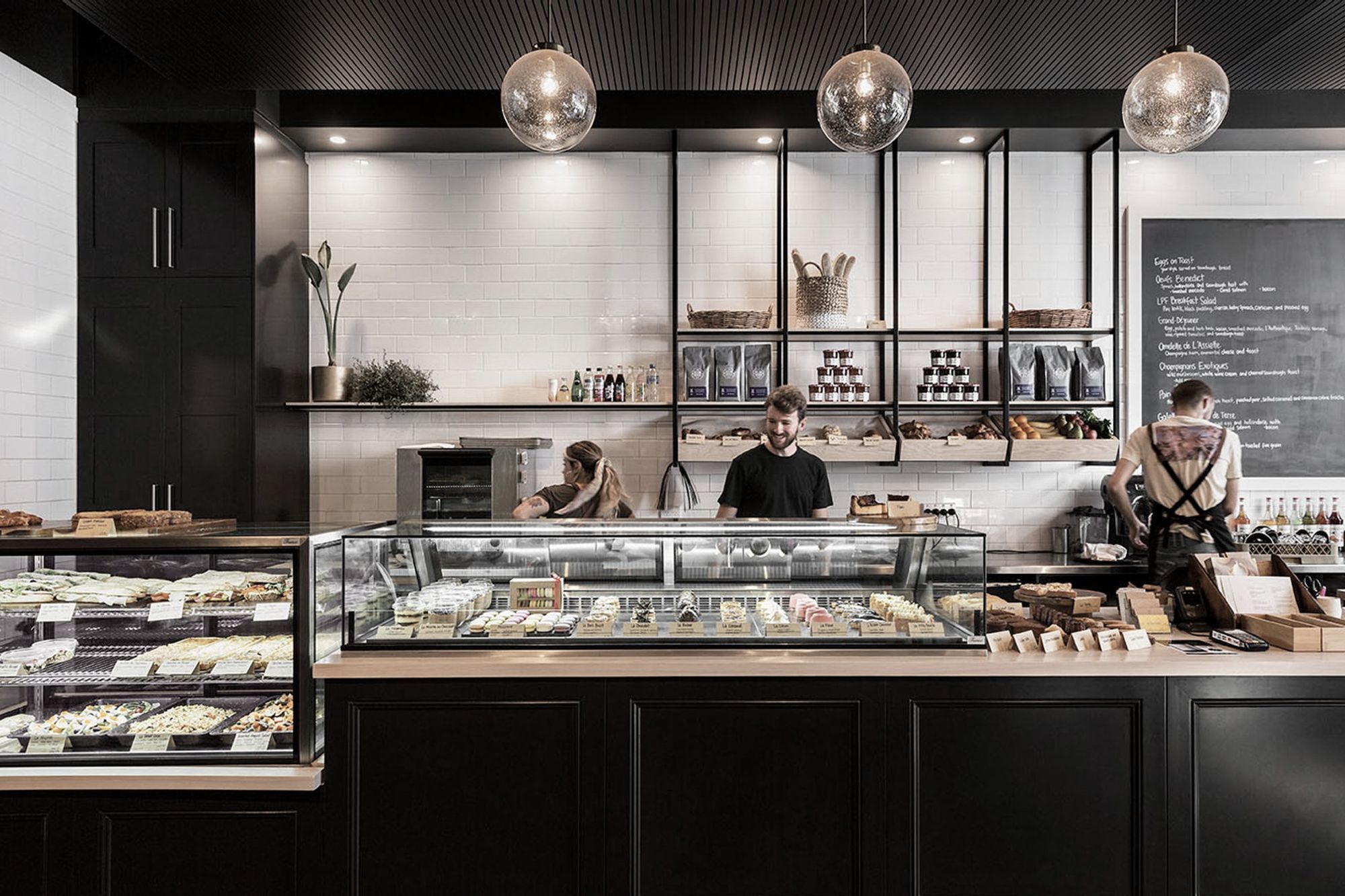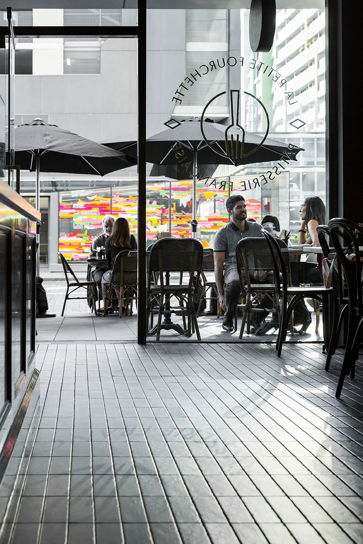ArchiPro Project Summary - La Petite Fourchette Britomart features a welcoming café environment with expanded dining options, utilizing dark materials to create warmth while showcasing the culinary delights on display.