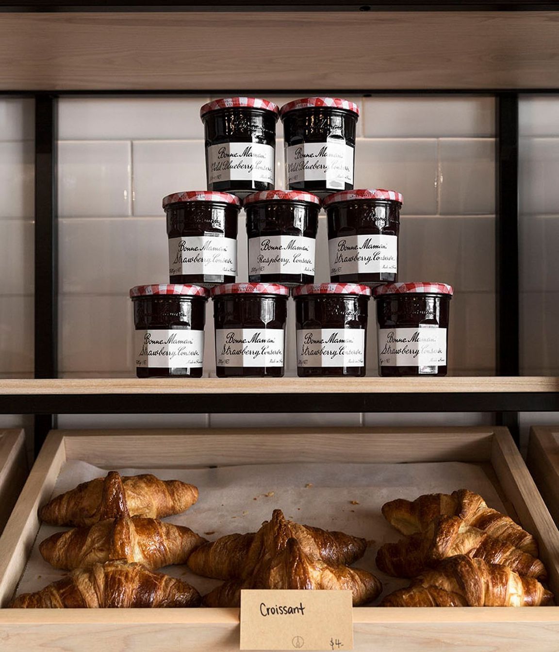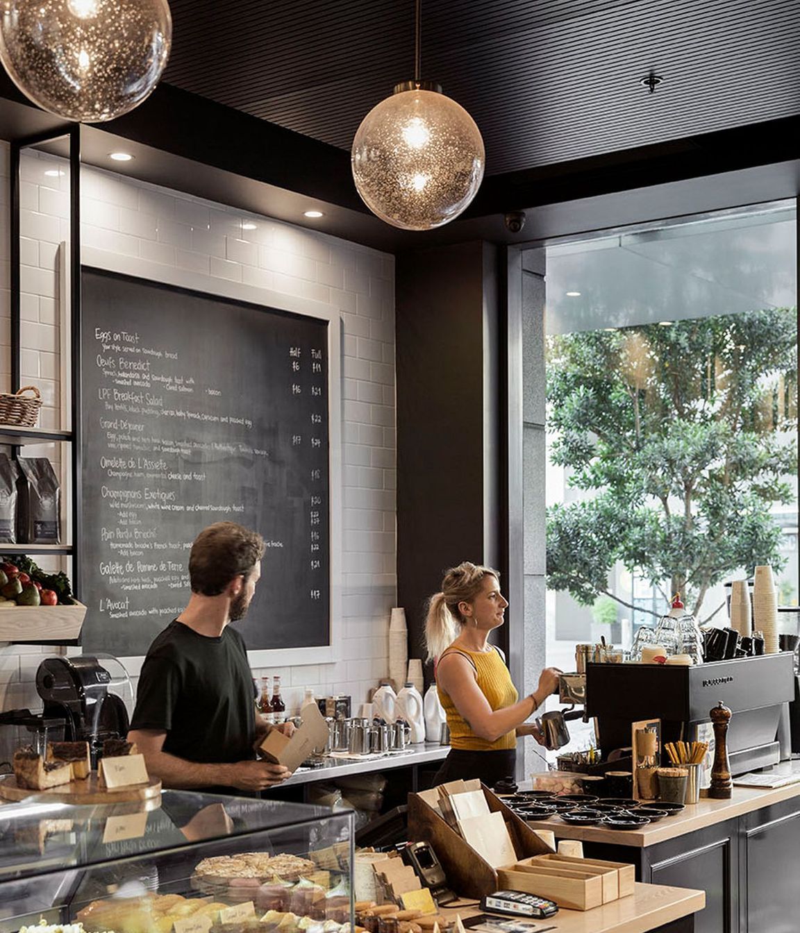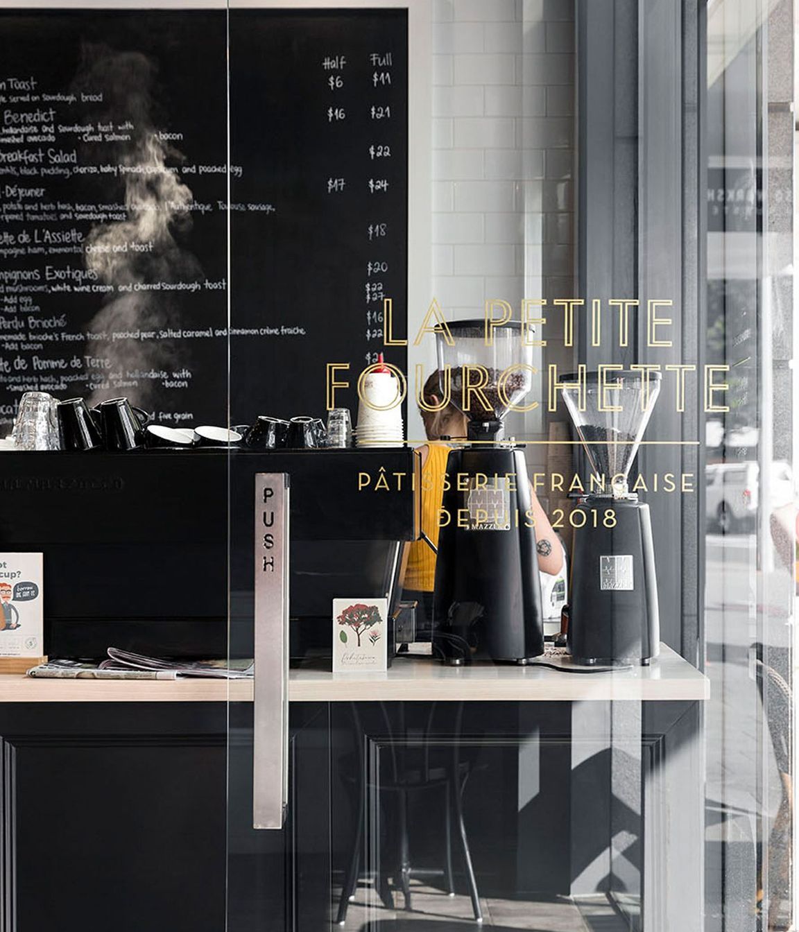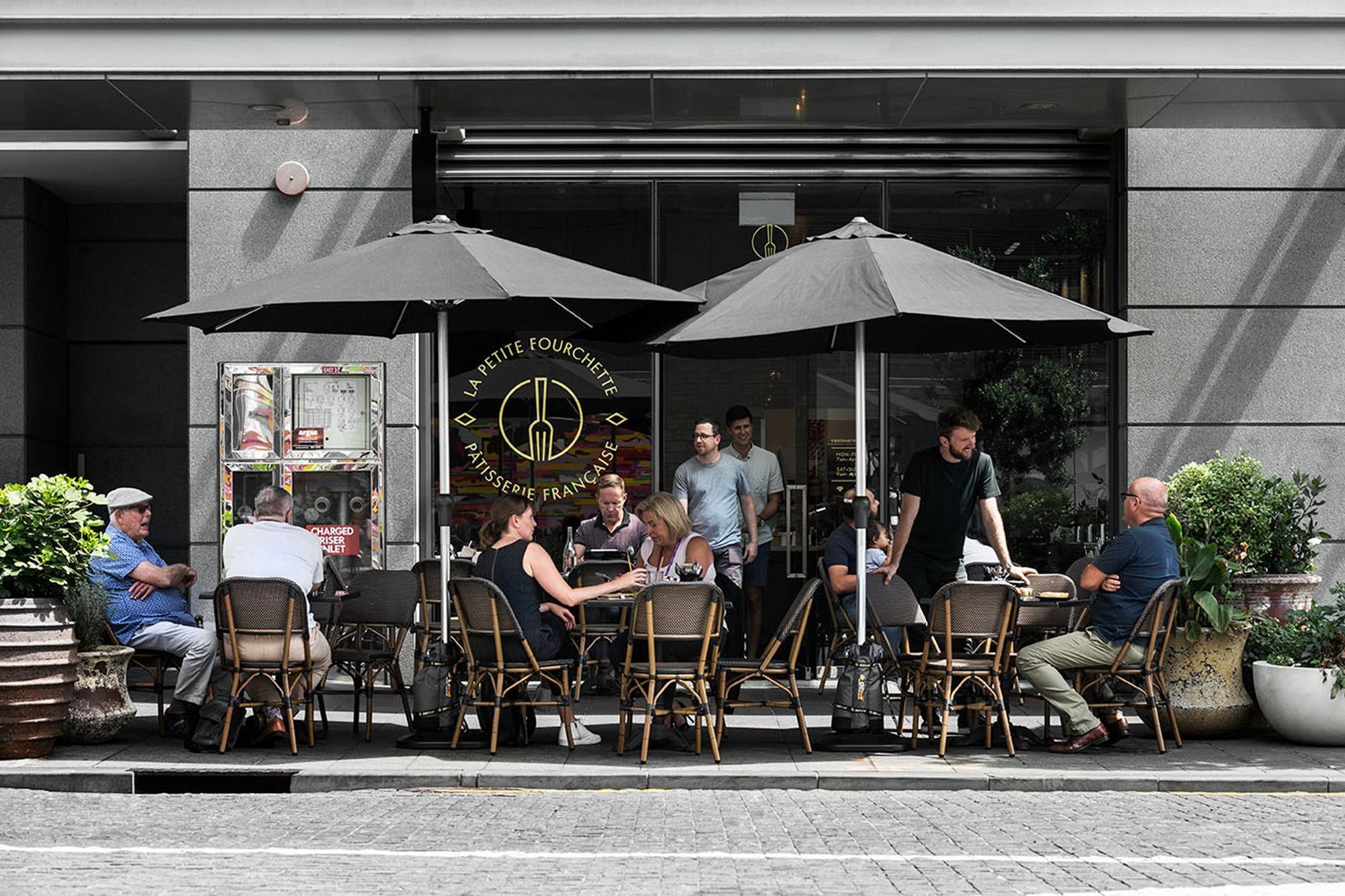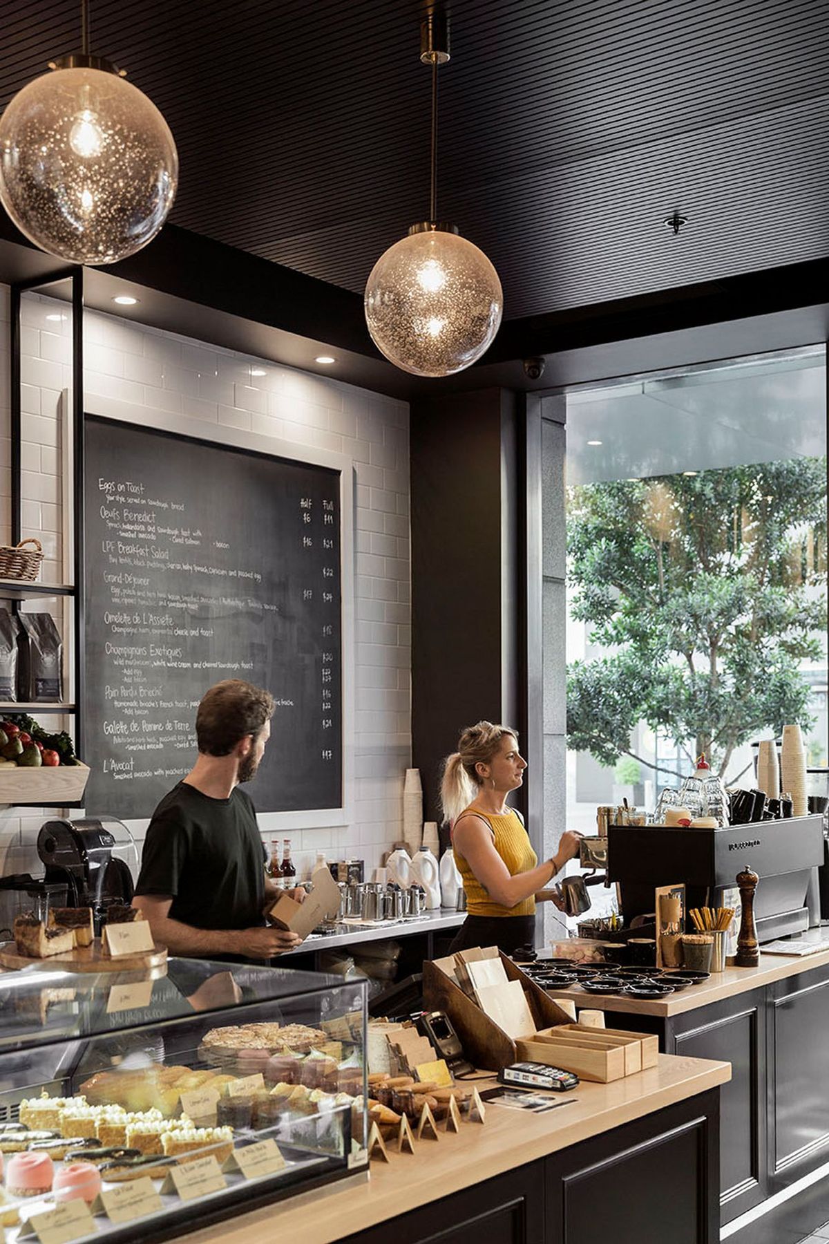 ArchiPro Project Summary - La Petite Fourchette Britomart features a welcoming café environment with expanded dining options, utilizing dark materials to create warmth while showcasing the culinary delights on display.