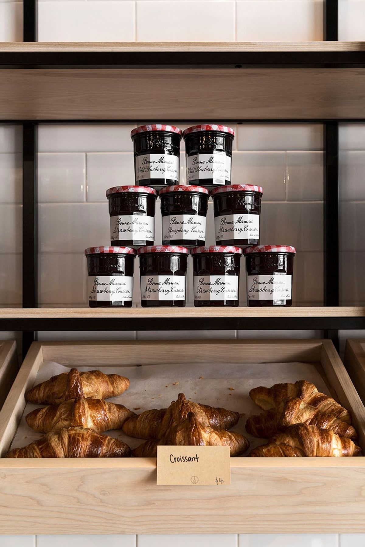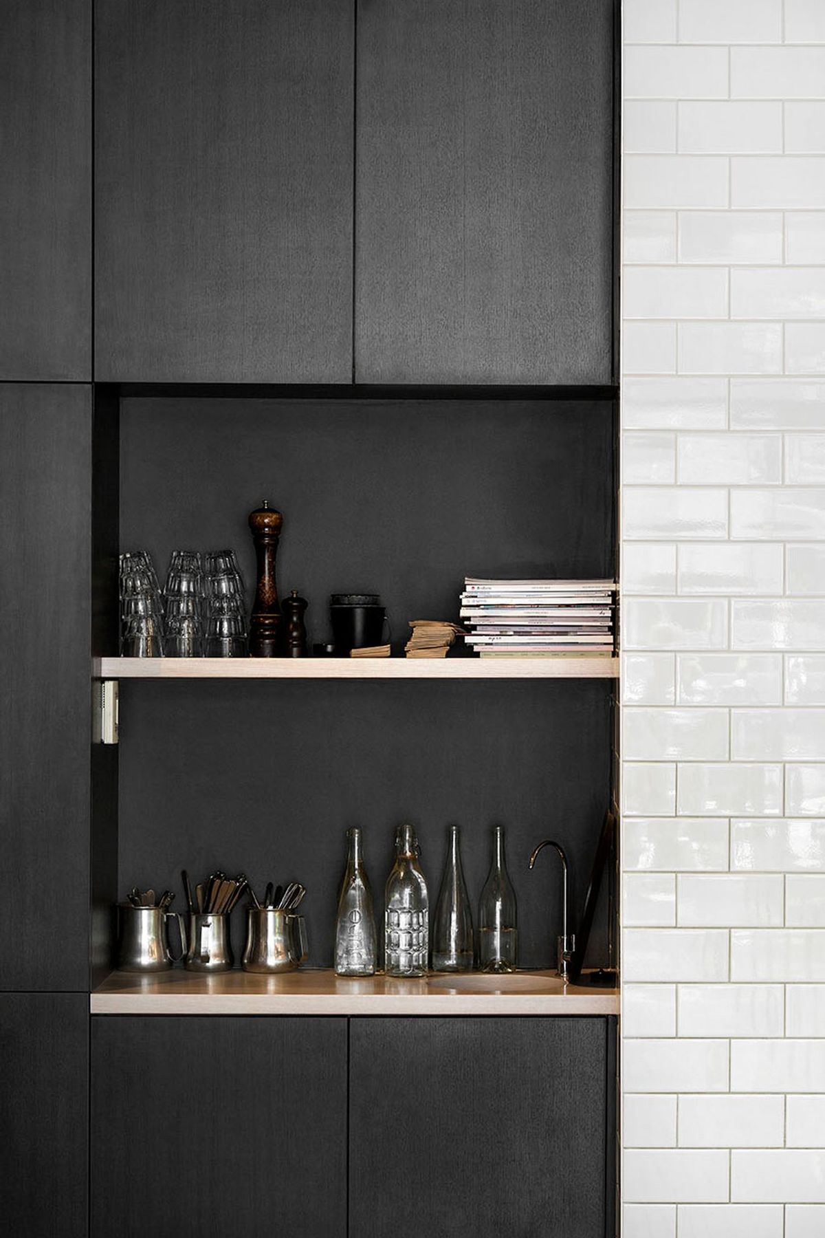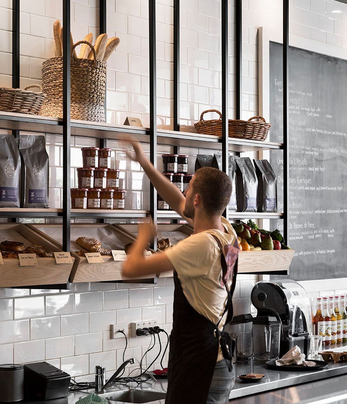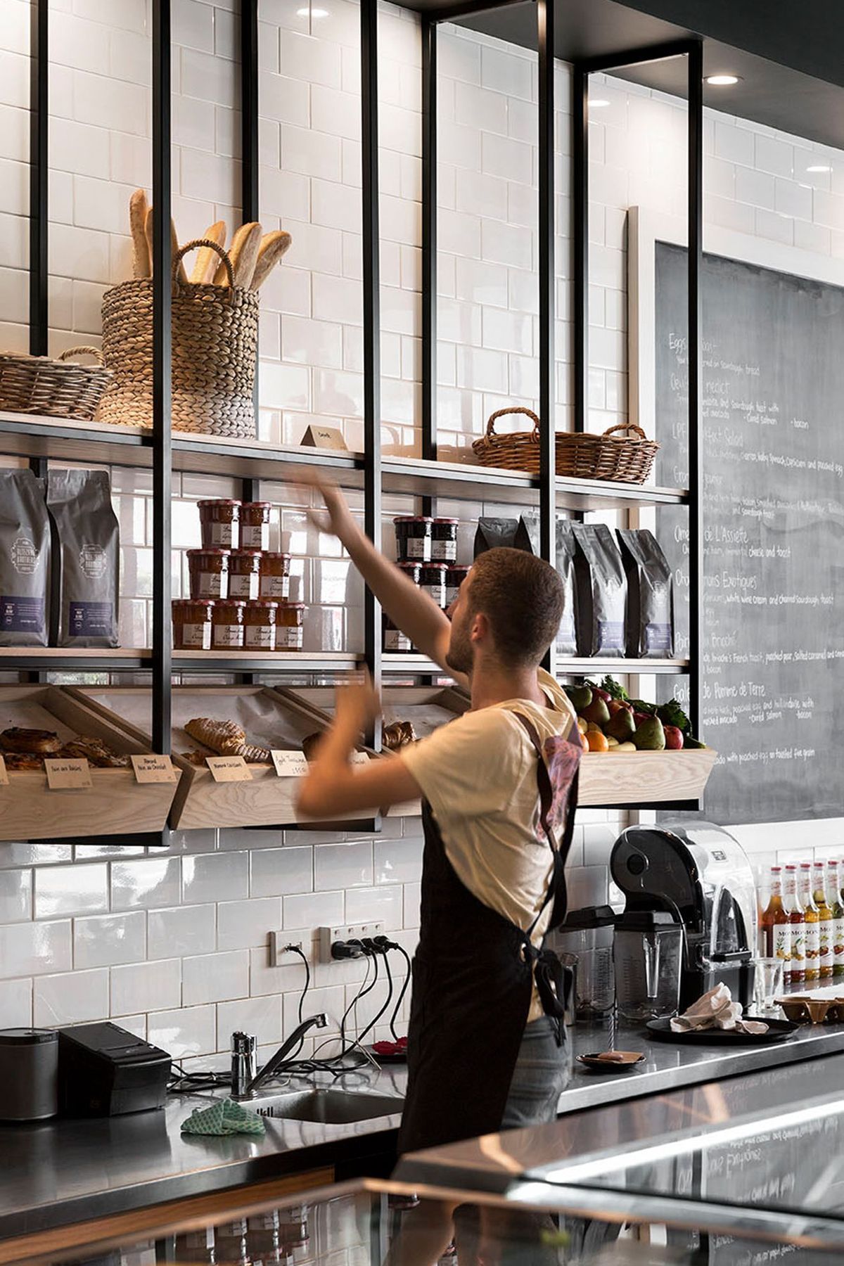 ArchiPro Project Summary - La Petite Fourchette Britomart features a welcoming café environment with expanded dining options, utilizing dark materials to create warmth while showcasing the culinary delights on display.