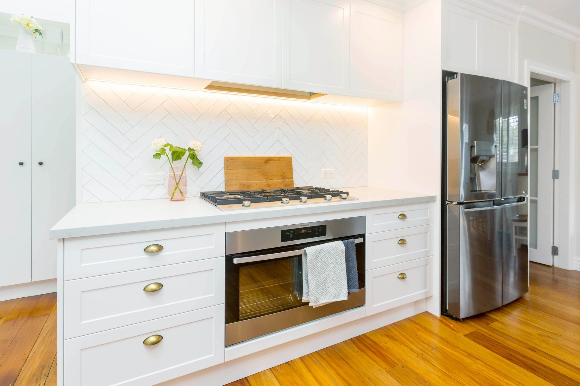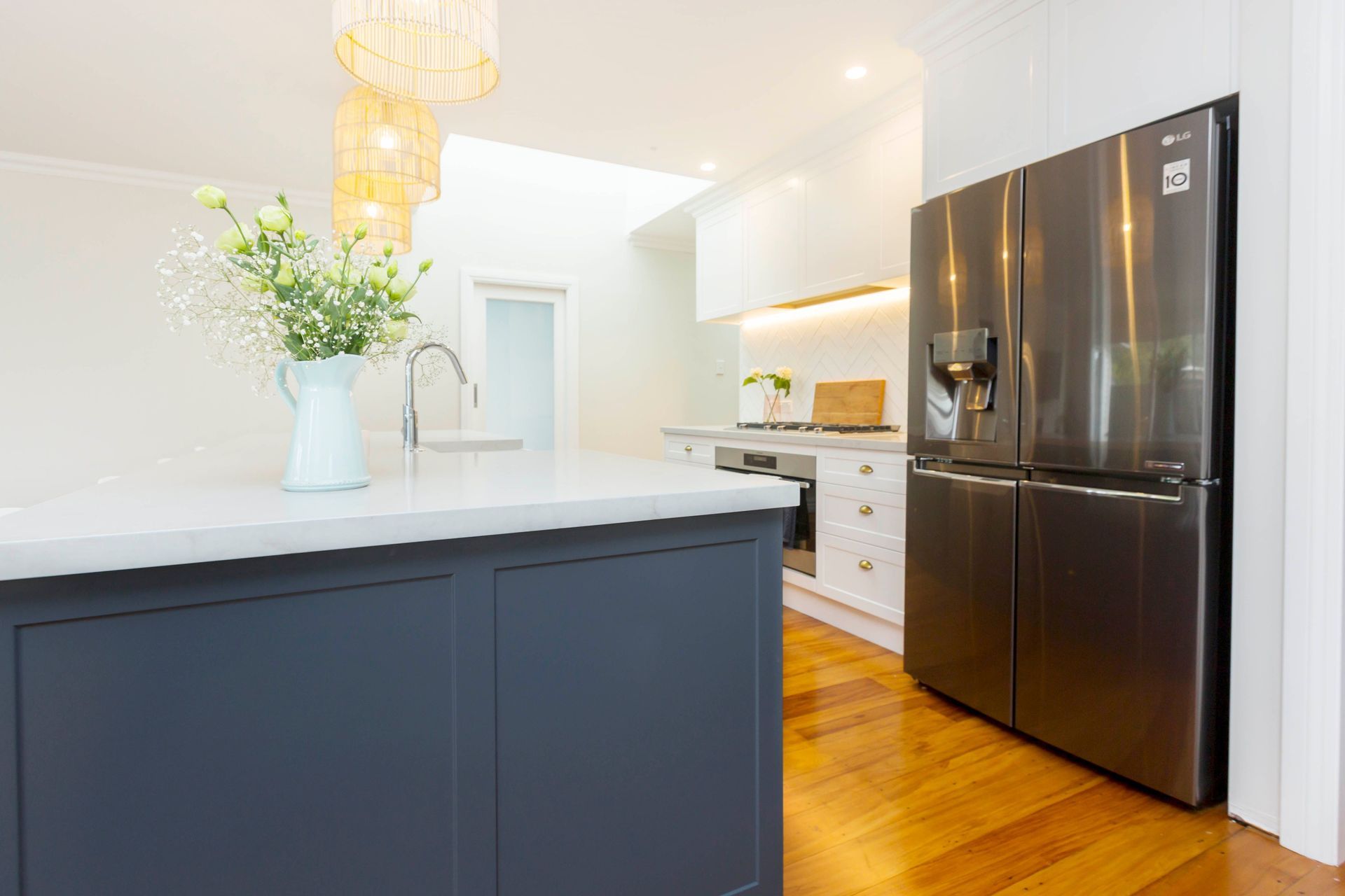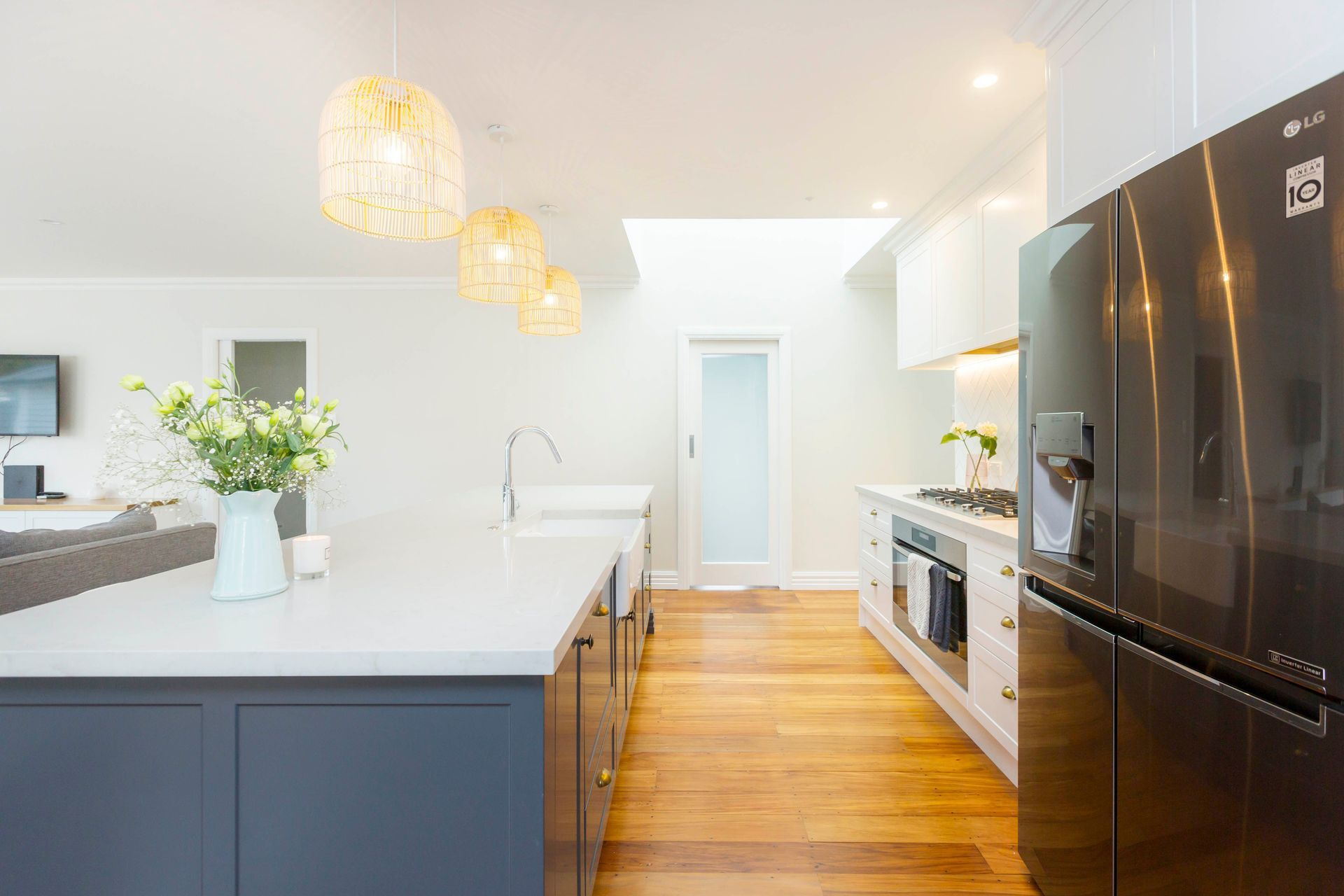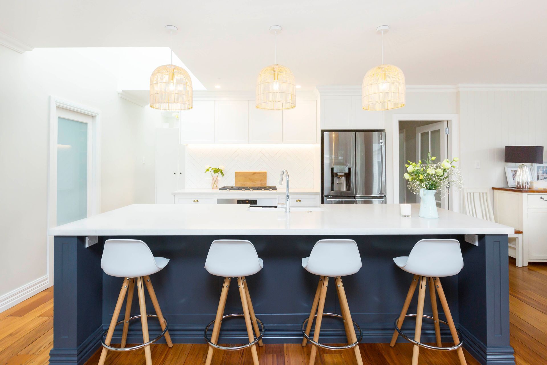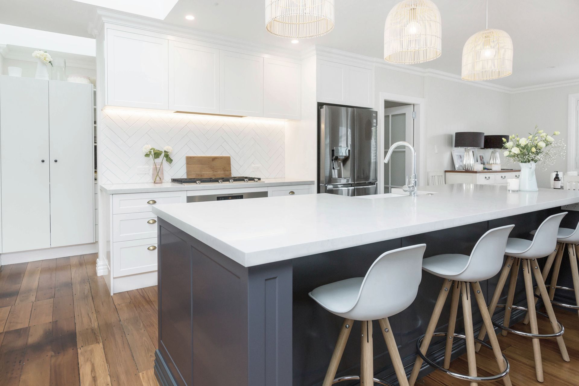 ArchiPro Project Summary - Elegant two-tone lacquer finish featuring Friars Grey island and Alabaster back wall, complemented by shaker style doors with brass handles and a bespoke butler's sink on a mitred London Grey bench, with matching skirting around the island.