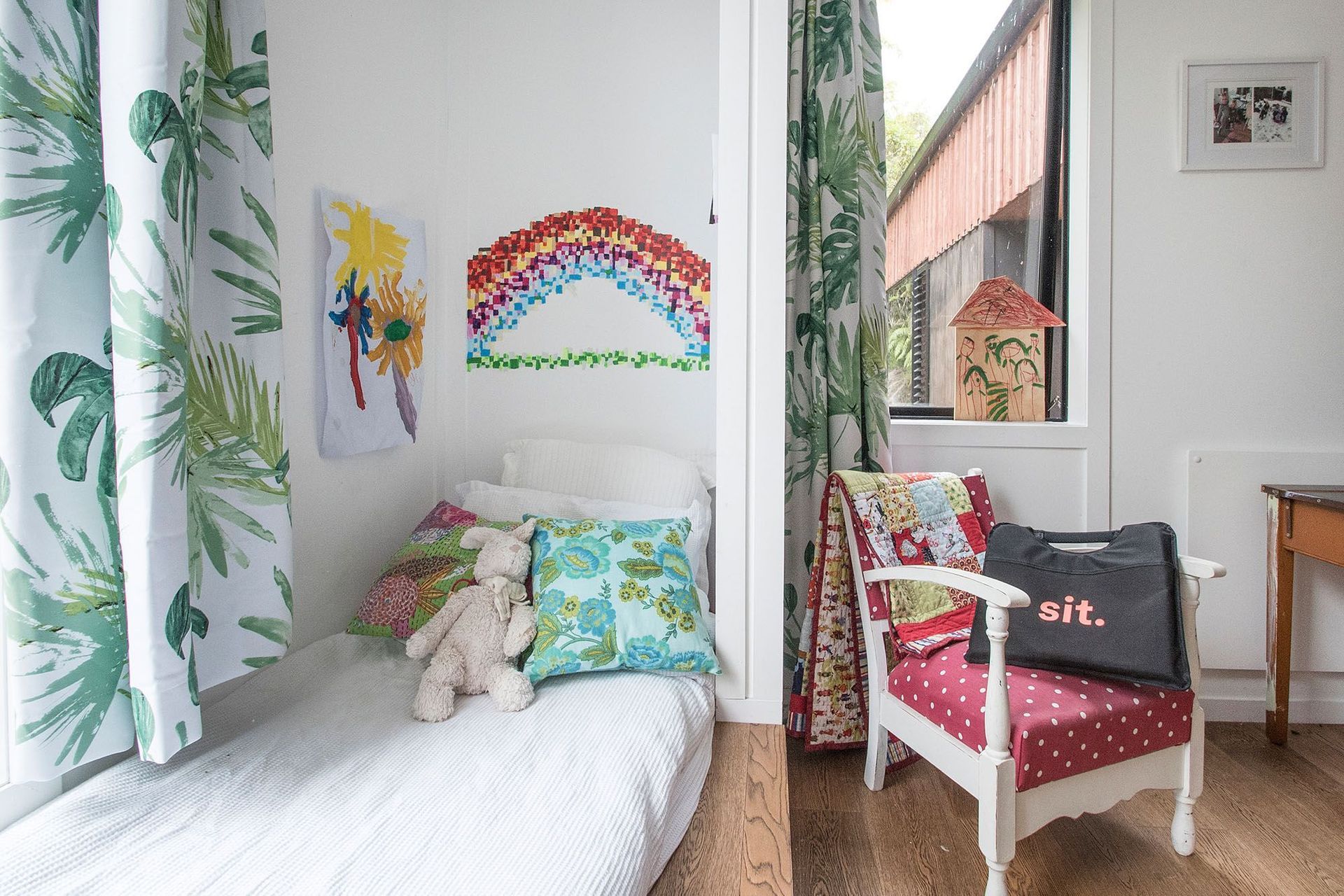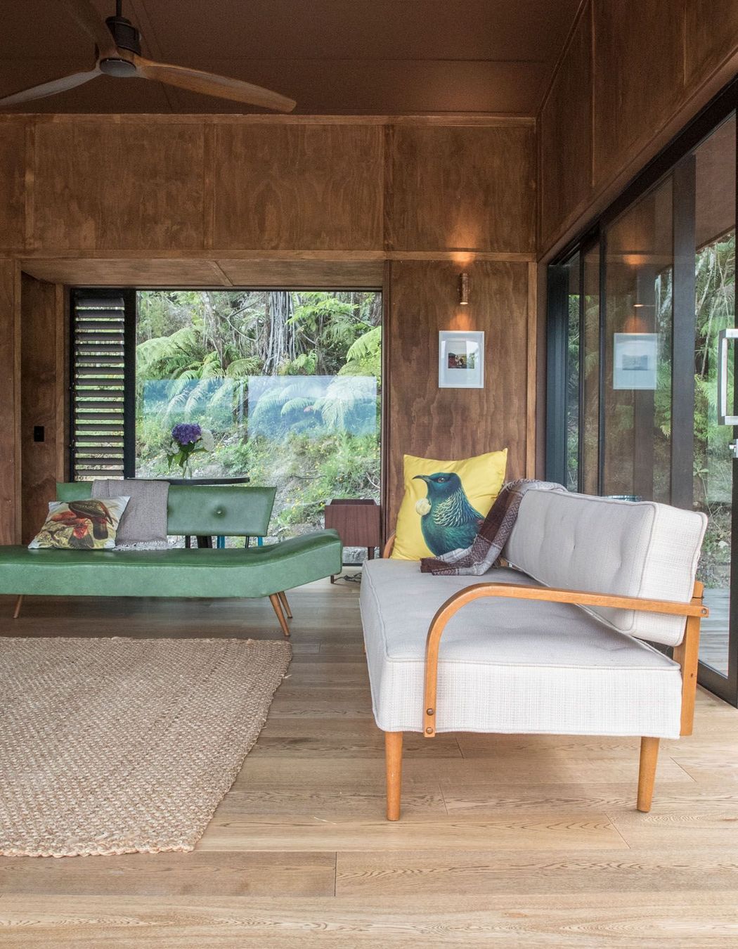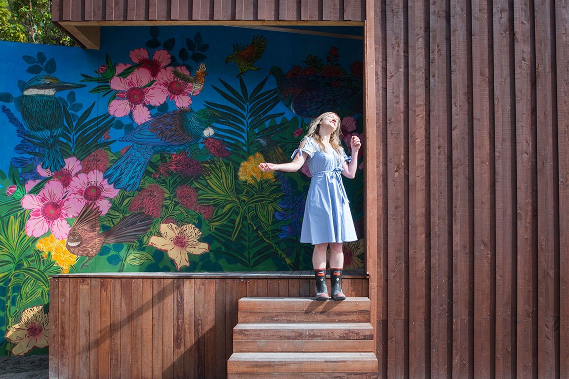ArchiPro Project Summary - Award-winning 105m2 home designed to embody the essence of a bach, featuring 40m2 of decks that seamlessly connect with the natural surroundings, complemented by a striking mural by Flox at the concealed entry.
