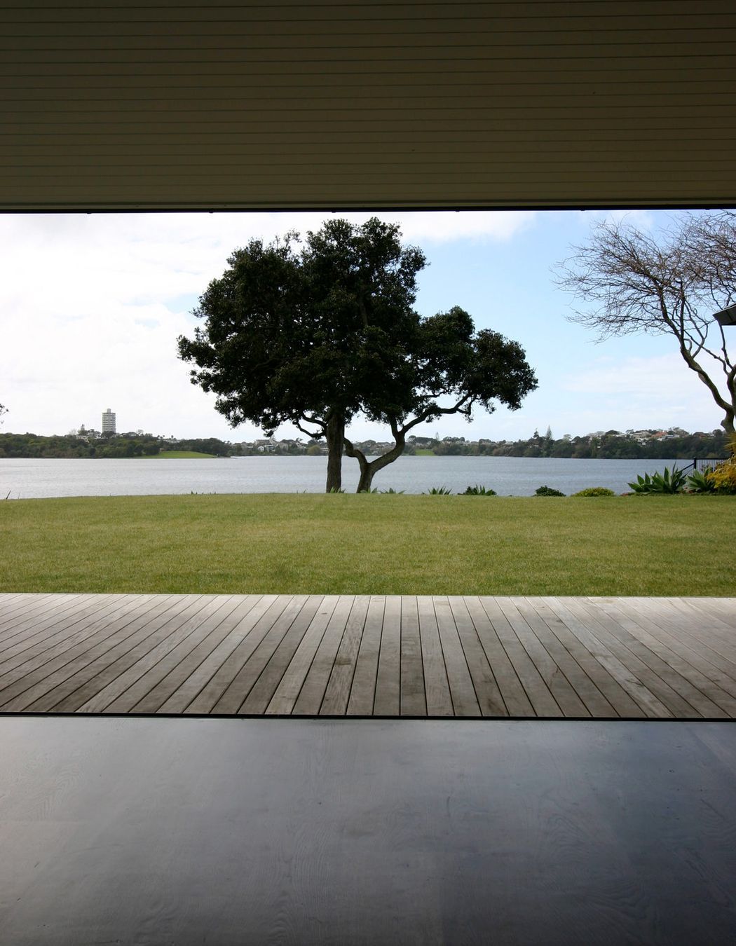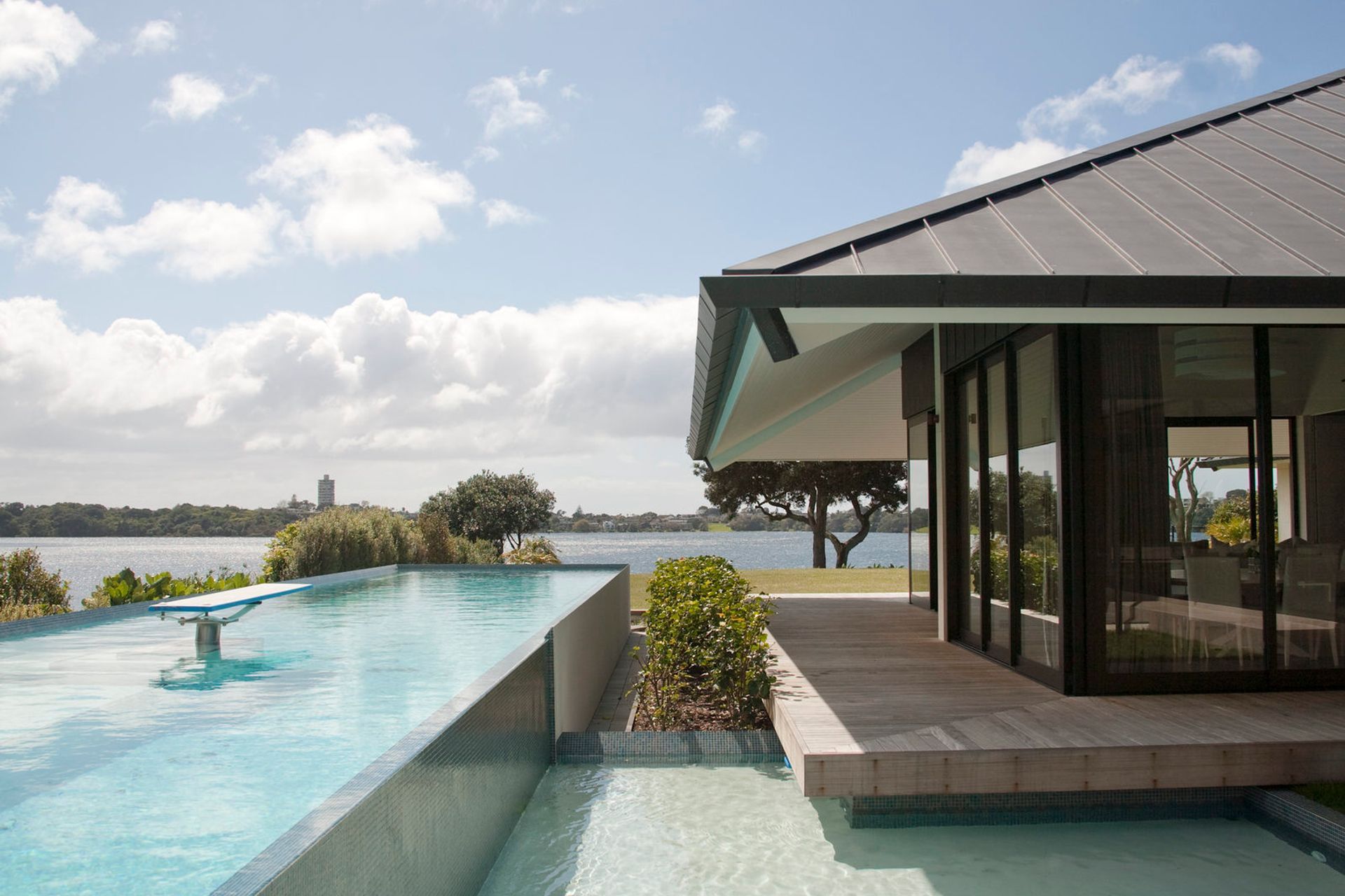 ArchiPro Project Summary - Two elegantly designed pavilions connected by a kitchen causeway, featuring expansive roof forms and a pool courtyard, offering stunning views of an extinct volcano cone lake in Takapuna, Auckland.