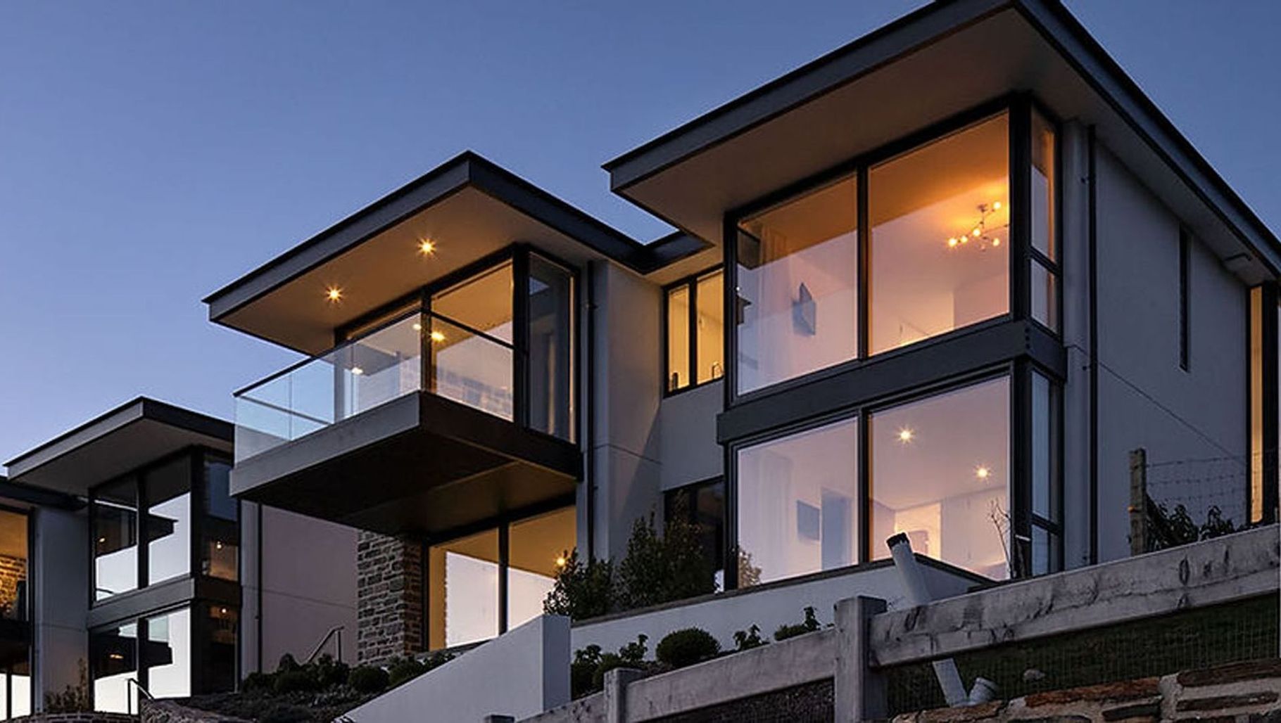 ArchiPro Project Summary - Contemporary dwellings featuring Otago Schist stonework, strategically designed for visual privacy and expansive glazing, set against the stunning backdrop of Wanaka Marina and Yacht Club.