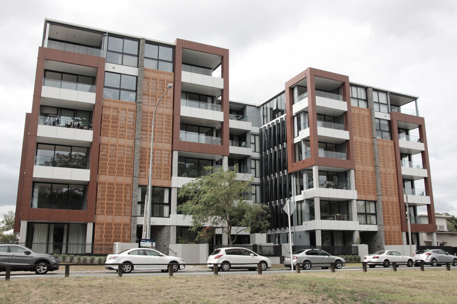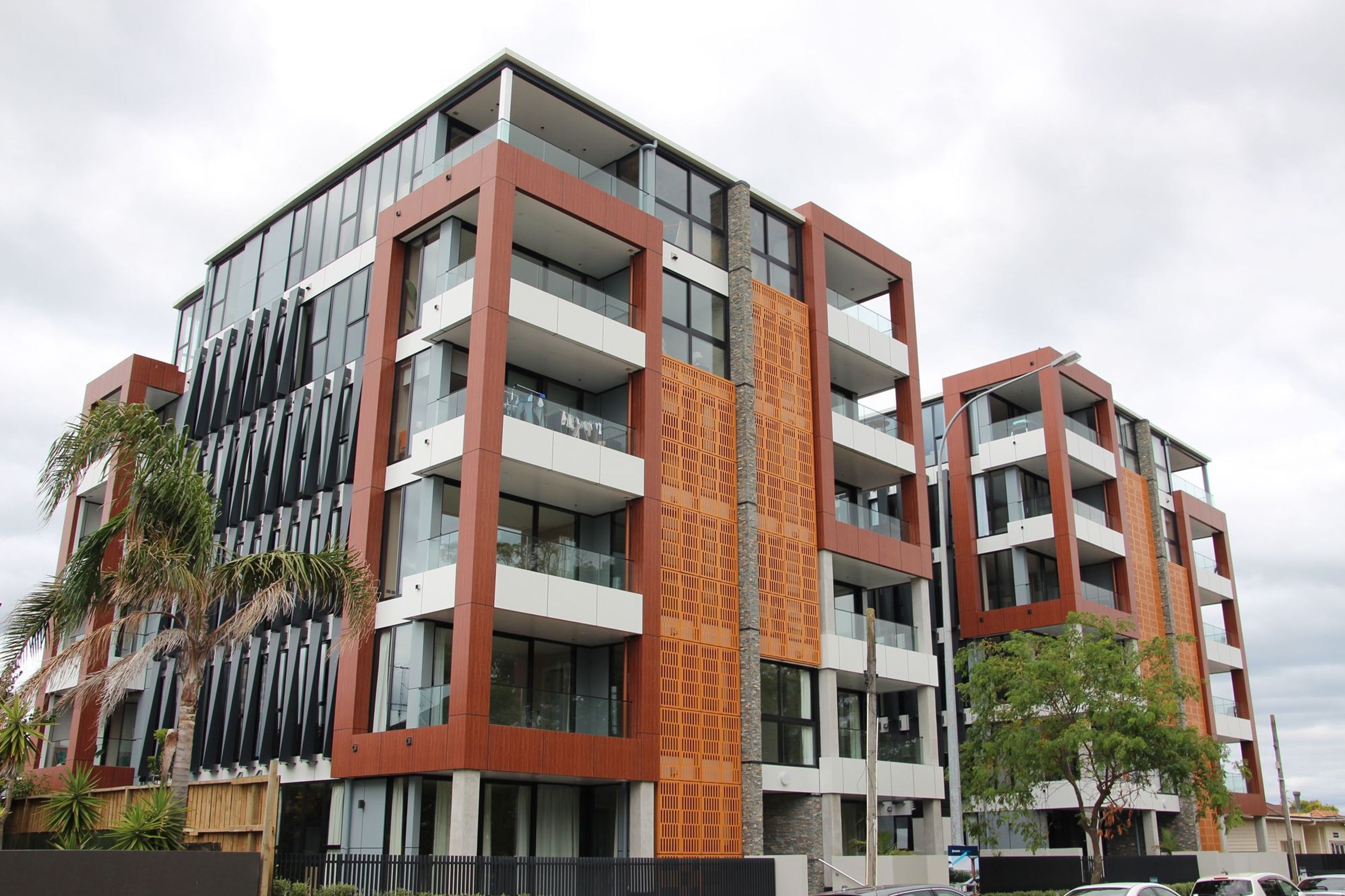ArchiPro Project Summary - Iconic Lakeview Apartments in Takapuna featuring Indurabond G2 non-combustible cladding and a striking teak woodgrain finish, showcasing innovative architectural design.
