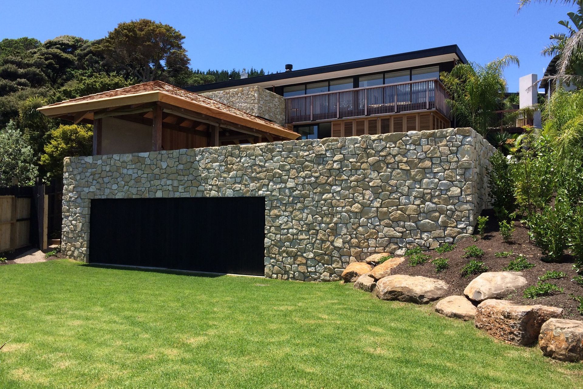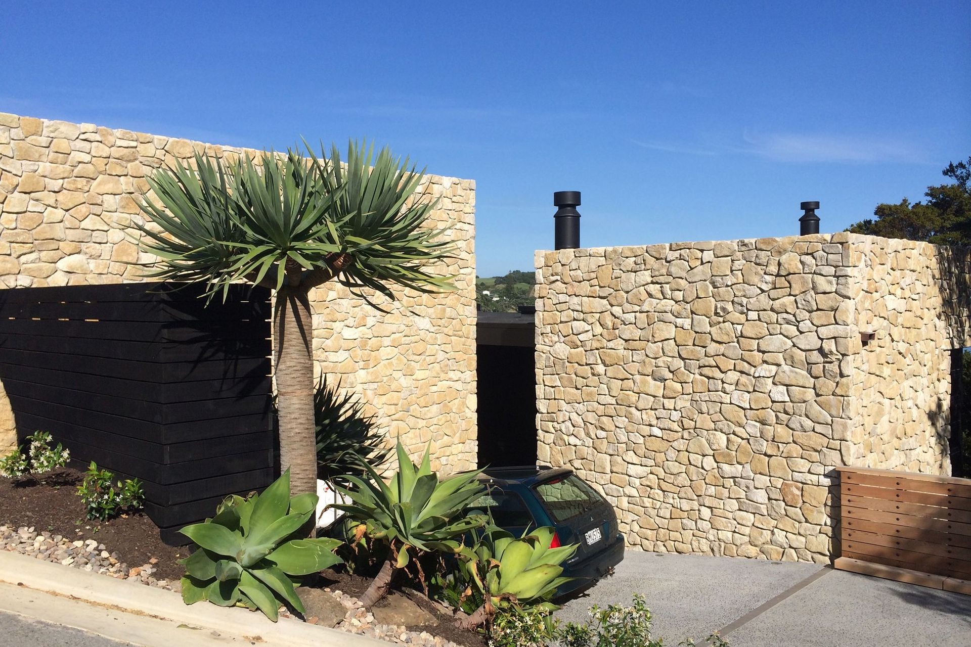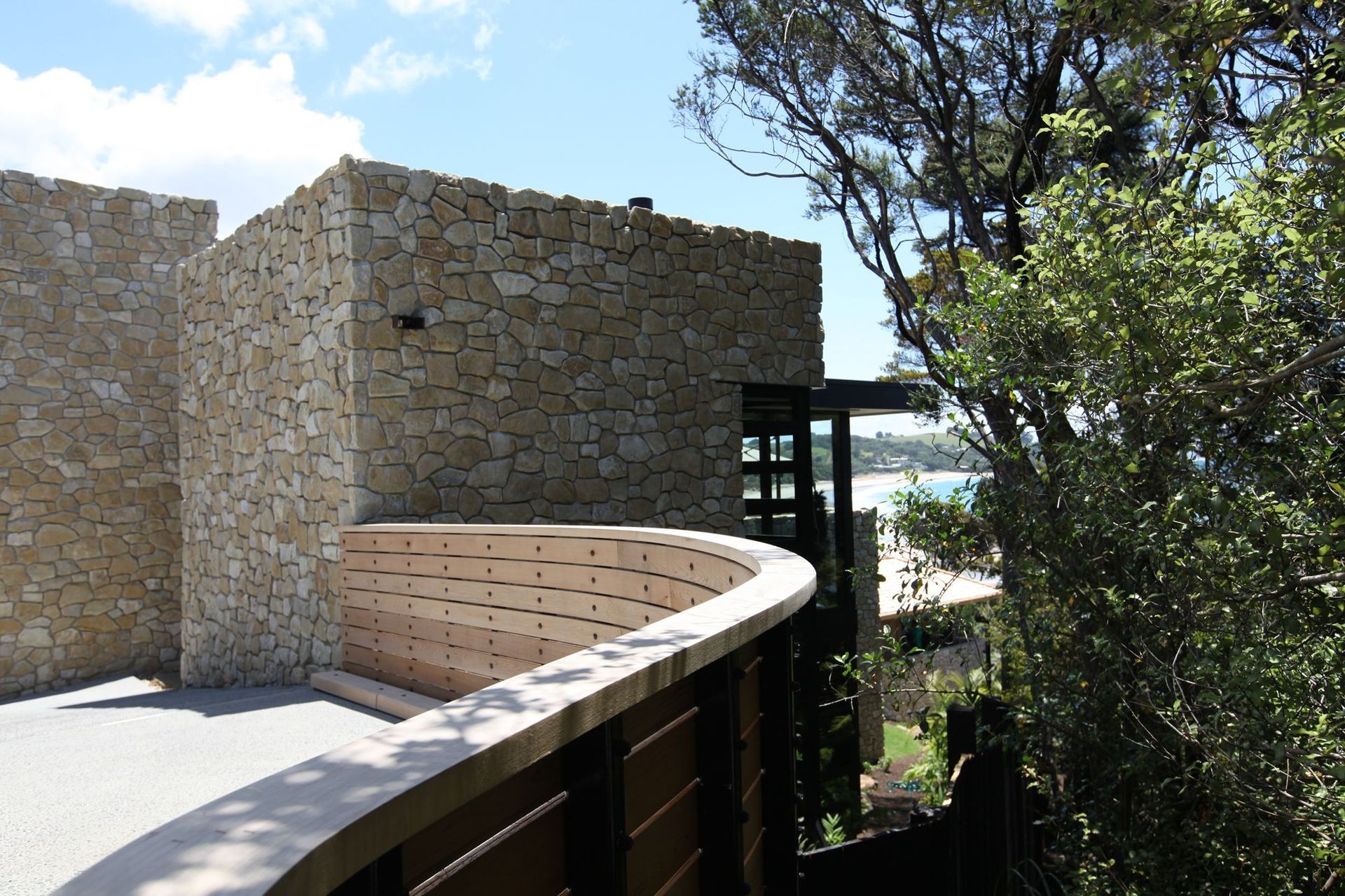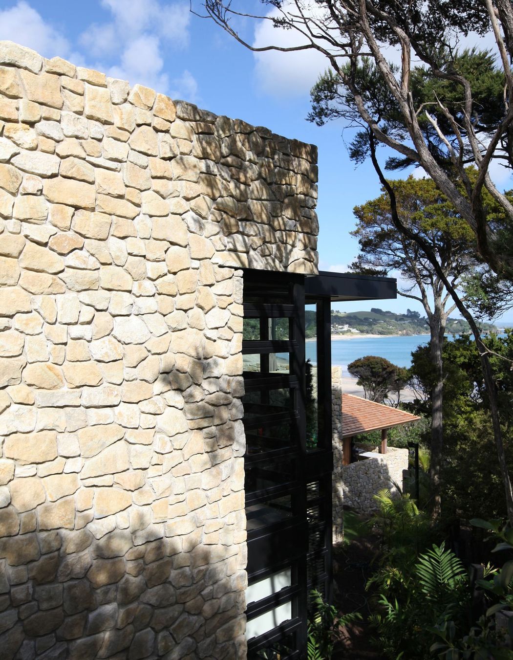 ArchiPro Project Summary - Te Kuiti Limestone cladding project at Langs Beach, featuring lightweight, warm-toned stone with an organic look, achieved through a collaborative approach with architects and builders, resulting in a stunning dry-stack finish that exceeded expectations.