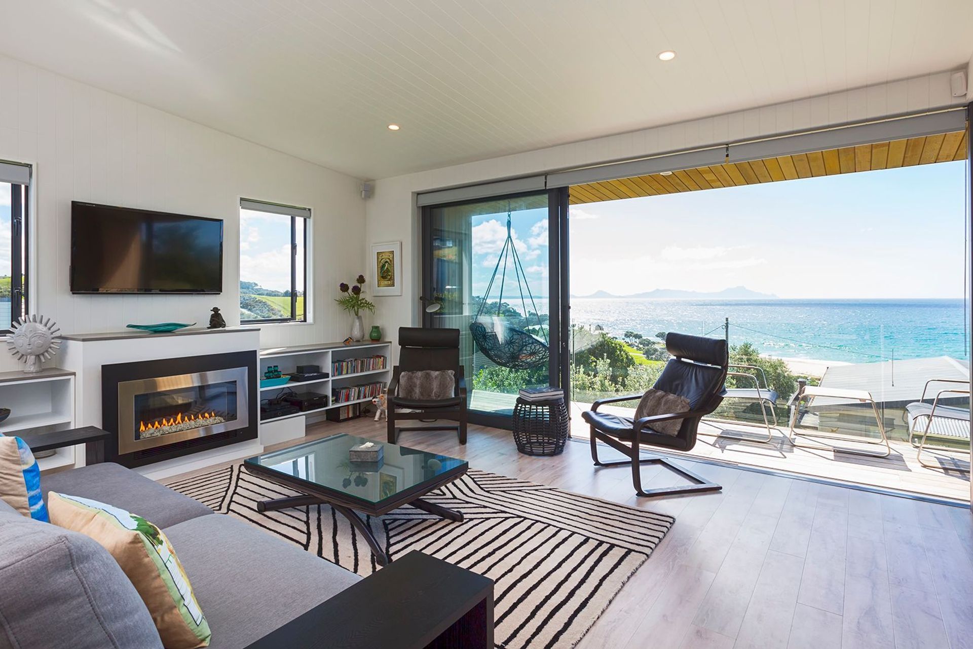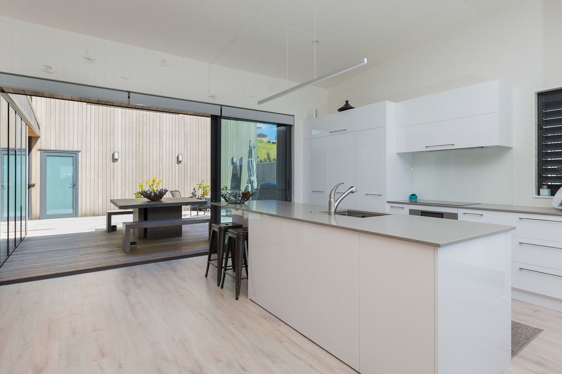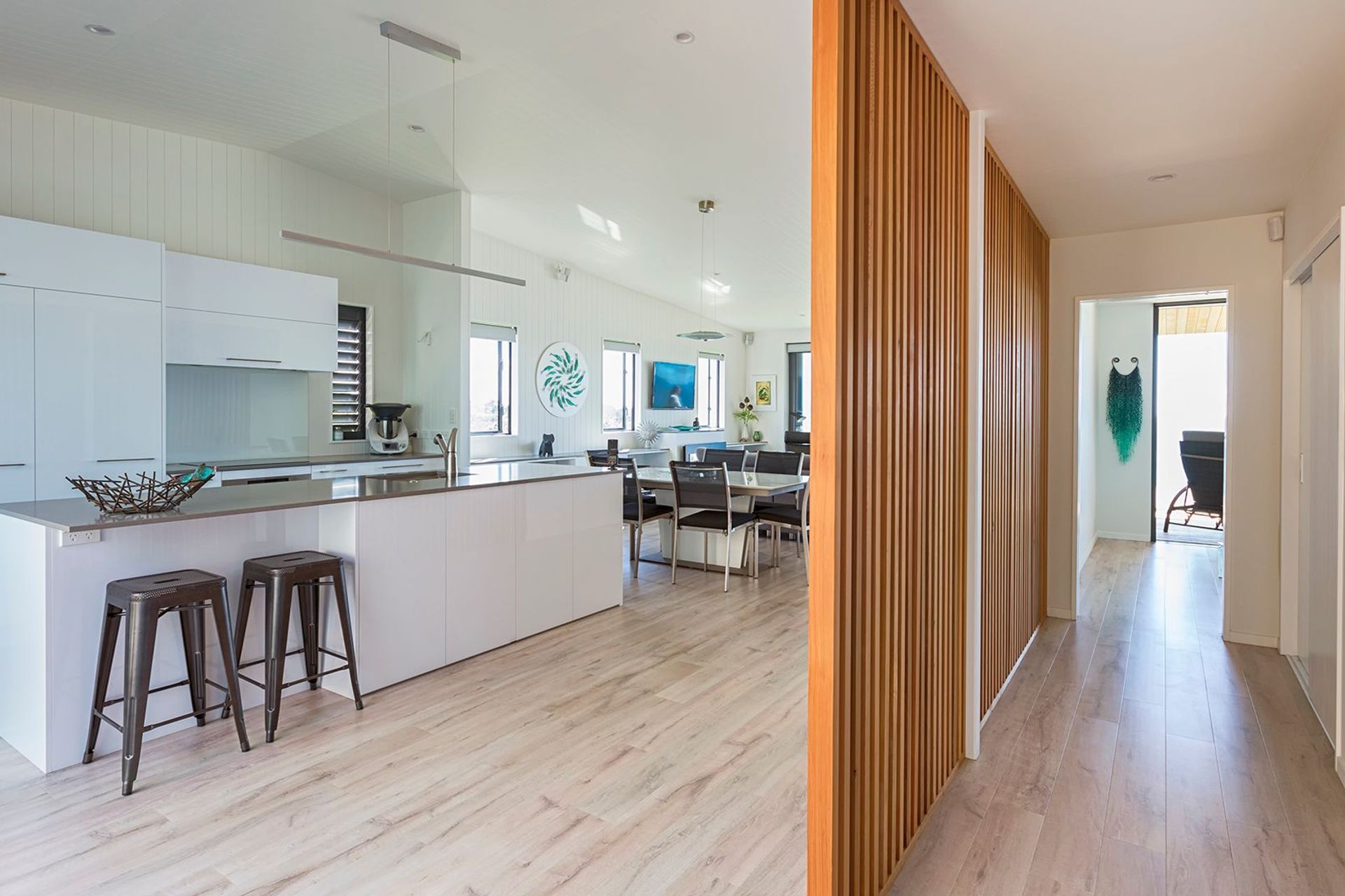 ArchiPro Project Summary - A modern sun-filled home in Mangawhai, featuring expansive decks, stunning sea views, and a seamless flow between indoor and outdoor spaces, designed by architect Richie Pearce.