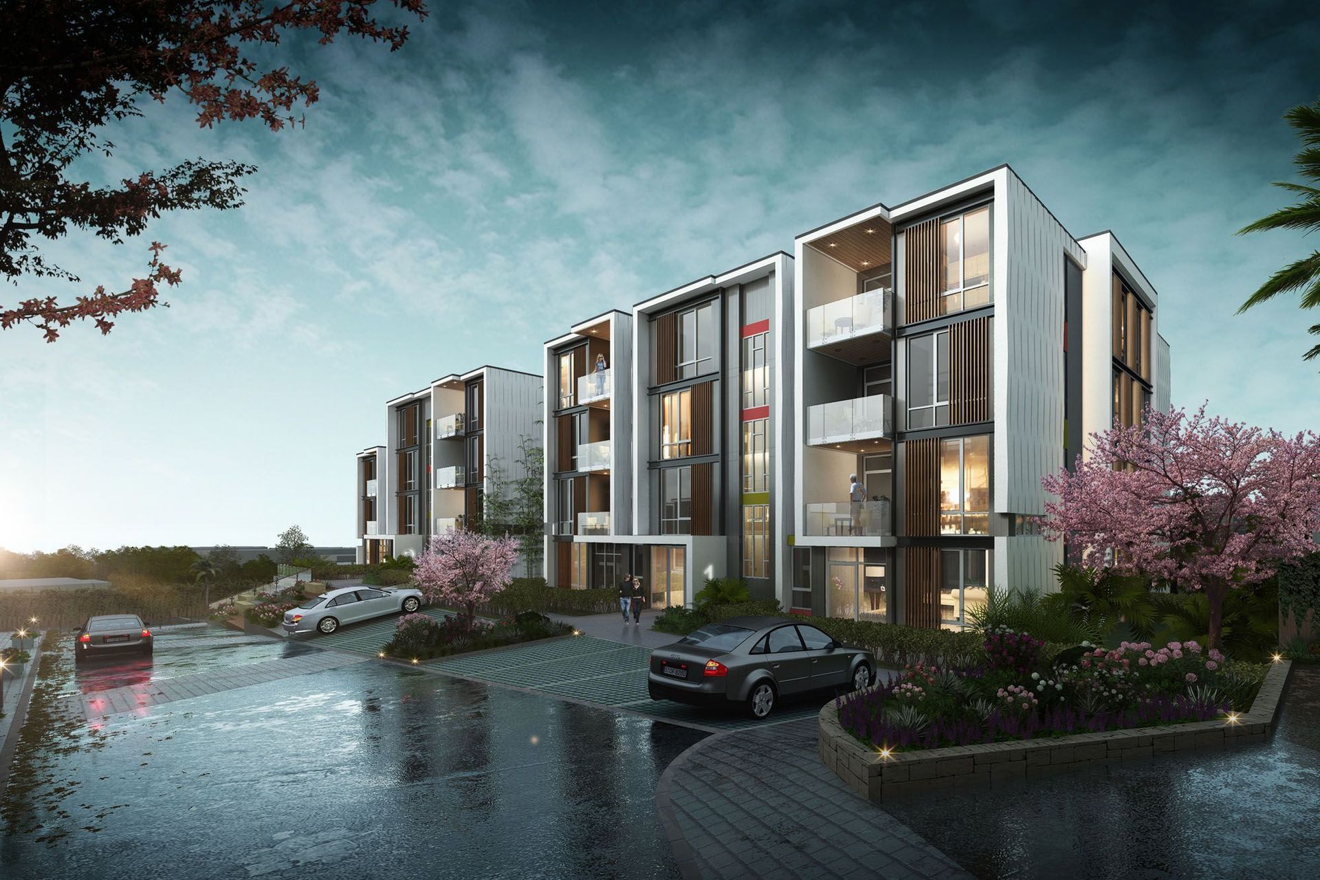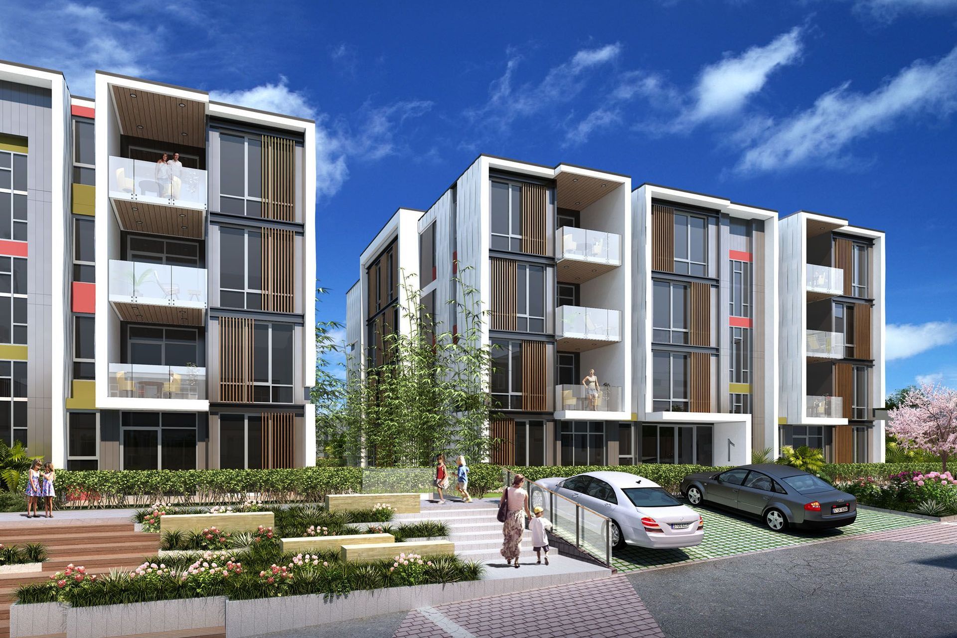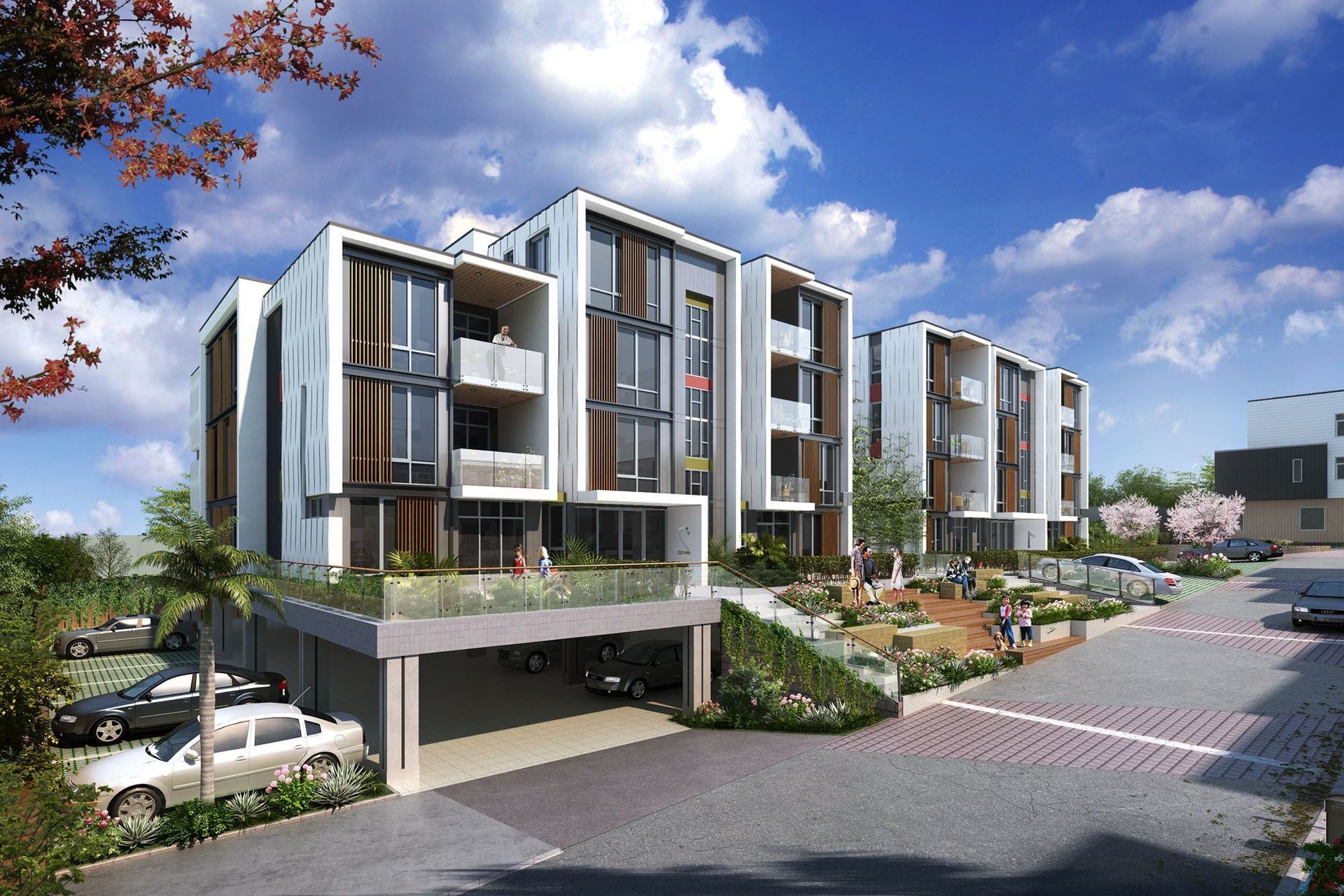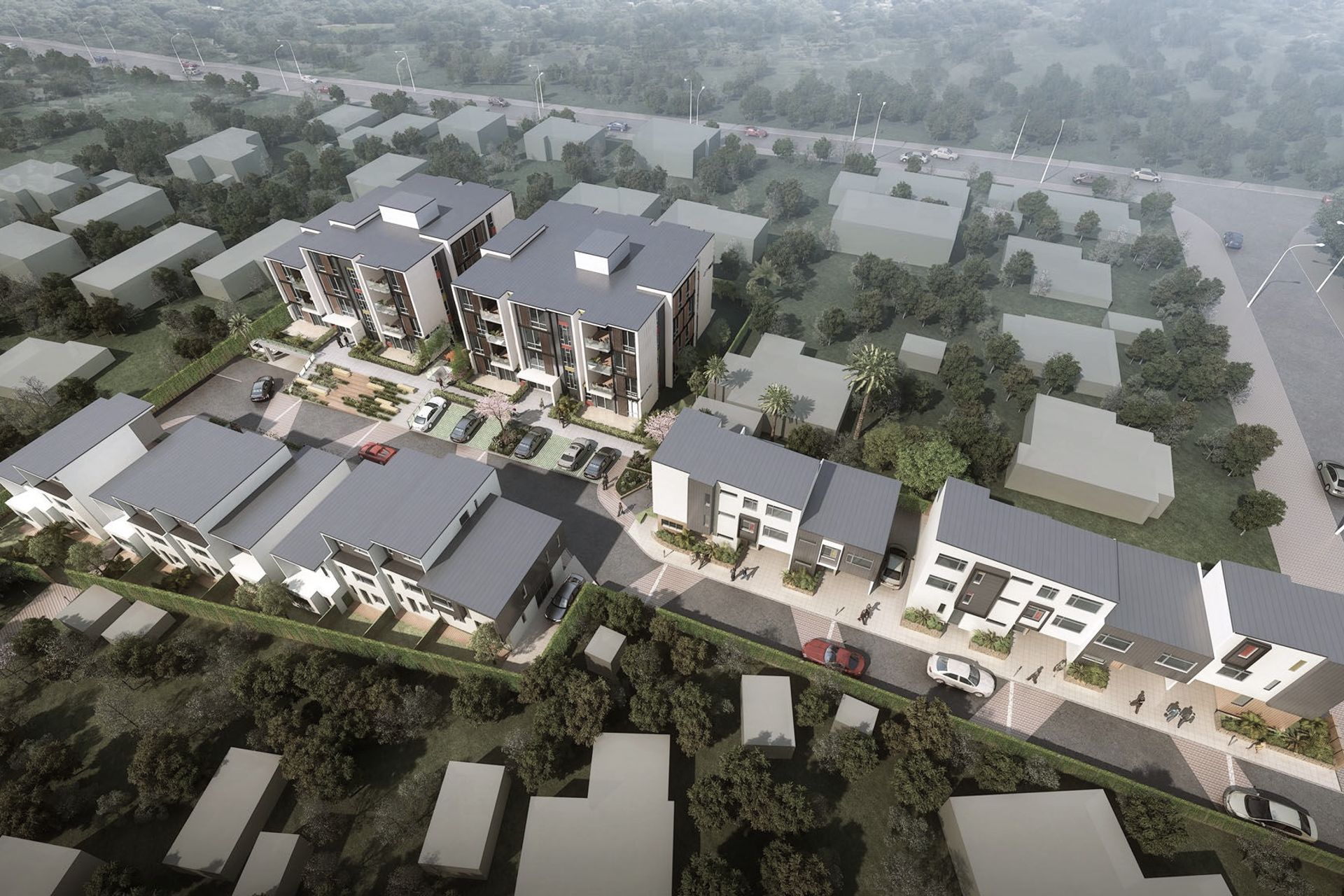 ArchiPro Project Summary - Larchwood Development: A residential project in Avondale featuring 61 units, including two four-level apartment buildings and five terrace housing blocks, with Stage 1 currently under construction.