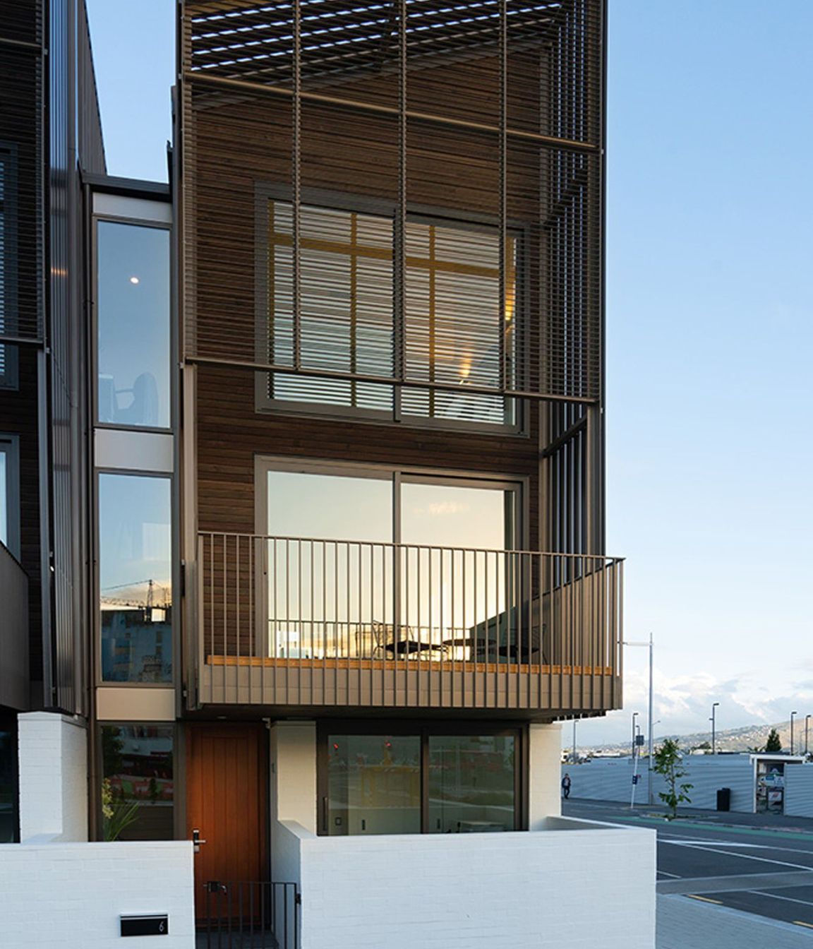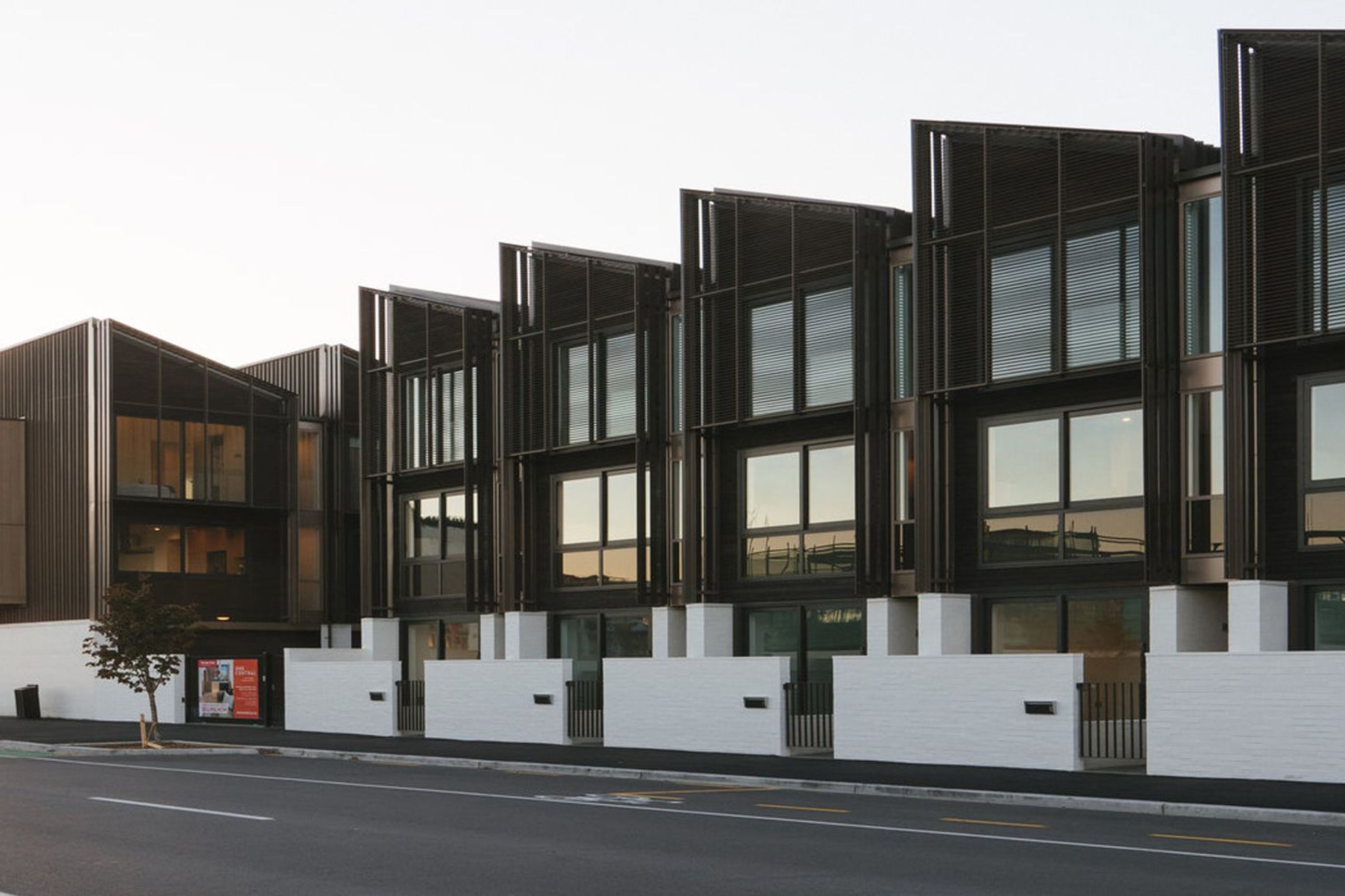 ArchiPro Project Summary - Latimer Terraces: A modern collection of architecturally-designed terrace homes in Christchurch, featuring three-storey layouts, high-quality materials, and a Homestar 6 rating for sustainable living.