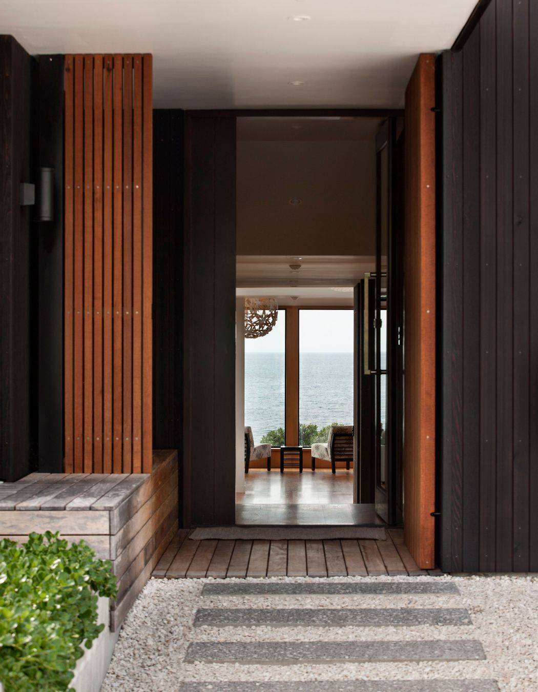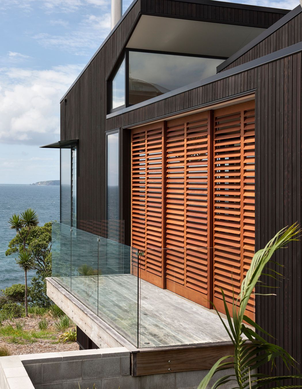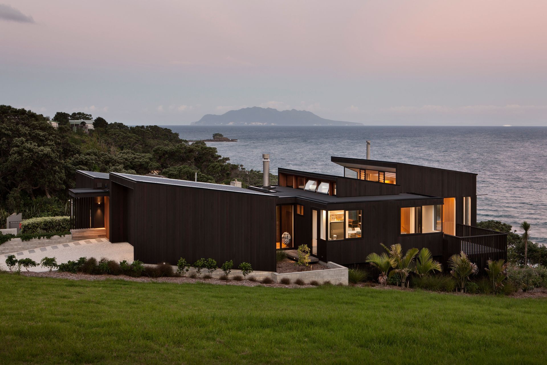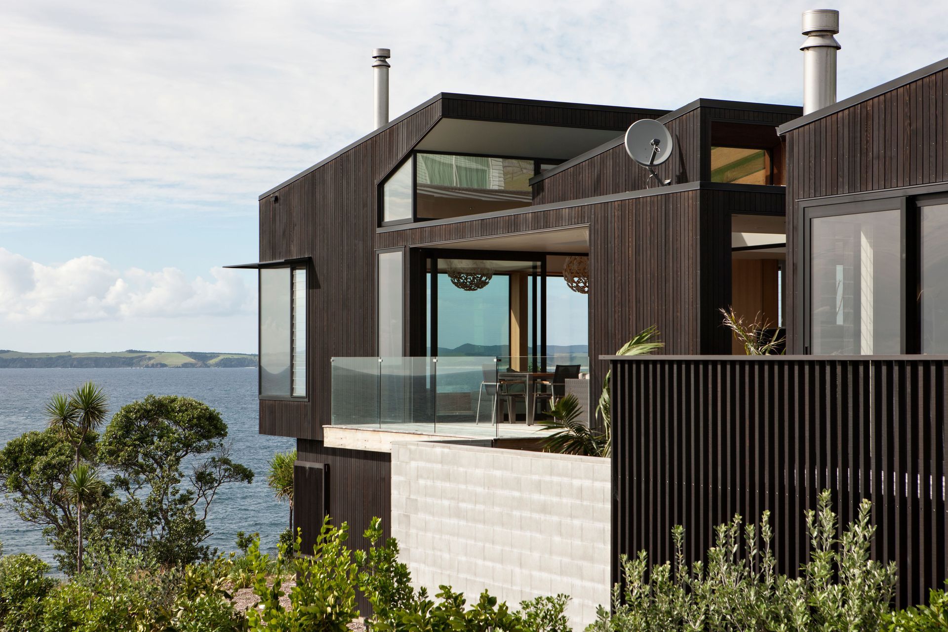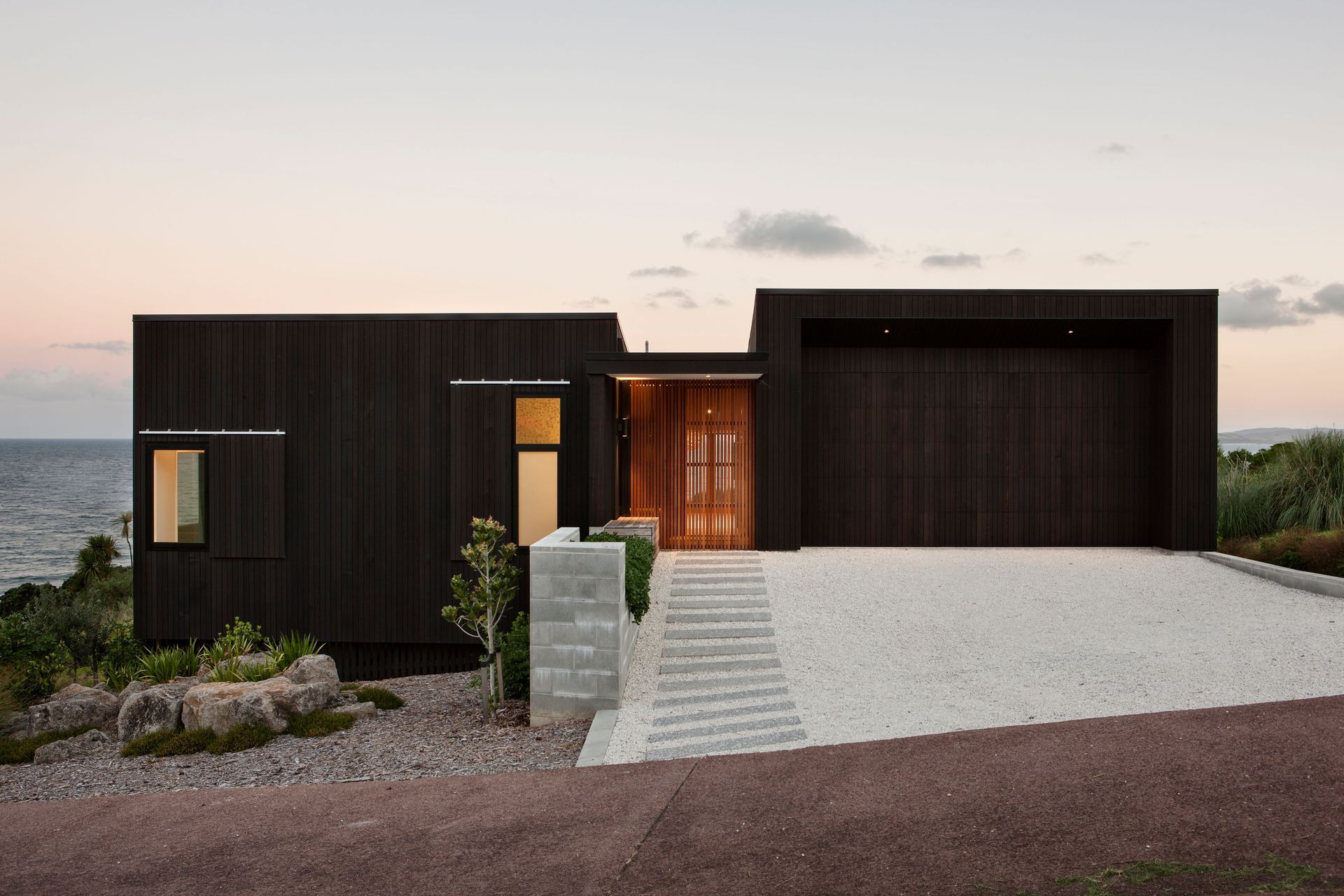 ArchiPro Project Summary - A beautifully designed bach that stretches from roadside to cliff edge, offering a seamless journey through the home with stunning views, complemented by lush landscaped areas and contrasting dark timber cladding.