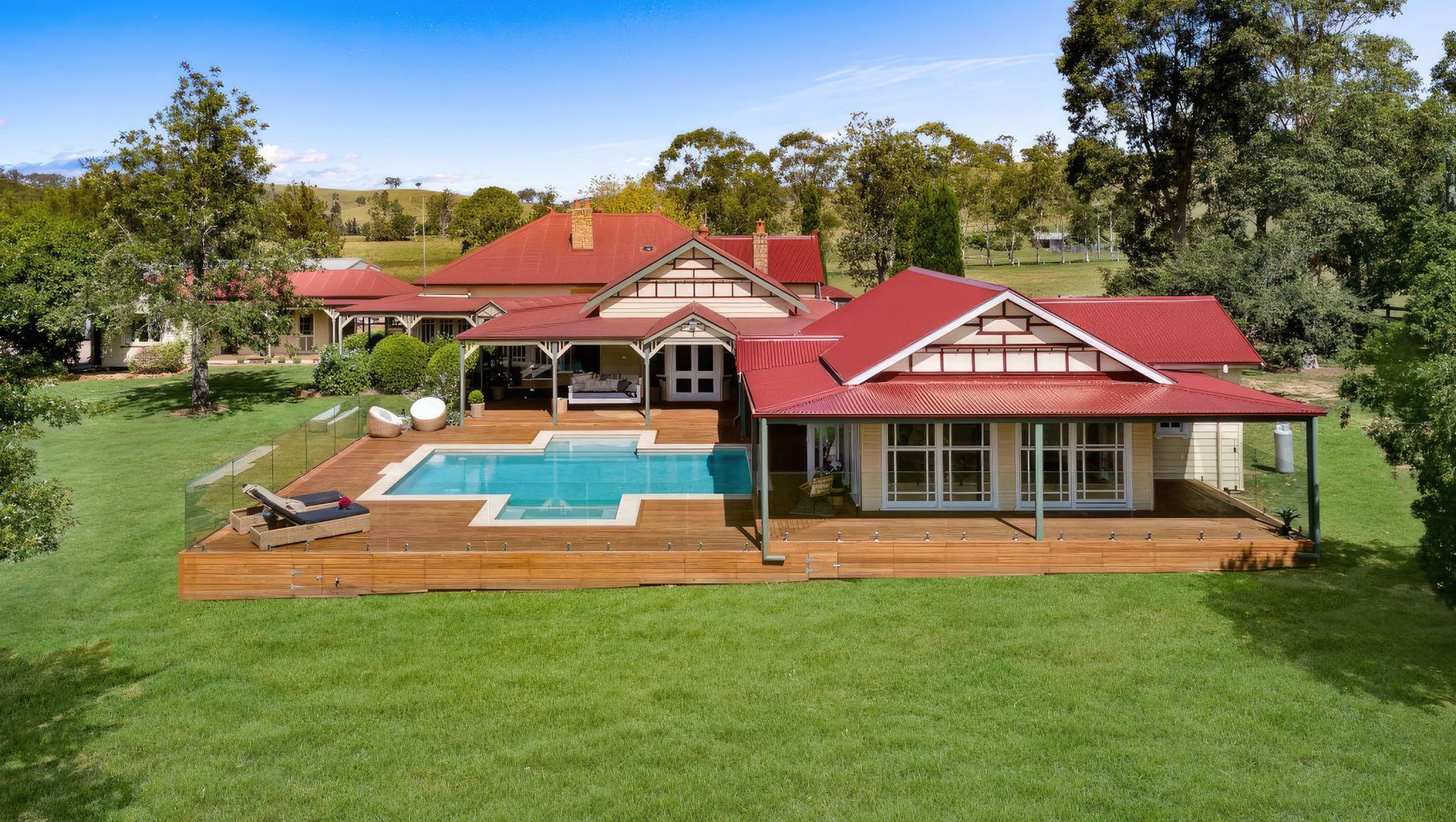 ArchiPro Project Summary - Stunning Lewinsbrook project featuring the luxurious FI50 Aqua blue, beautifully complemented by a wooden deck and lush green grass, showcasing exceptional craftsmanship by Coastline Pools.