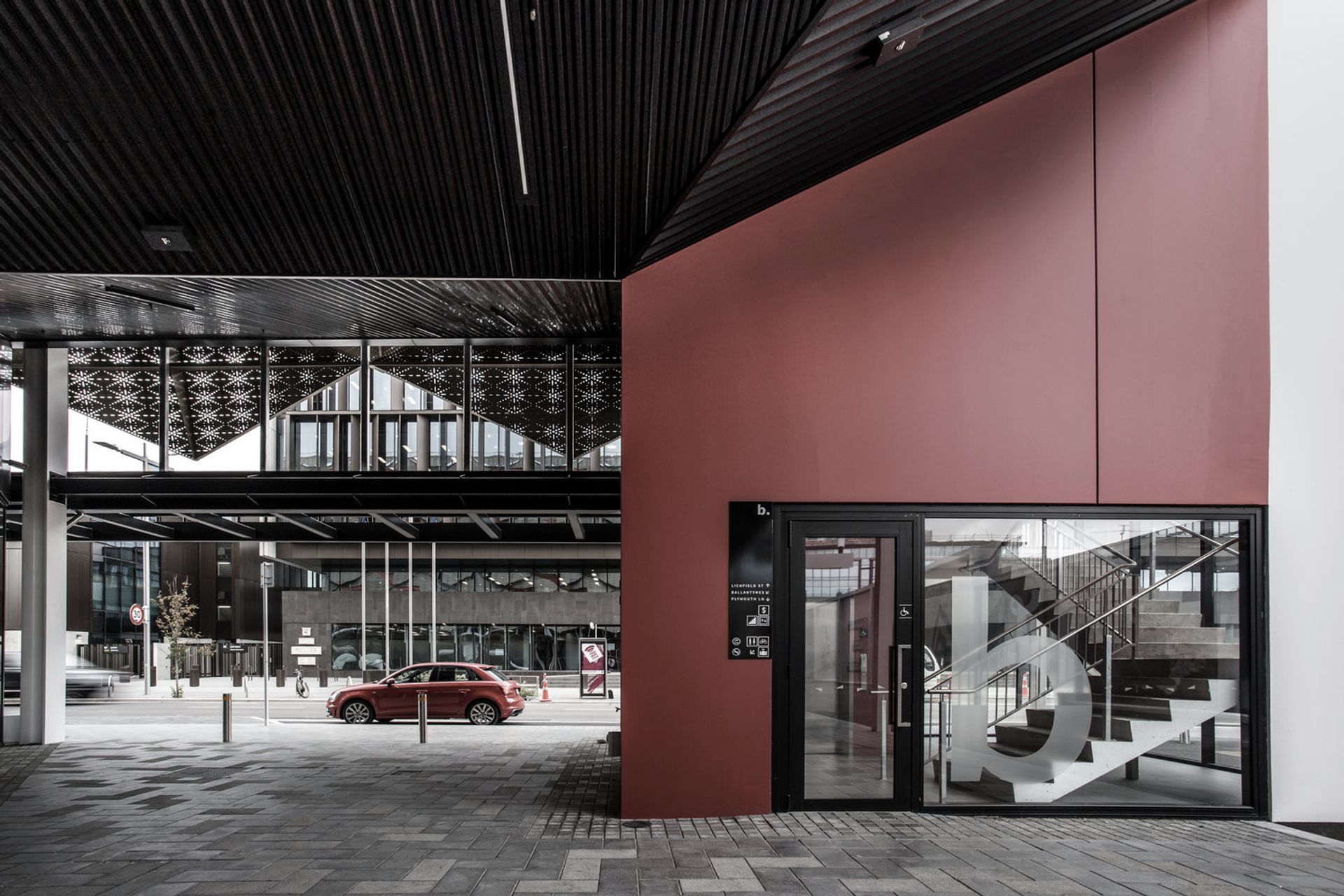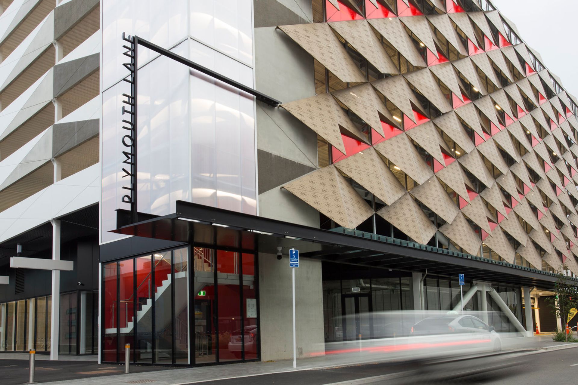ArchiPro Project Summary - Earthquake rebuild of a central city car park enhancing pedestrian access and retail opportunities, featuring a sculptural façade and illuminated stair towers for a vibrant urban experience.
