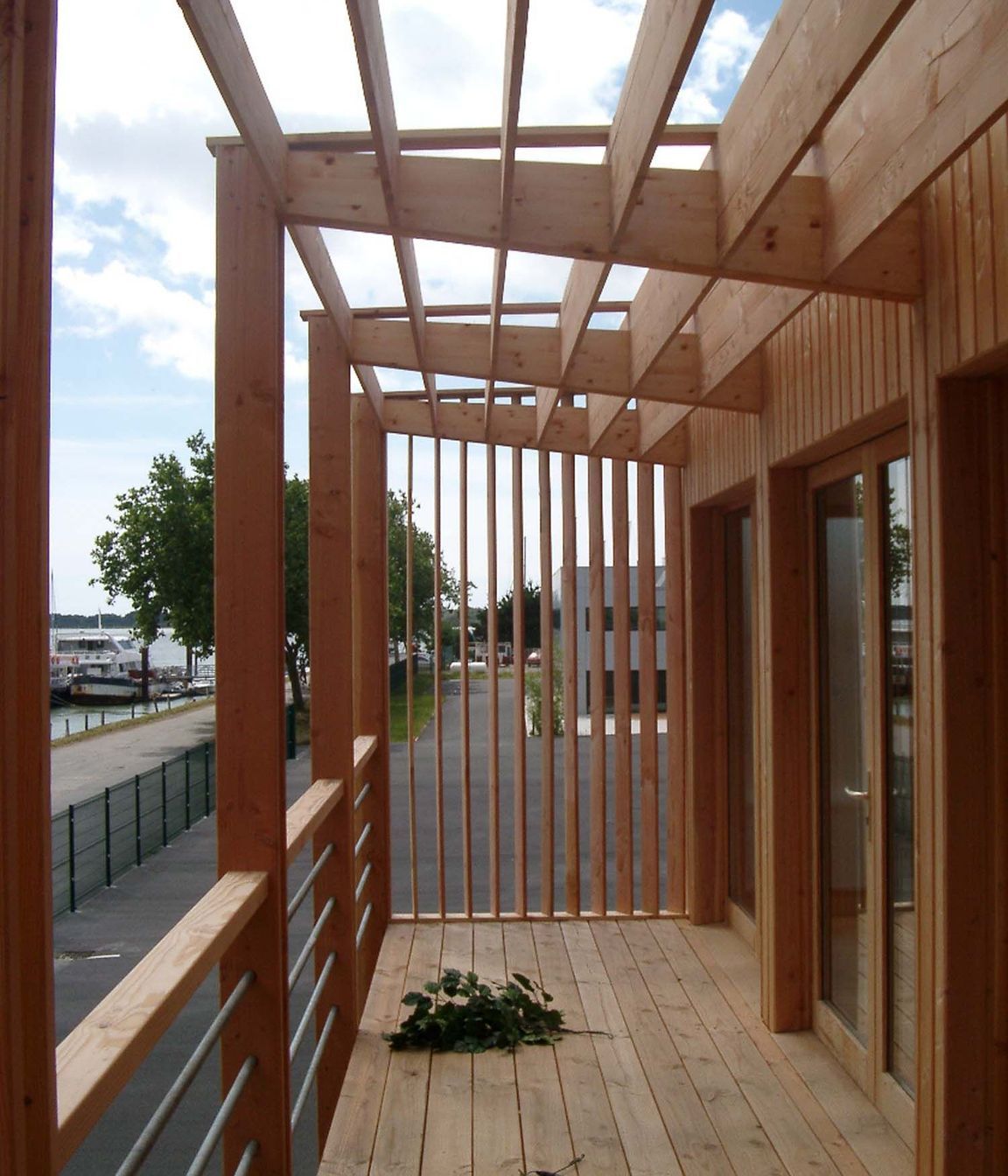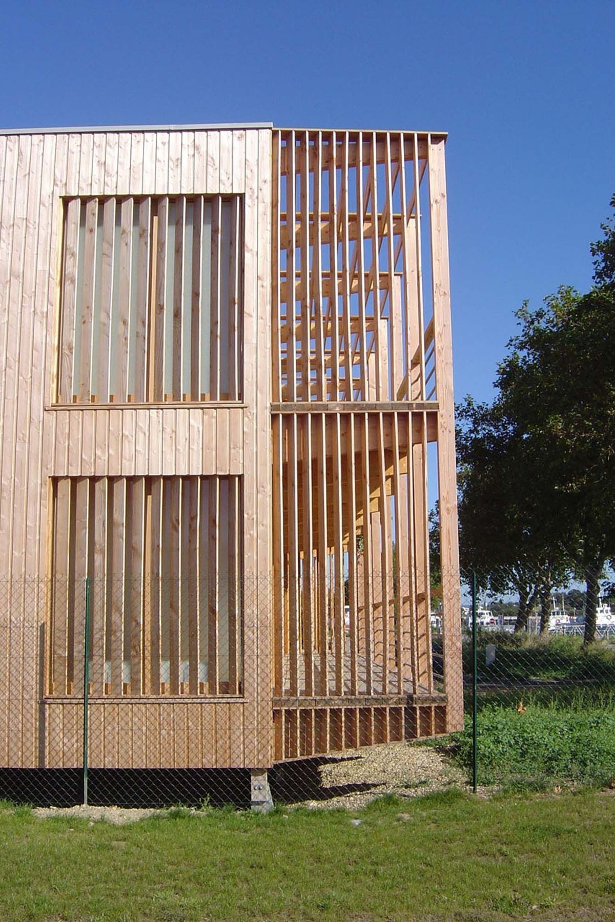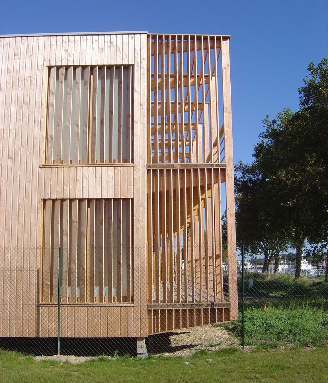 ArchiPro Project Summary - Eco-friendly sailing boat design office featuring a light wooden framework on stilts, cantilevered terrace, and innovative sun control solutions, all while maximizing canal views and integrating harmoniously with the surrounding trees.