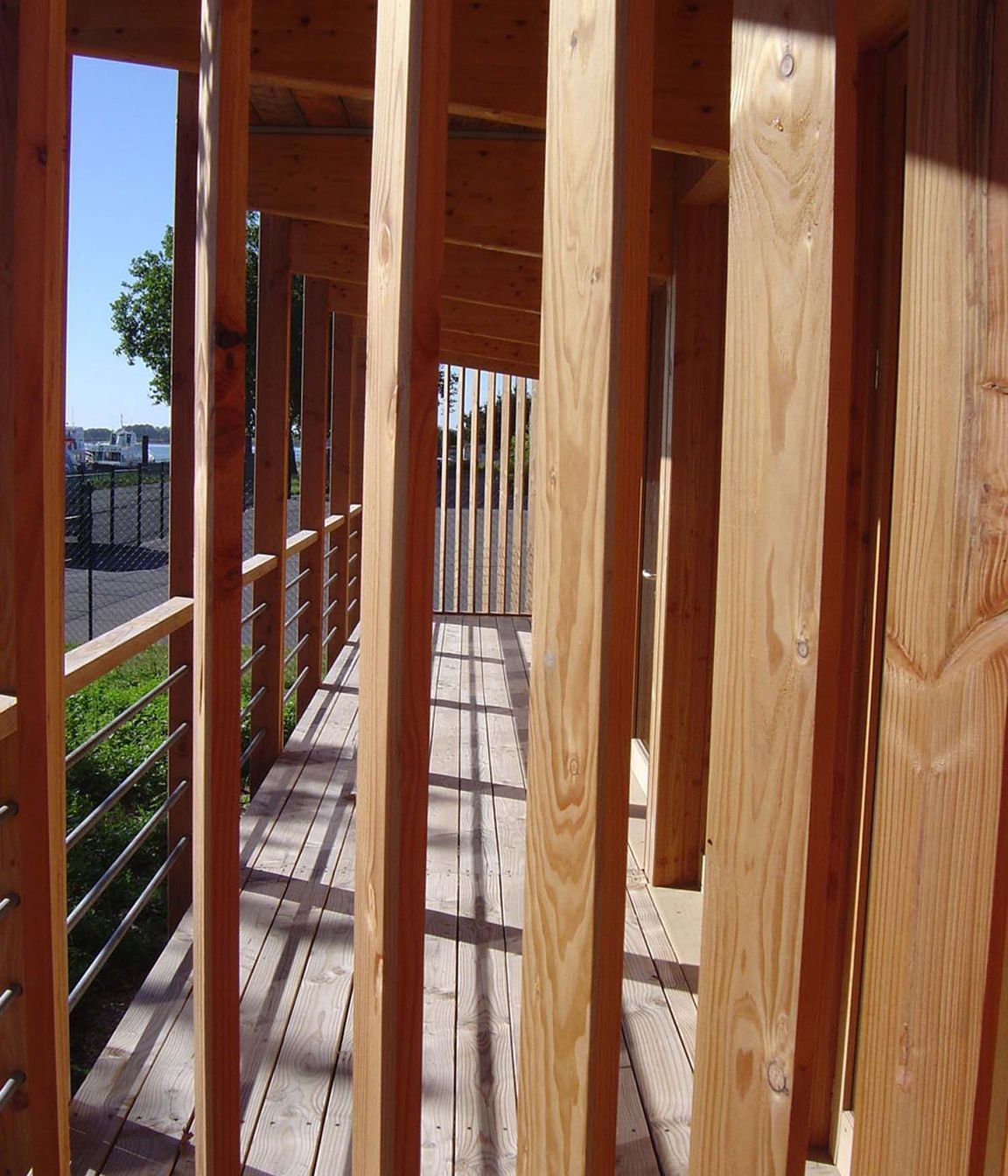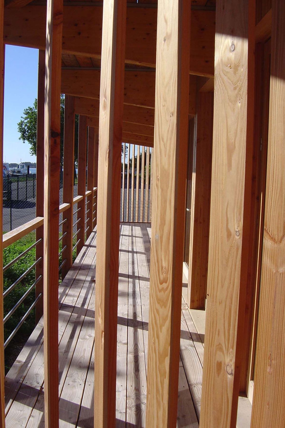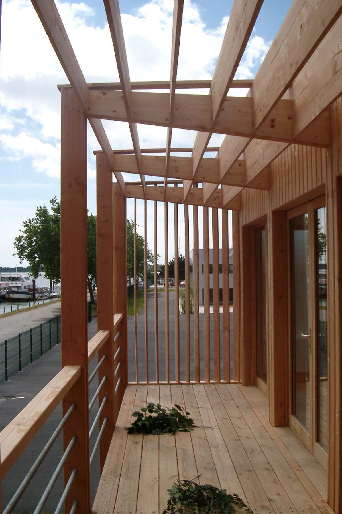 ArchiPro Project Summary - Eco-friendly sailing boat design office featuring a light wooden framework on stilts, cantilevered terrace, and innovative sun control solutions, all while maximizing canal views and integrating harmoniously with the surrounding trees.