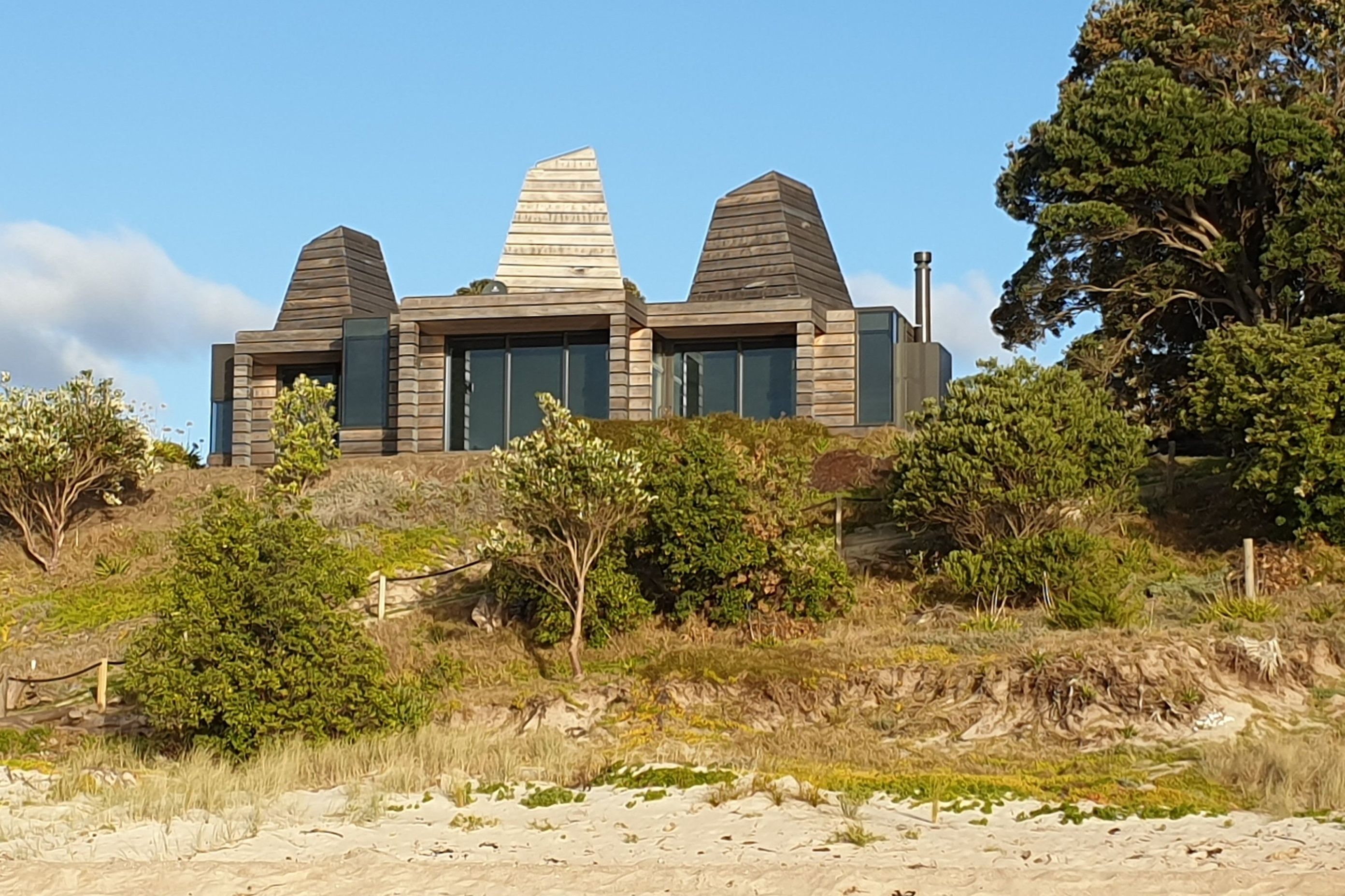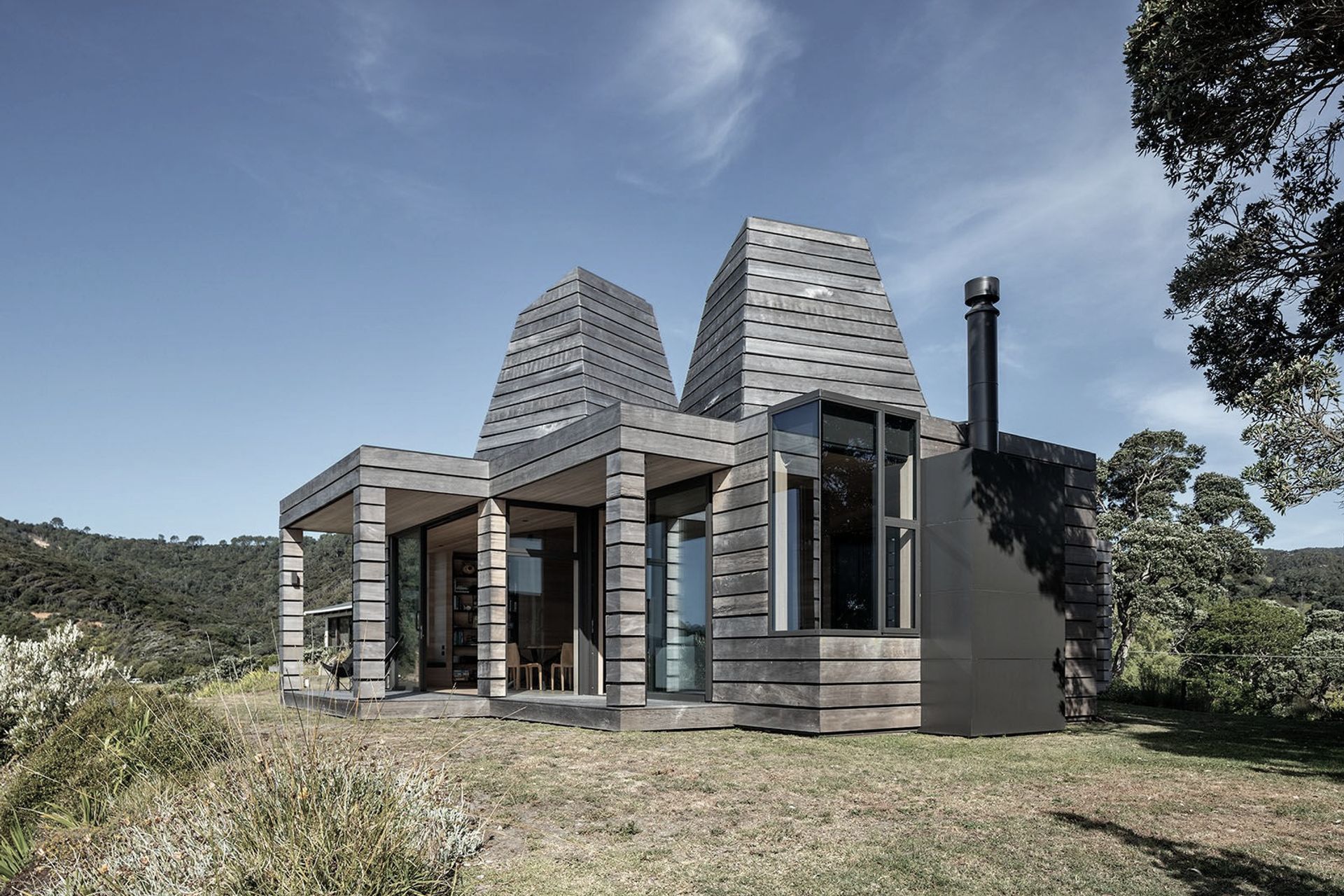 ArchiPro Project Summary - A sculptural residence inspired by Kuaotunu's gold-mining history, featuring unique turret structures that maximize natural light, a rustic reclaimed Totara exterior, and seamless access to the beach, designed by Crosson Architects.