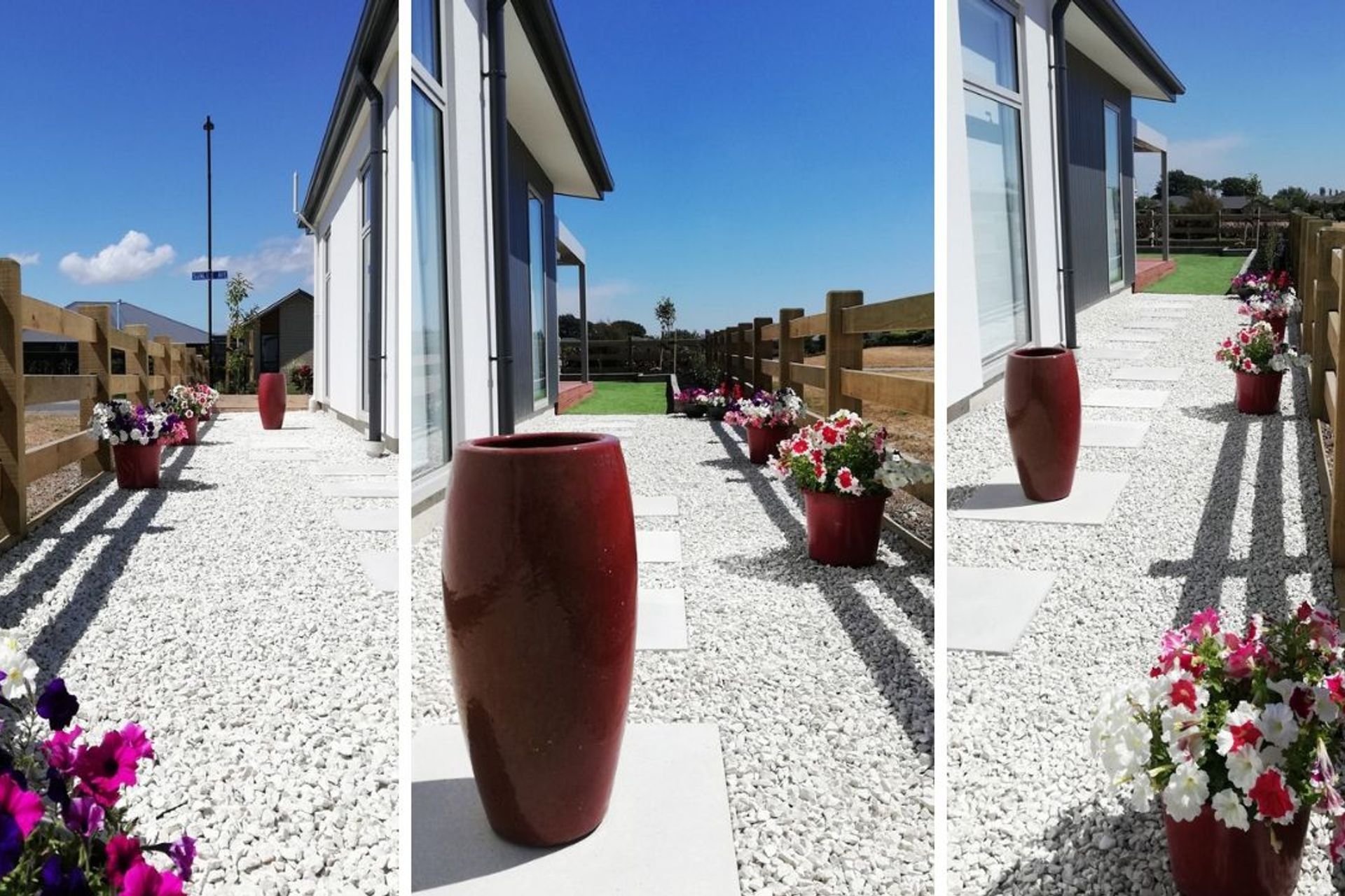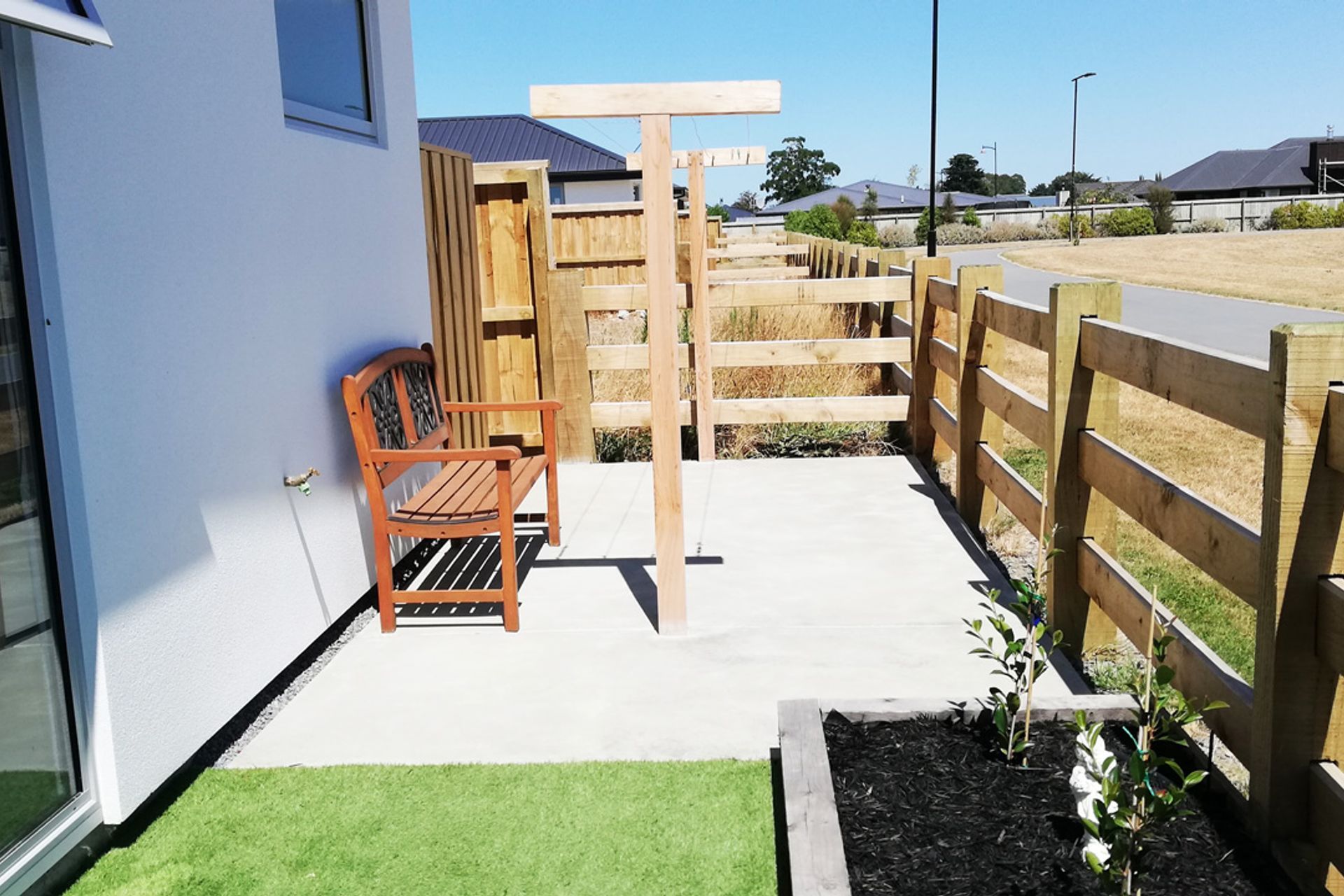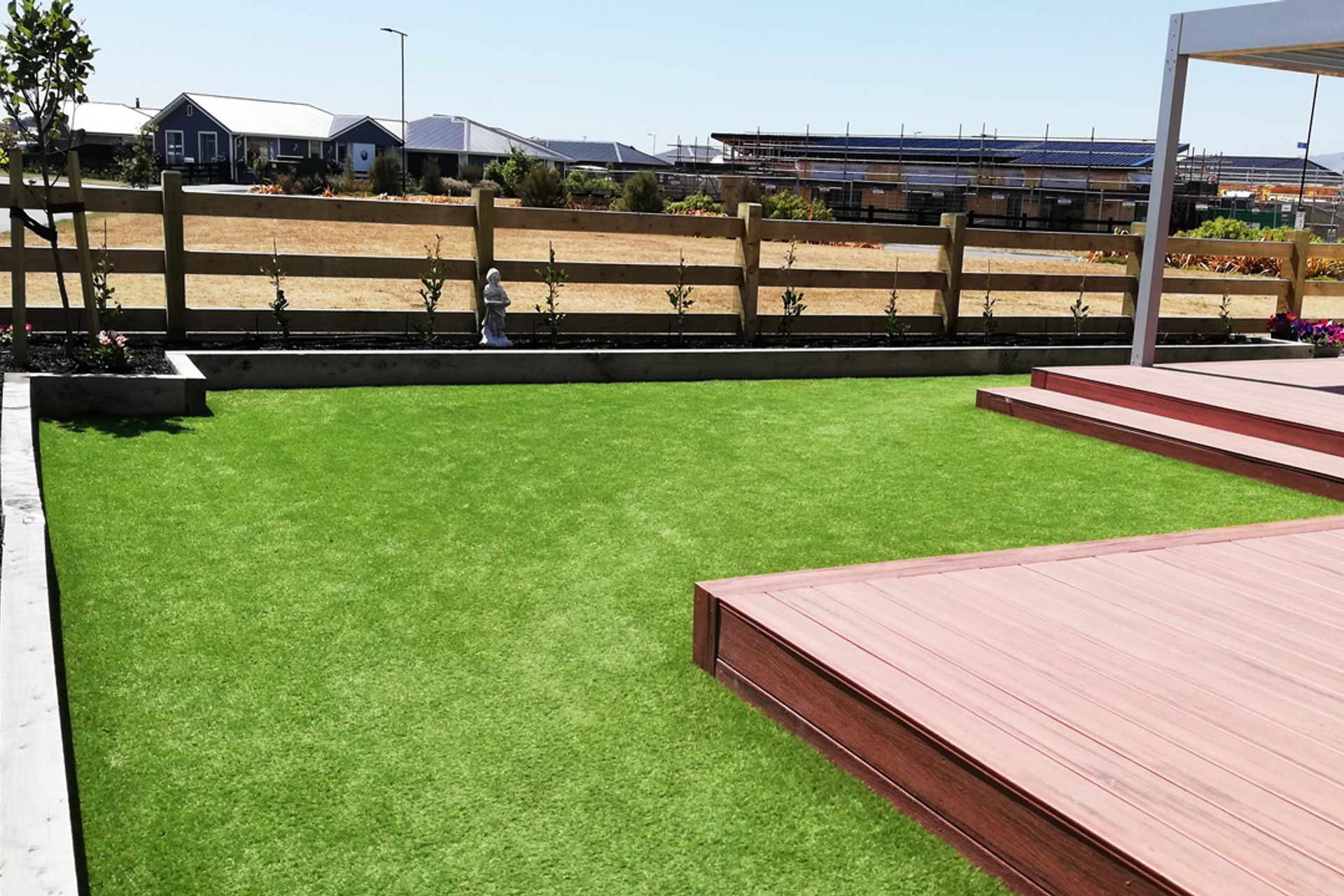 ArchiPro Project Summary - Comprehensive landscape package featuring drainage, exposed aggregate driveway, decorative elements, garden beds, decking, synthetic lawn, and custom installations, all delivered on time and within budget by the Koru team.