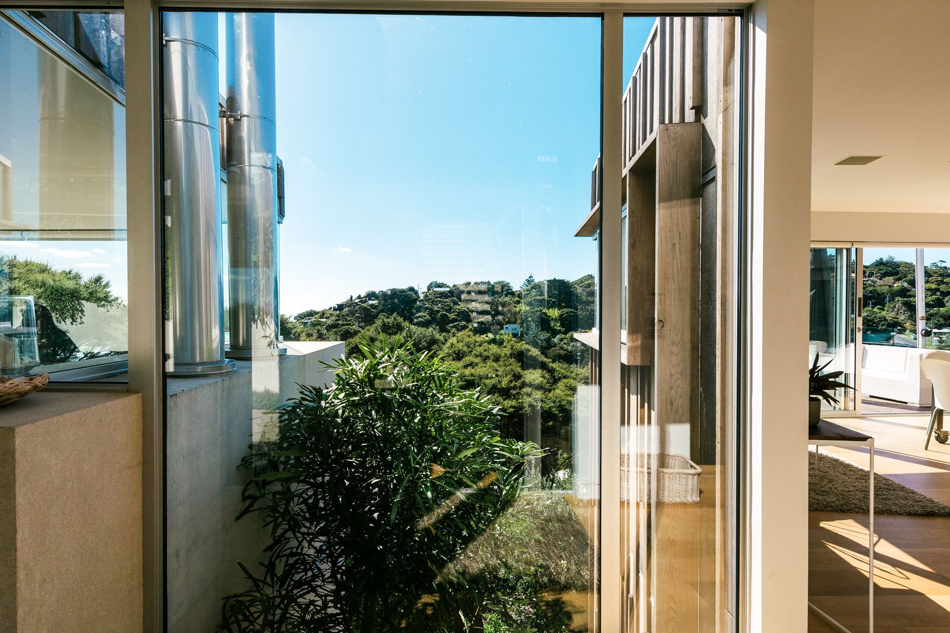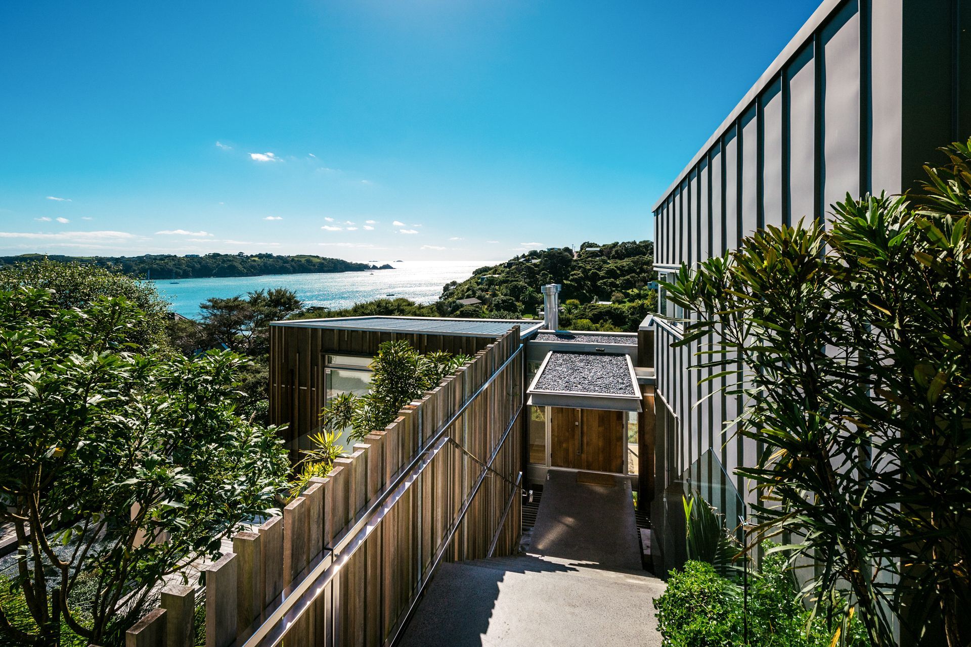 ArchiPro Project Summary - Award-winning Waiheke home designed as a journey through native Kanuka and Manuka trees, featuring interconnected forms, steps, and bridges that create a unique treehouse-like experience.