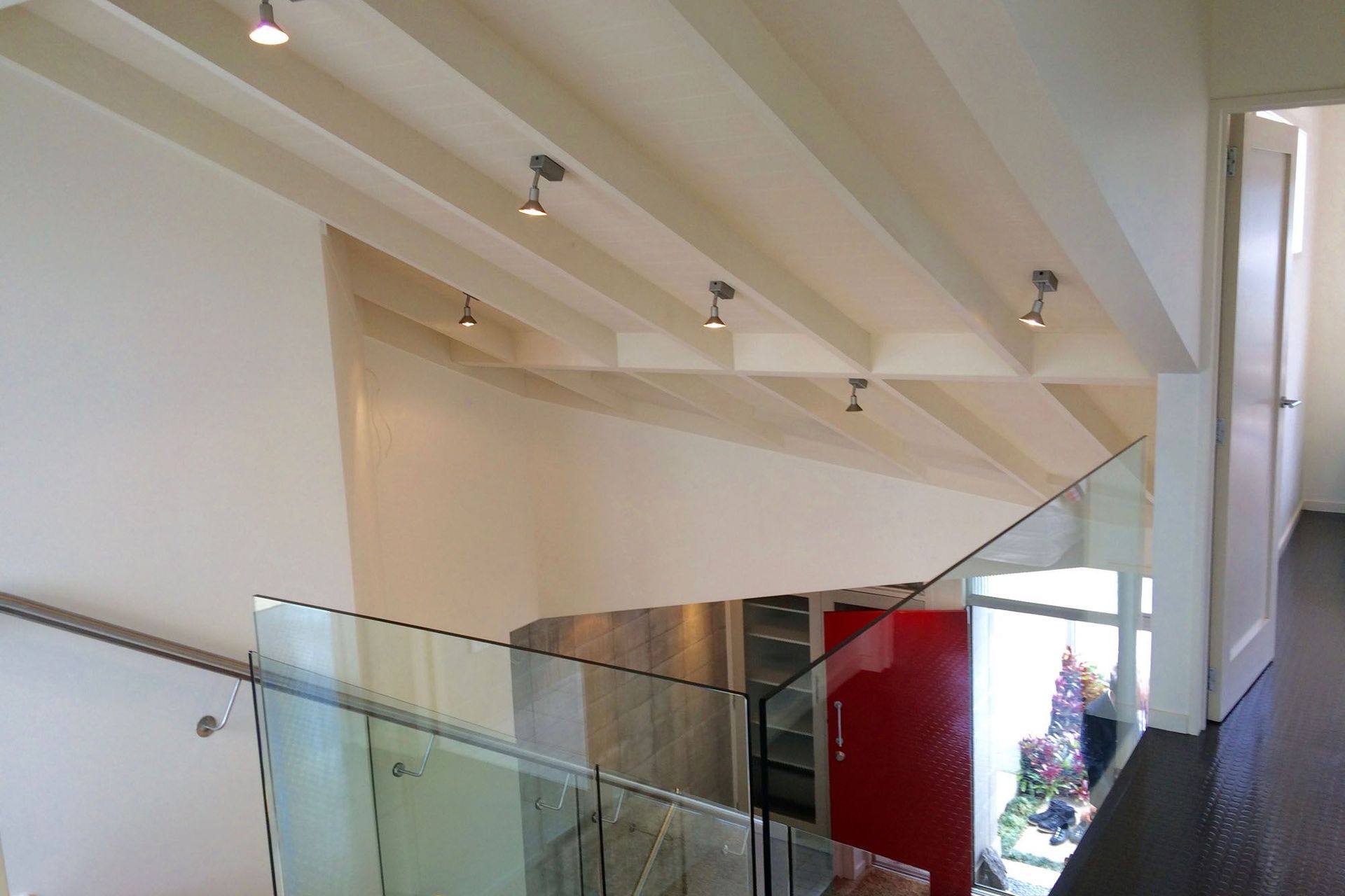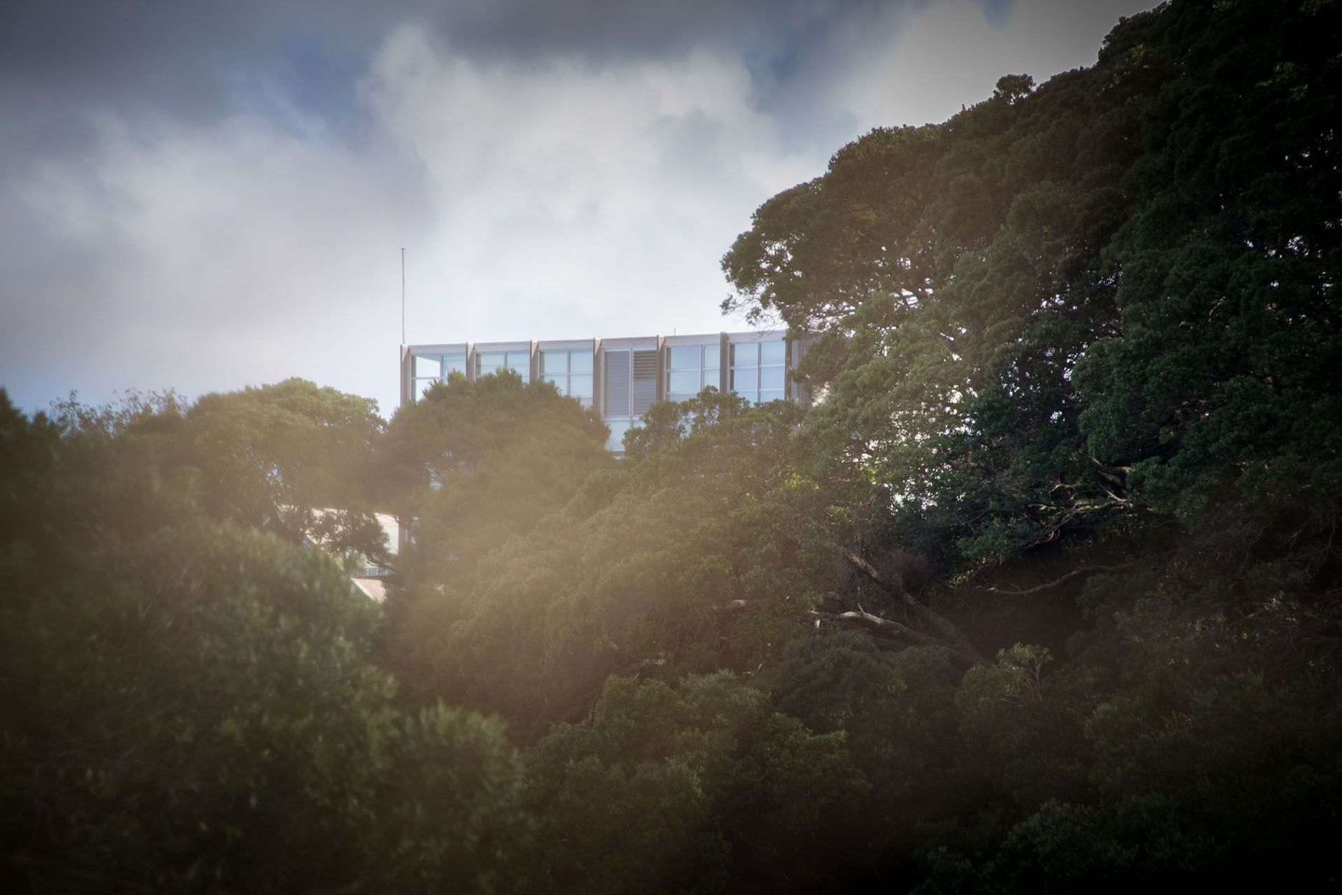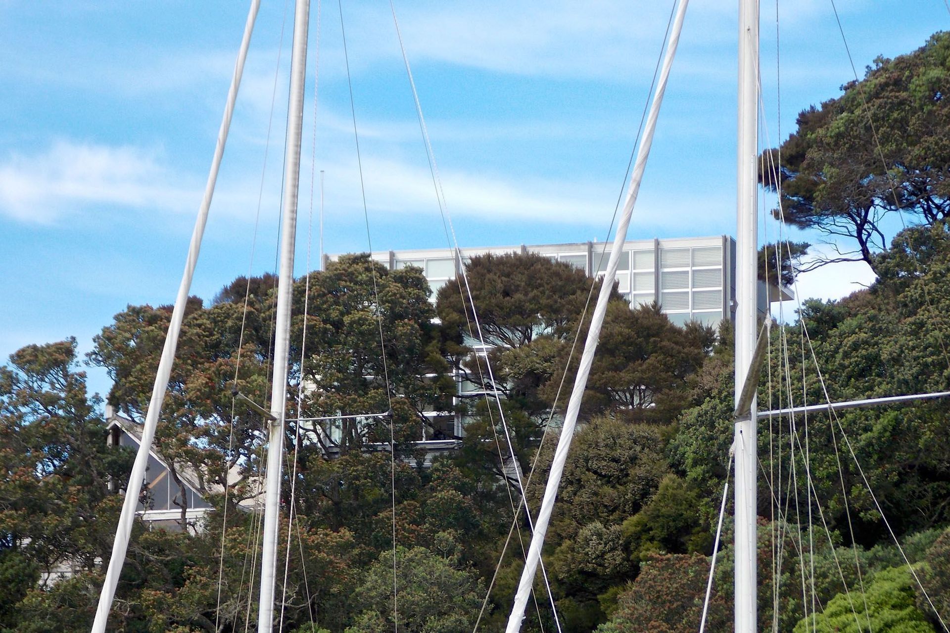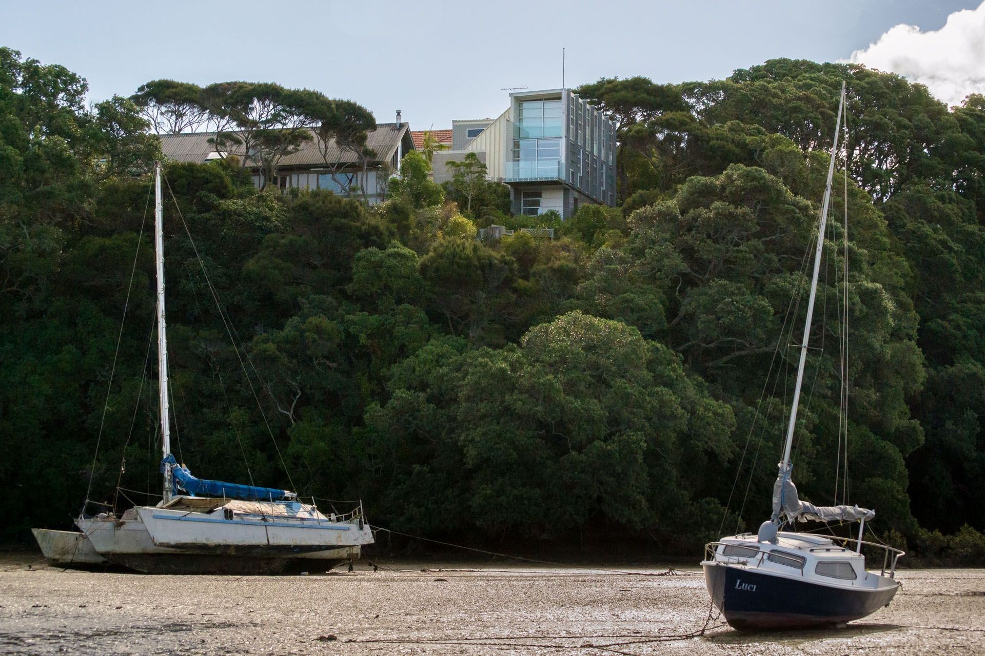 ArchiPro Project Summary - A vertically layered residence inspired by boat building techniques, featuring solid lower levels with punched openings and translucent upper levels, complemented by white painted plywood ceilings and exposed rafters reminiscent of traditional local baches.