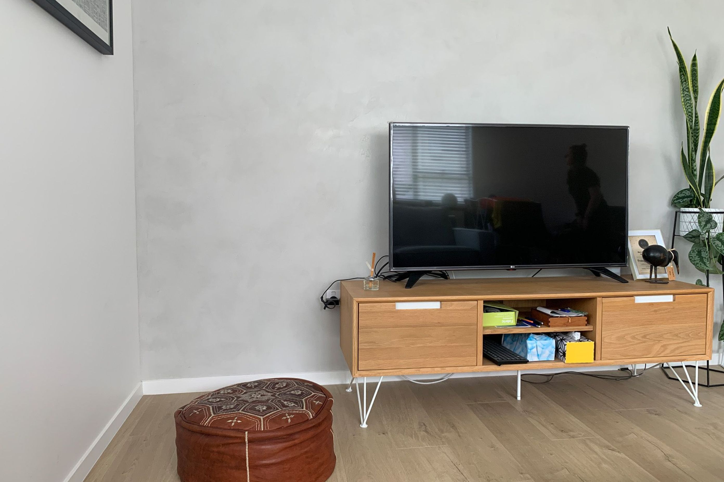 ArchiPro Project Summary - Elegant living room featuring a natural concrete finish with Venetian plaster for a sophisticated and contemporary look.
