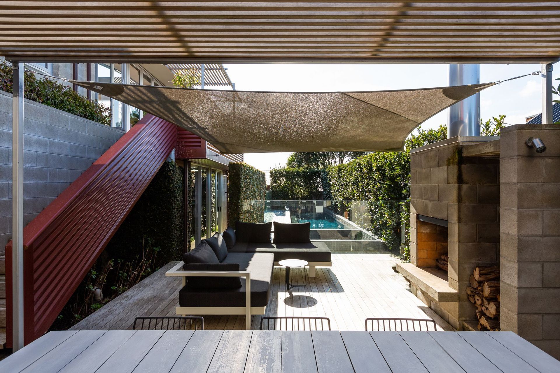 ArchiPro Project Summary - Landscaping enhancement for a Westmere townhouse featuring a concrete swimming pool, spa, outdoor fireplace, and timber decks, designed to complement the original architecture by Felicity Wallace.