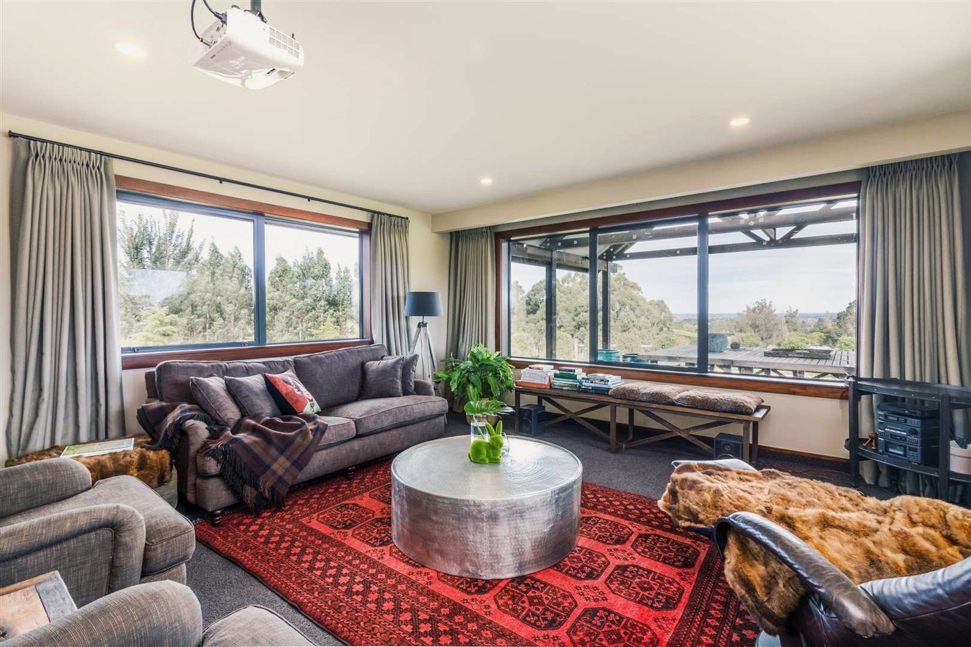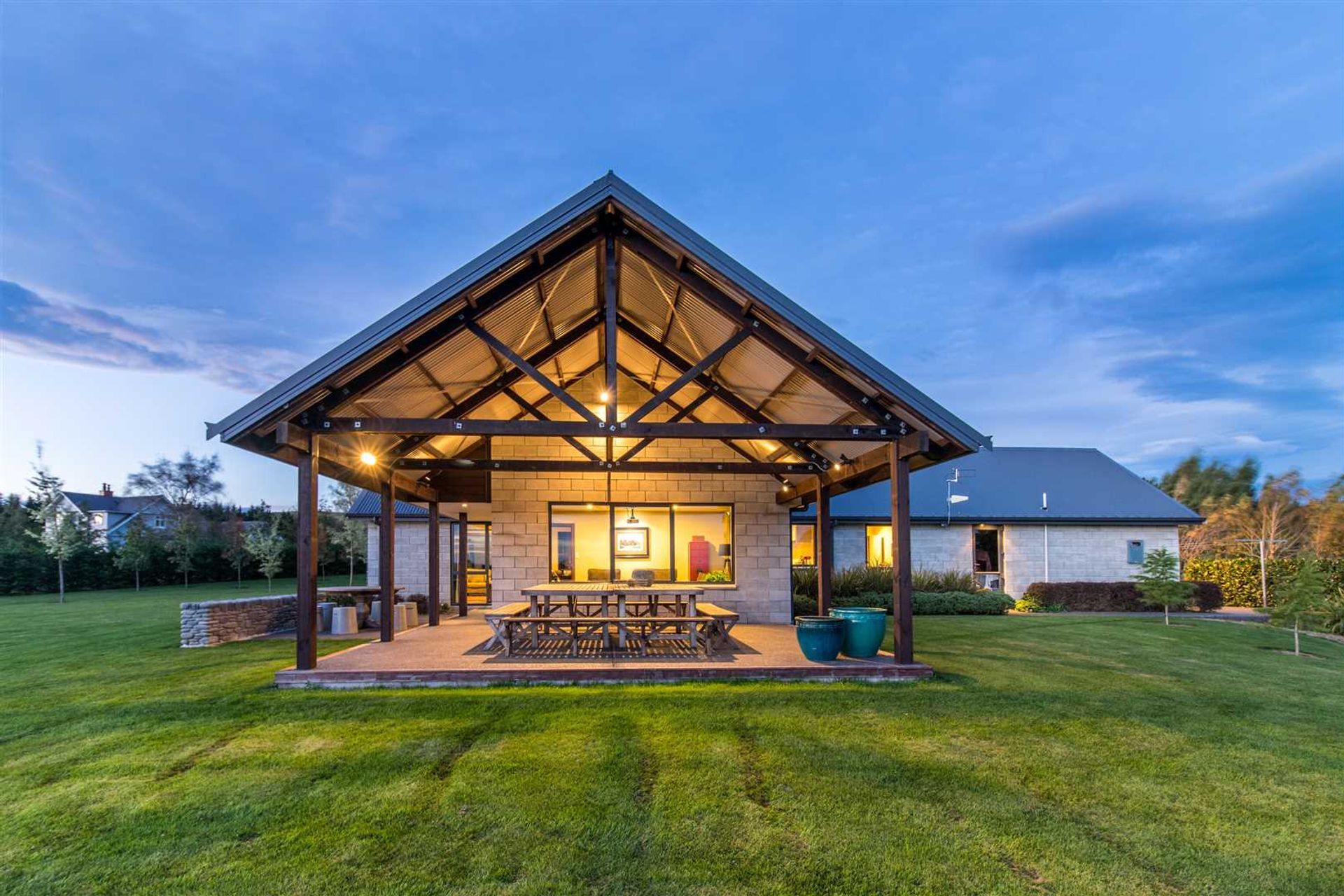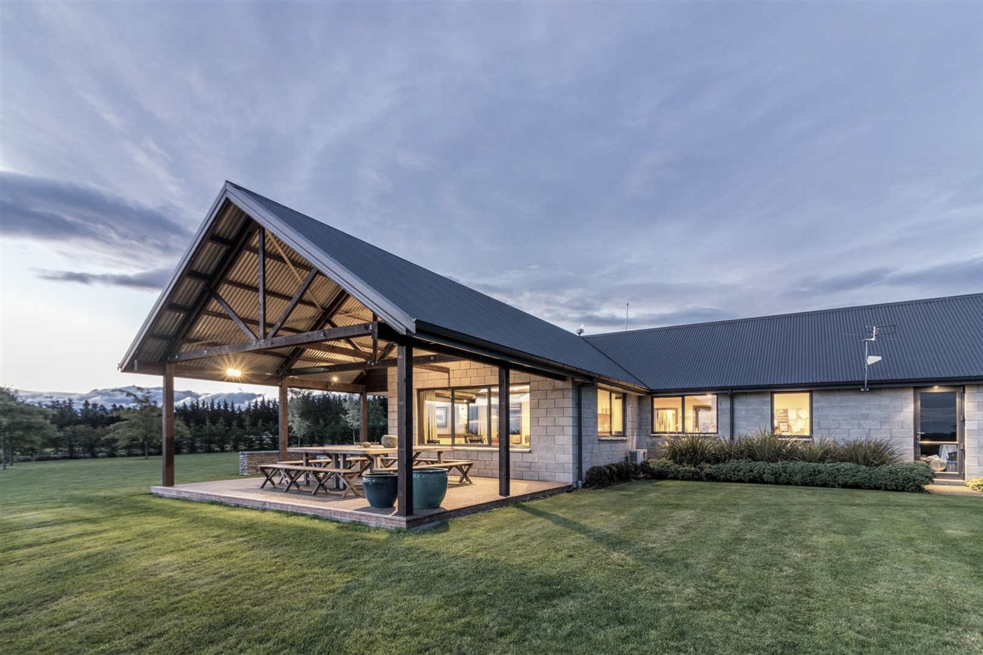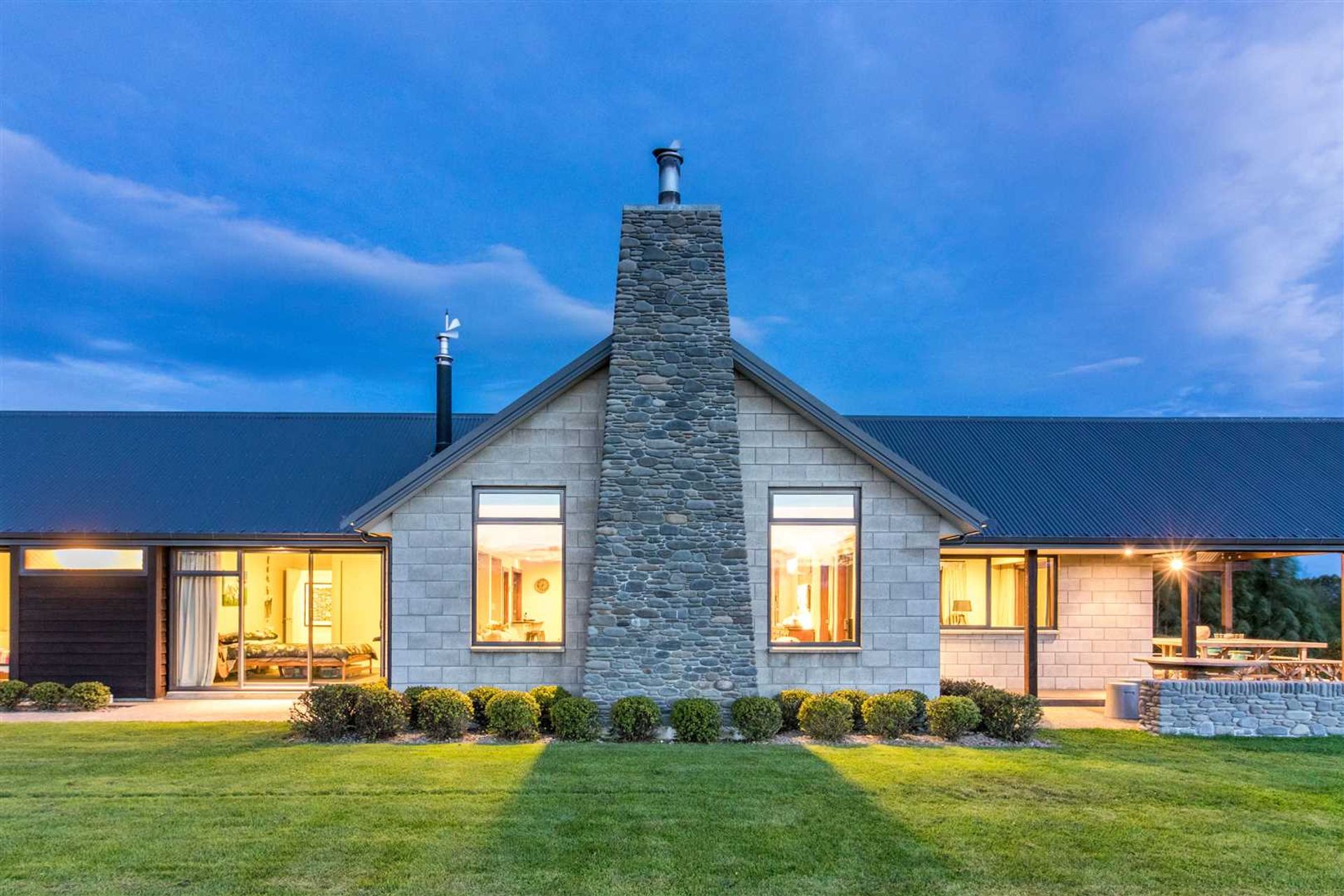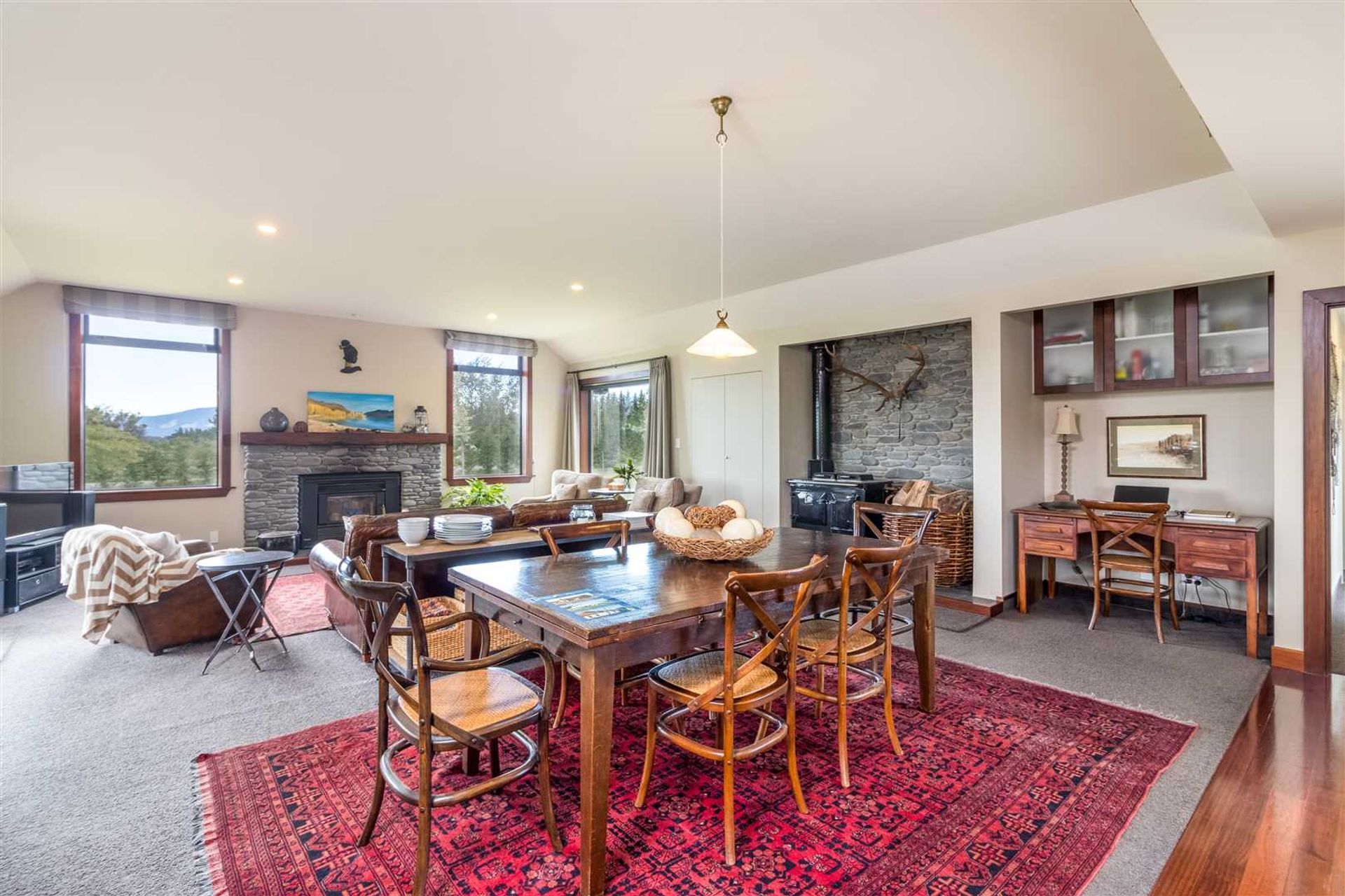 ArchiPro Project Summary - Lodge Style Loburn features high ceilings, wooden flooring, and stunning stone accents in an open plan kitchen, dining, and living area, complemented by a separate lounge offering panoramic views of farmland and mountains throughout the year.
