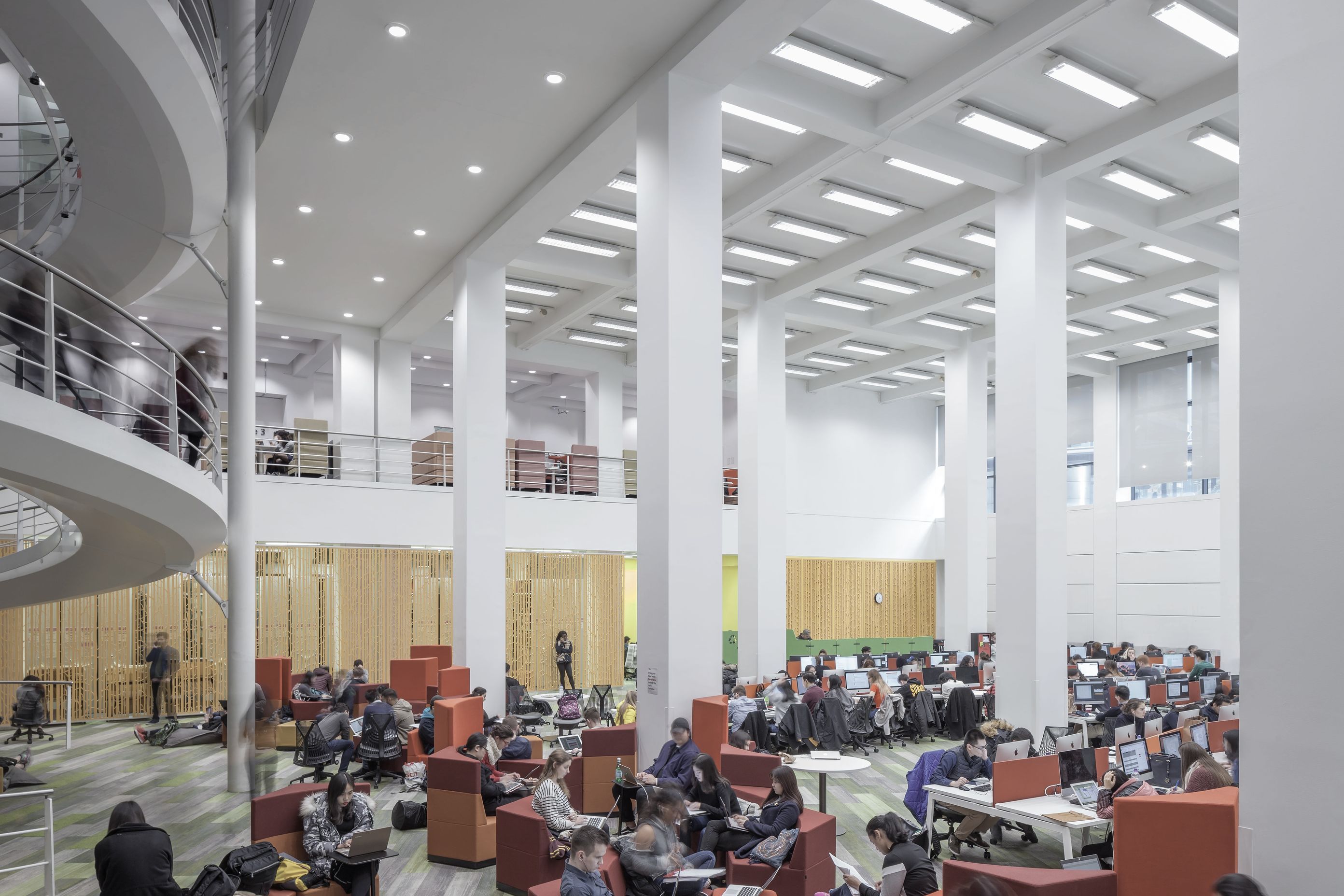 ArchiPro Project Summary - Innovative Cascade Hangings Screens enhance the London School of Economics, creating quiet zones and dynamic spaces in collaboration with Architecture PLB, featuring bespoke designs that transform the atrium with stunning light effects.