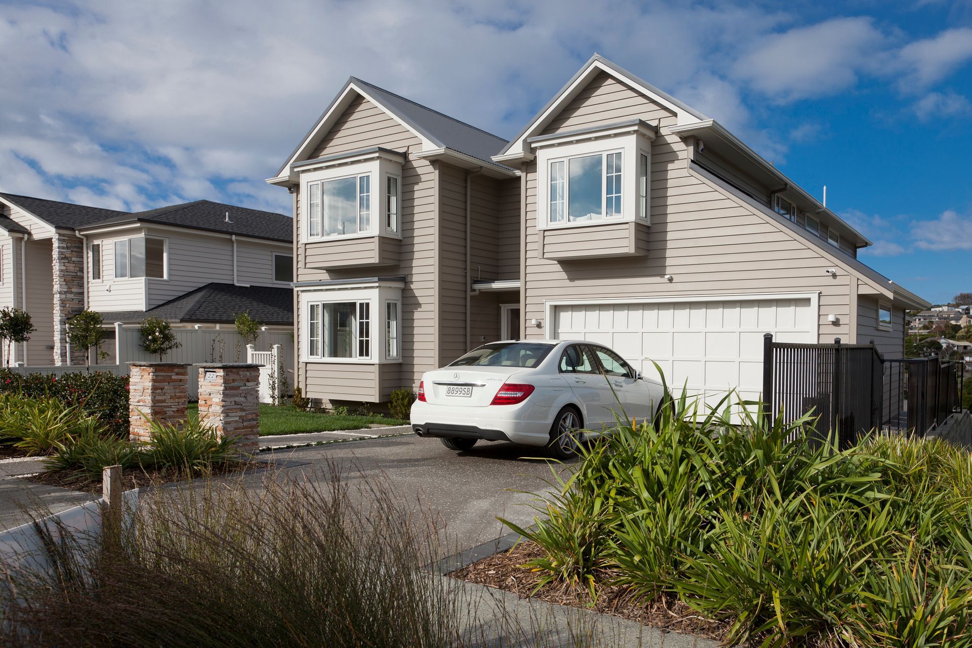 ArchiPro Project Summary - Innovative design for Long Bay Residence 2 featuring a double gable form, distinctive bay windows, and a sunny courtyard that creates an inviting outdoor living space.