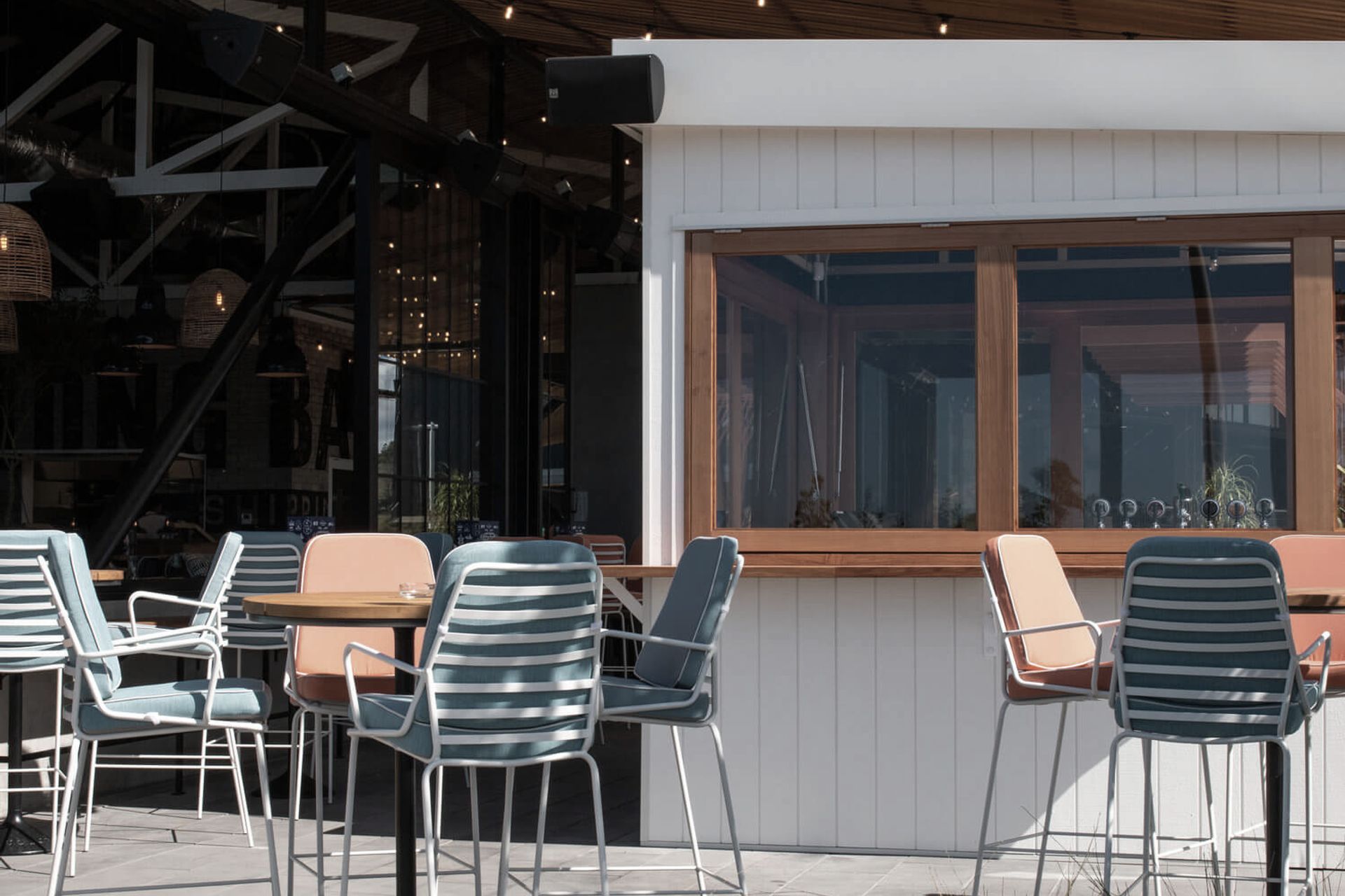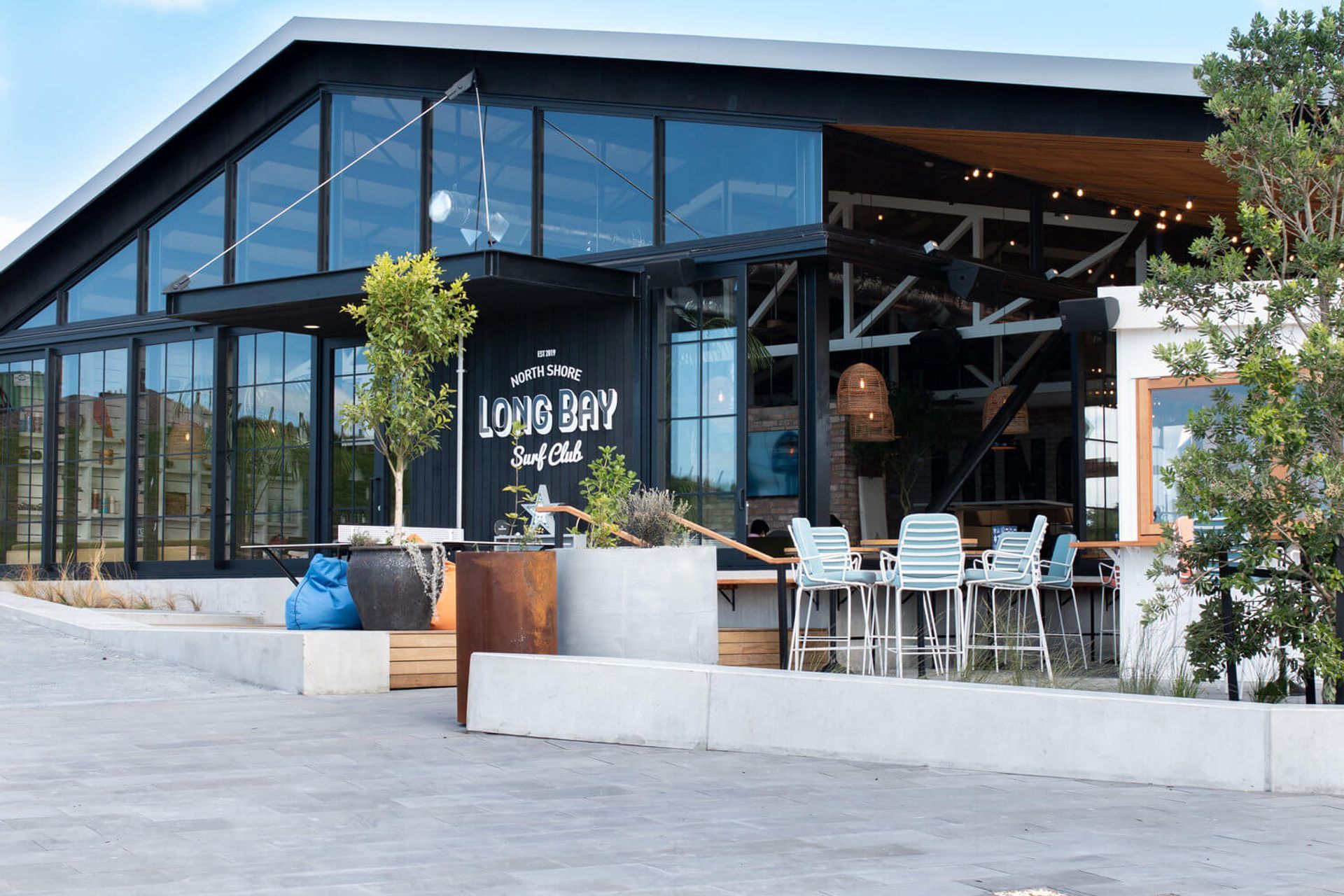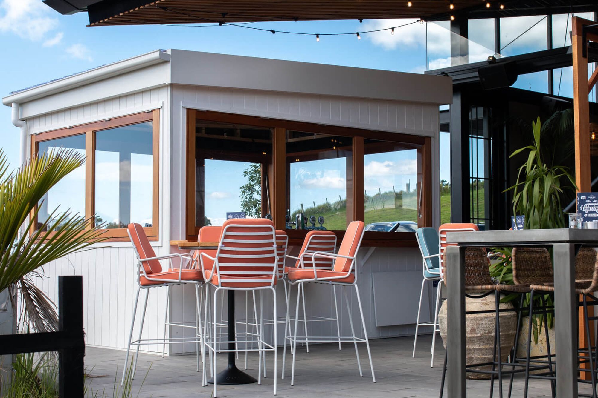 ArchiPro Project Summary - Timber work for the Long Bay Surf Club, featuring a stunning cabana hut and innovative kitchen windows designed for seamless outdoor serving.