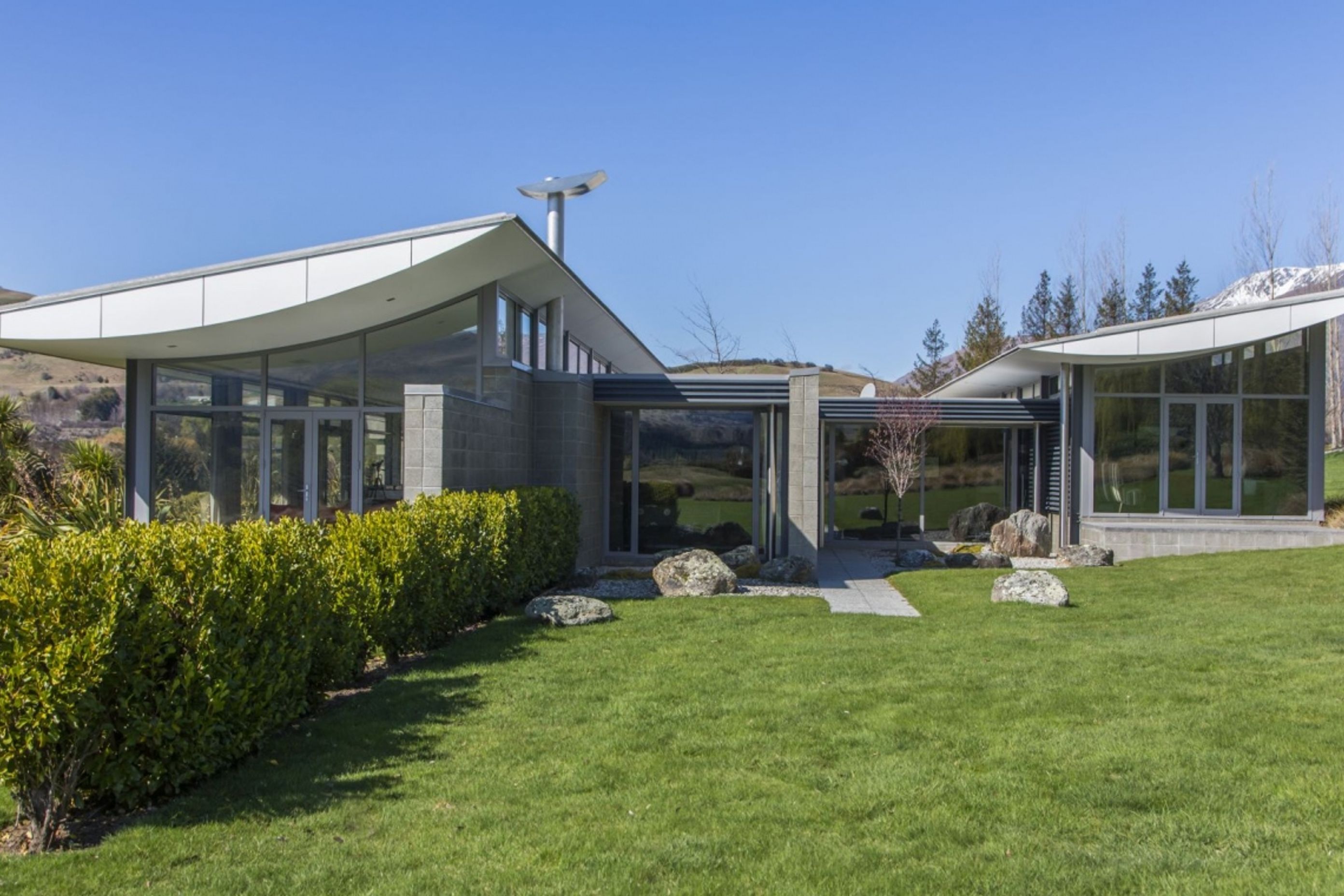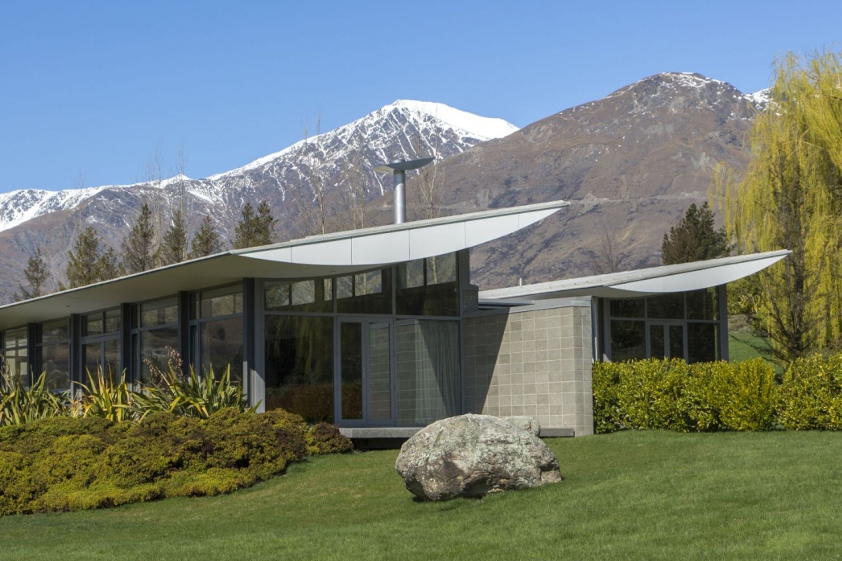 ArchiPro Project Summary - A striking residence featuring an adventurous upside-down wing-shaped roof, polished concrete floors, and honed concrete block walls, designed for optimal thermal comfort and cross ventilation, overlooking the scenic Shotover River and Coronet Peak.