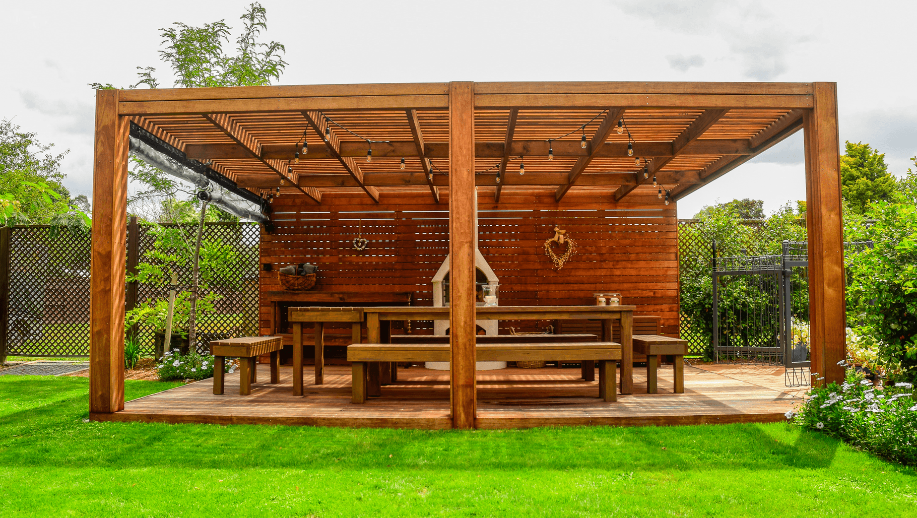 ArchiPro Project Summary - A stunning alfresco dining area featuring a rich brown Kwila timber pergola, decking, and wall, harmoniously integrated into a beautifully landscaped garden, revitalizing the space for family gatherings and summer enjoyment.