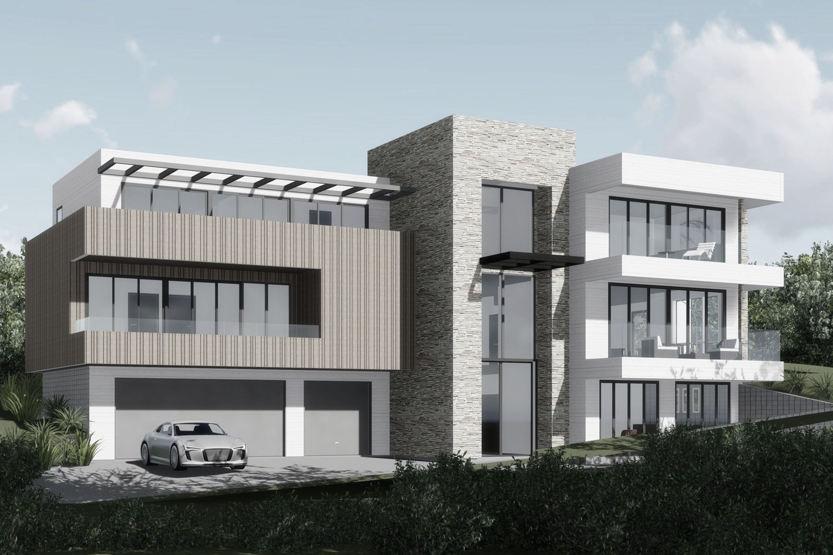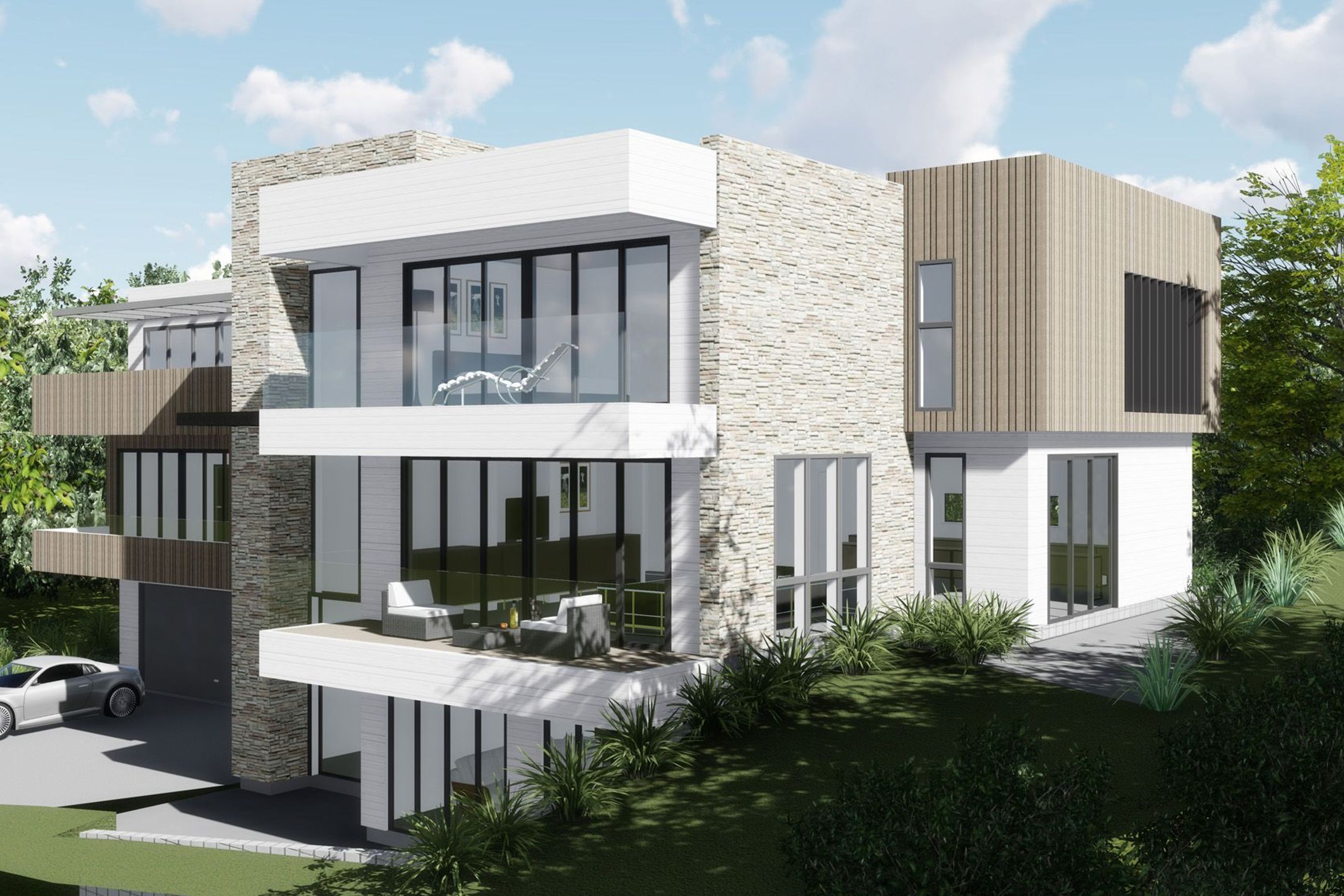 ArchiPro Project Summary - Contemporary three-part residence in Oteha, Auckland, featuring cantilever balconies and multi-material design, maximizing indoor-outdoor connectivity and city views on a 505m2 site.