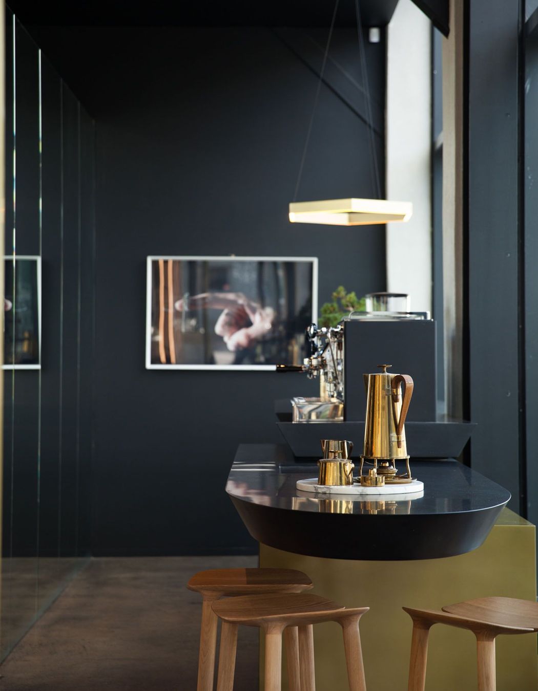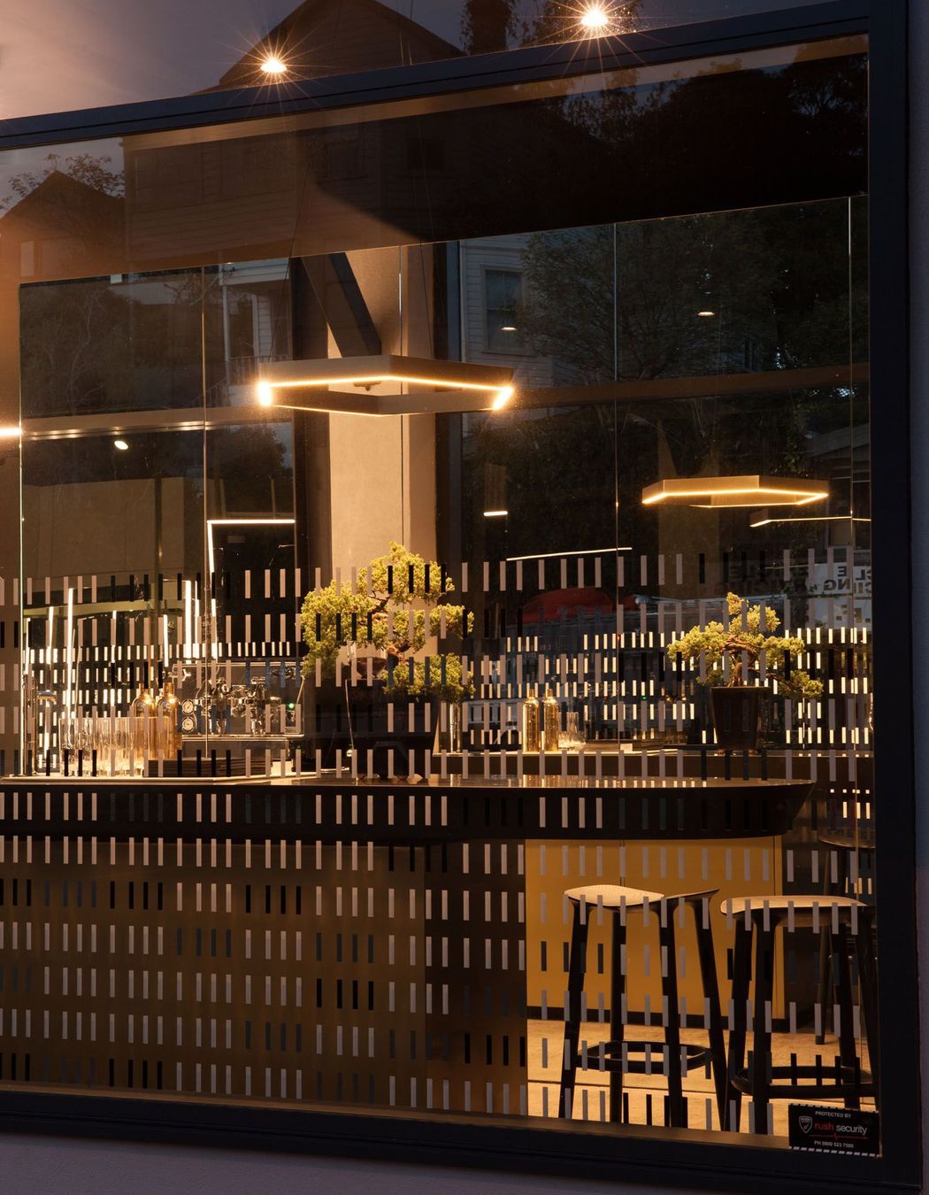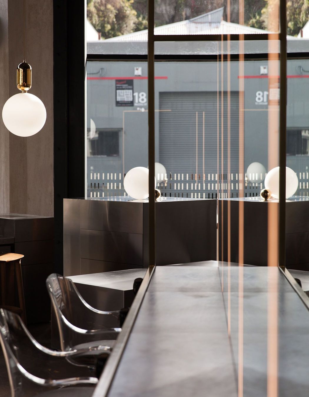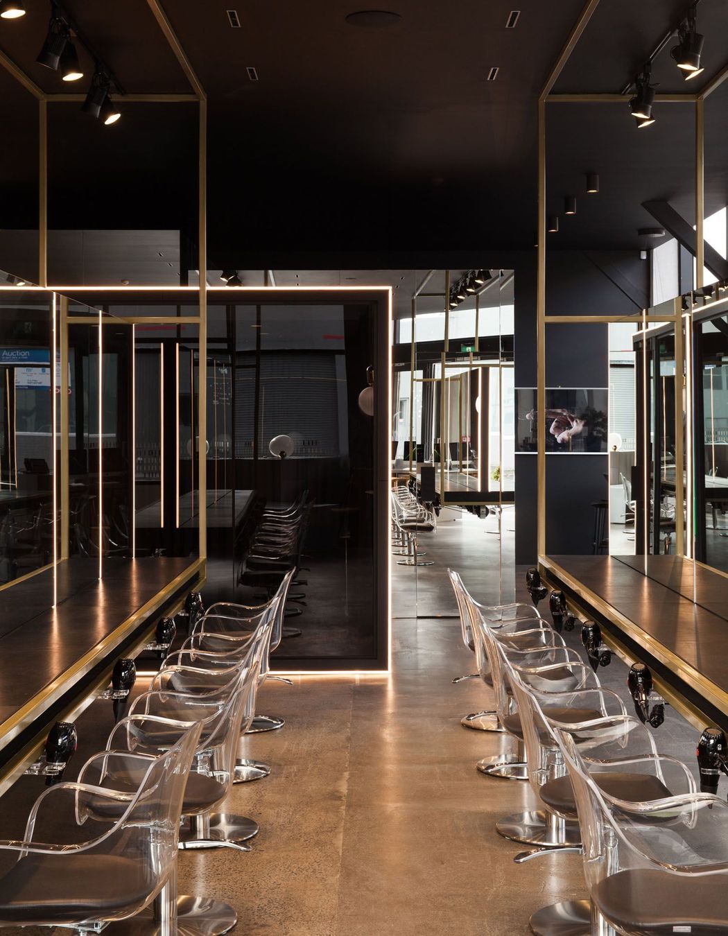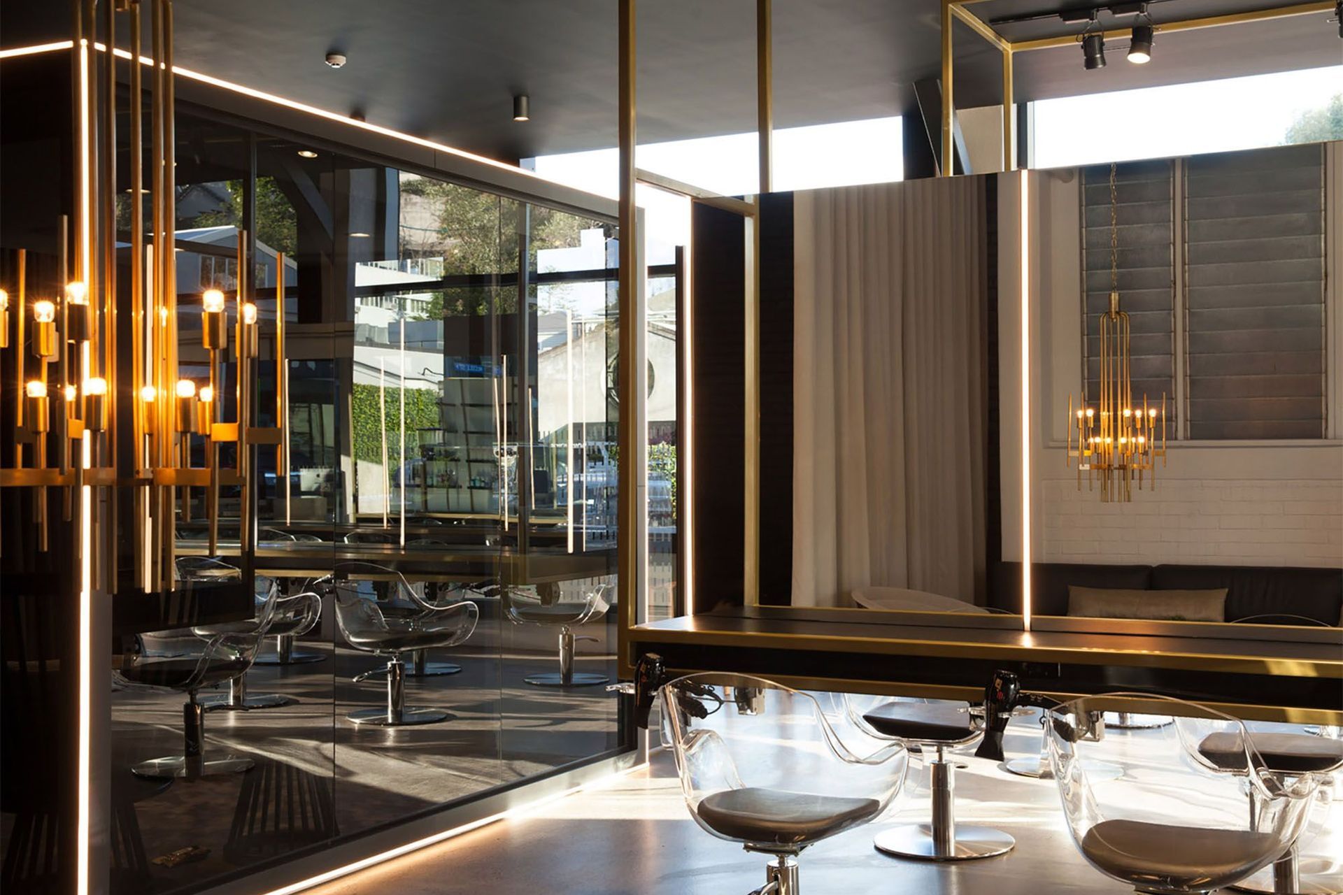 ArchiPro Project Summary - A striking transformation of an art gallery into a high-end hair salon, featuring sculptural design elements, reflective materials, and a carefully curated lighting scheme that enhances the atmosphere and creates private enclaves.