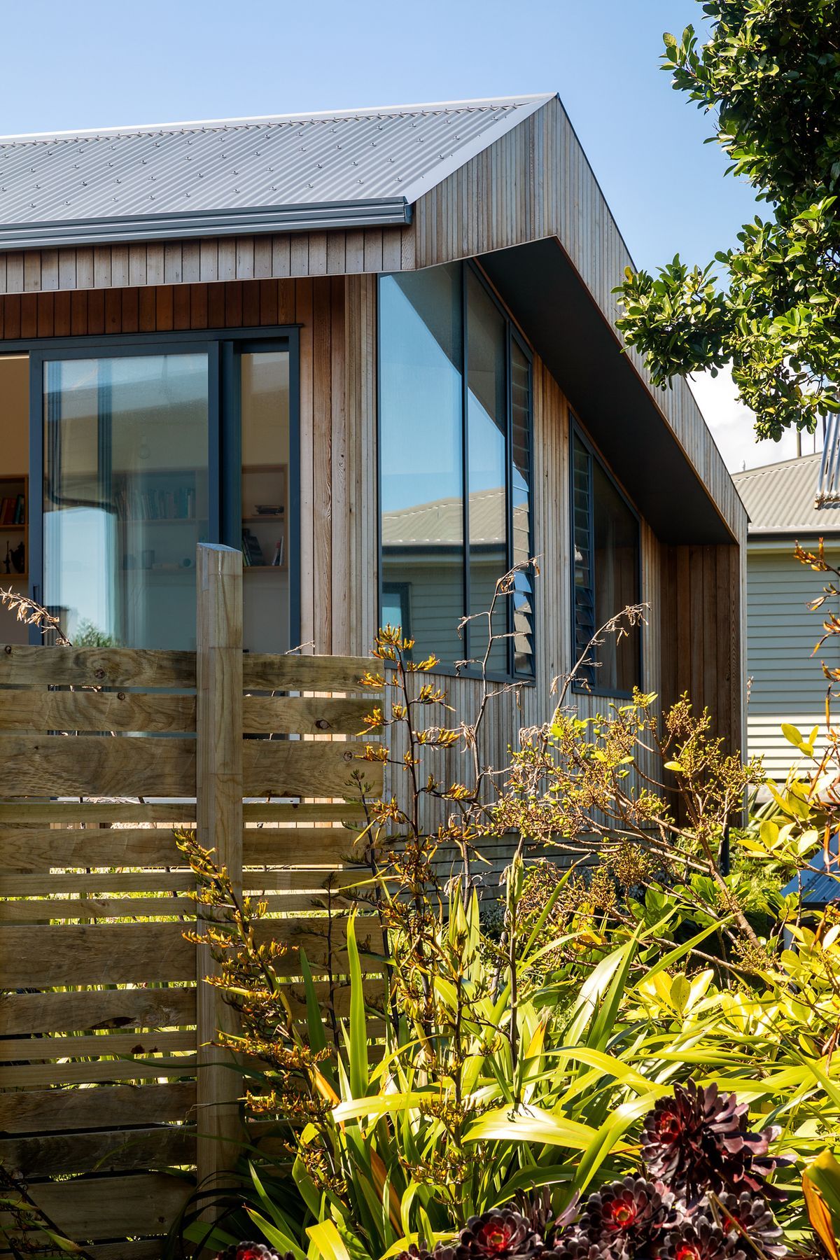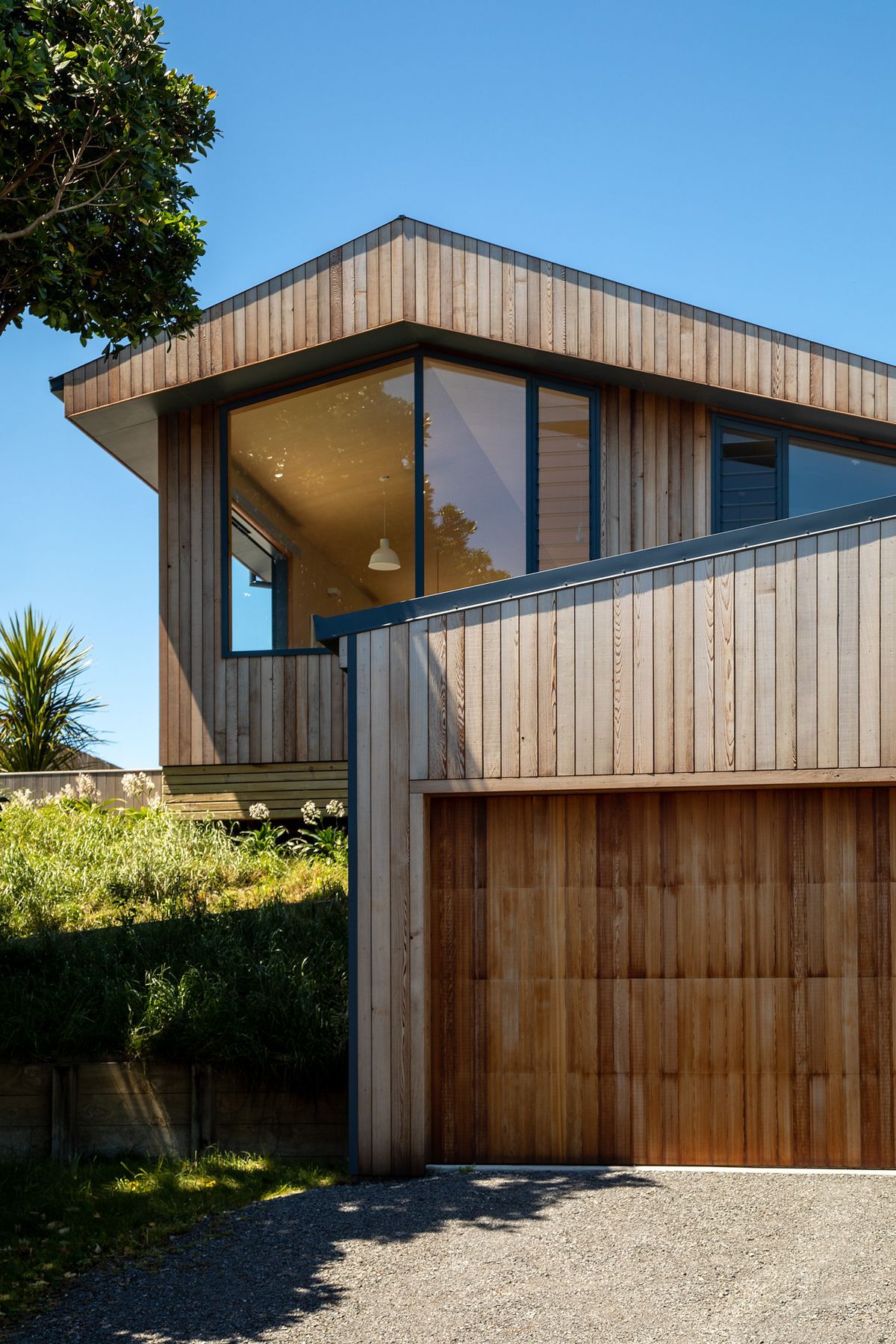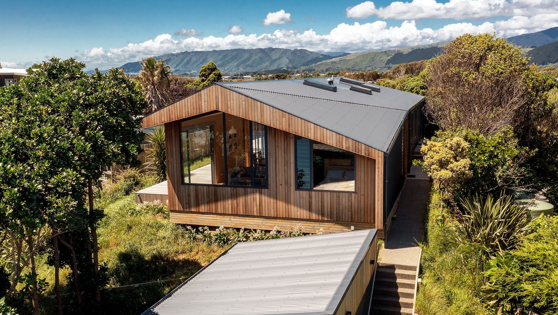 ArchiPro Project Summary - A stunning three-bedroom residence nestled among mature trees, featuring an open living area that connects to a sun-soaked deck with views of Kapiti Island, designed for flexible living with an optional studio space.