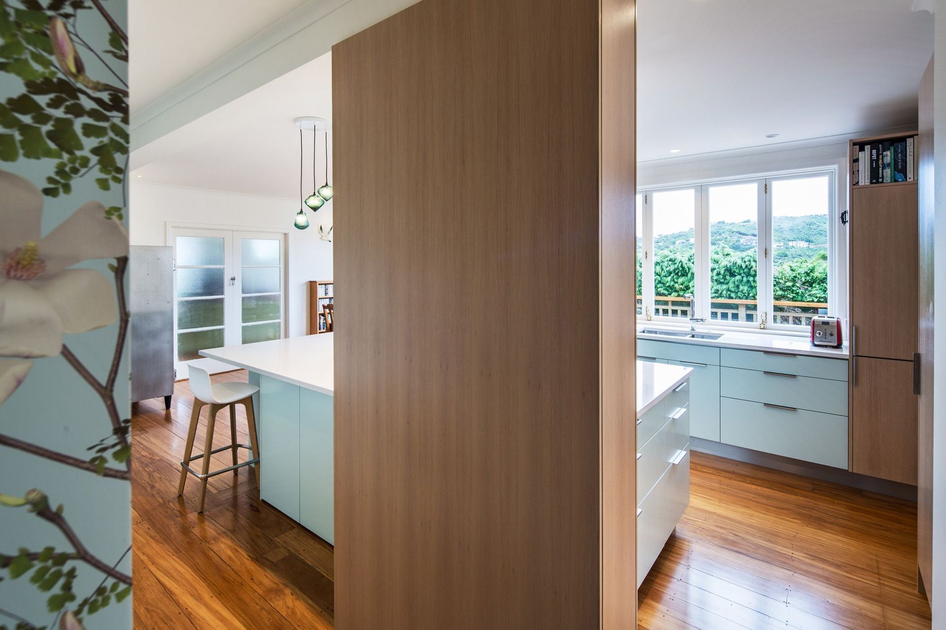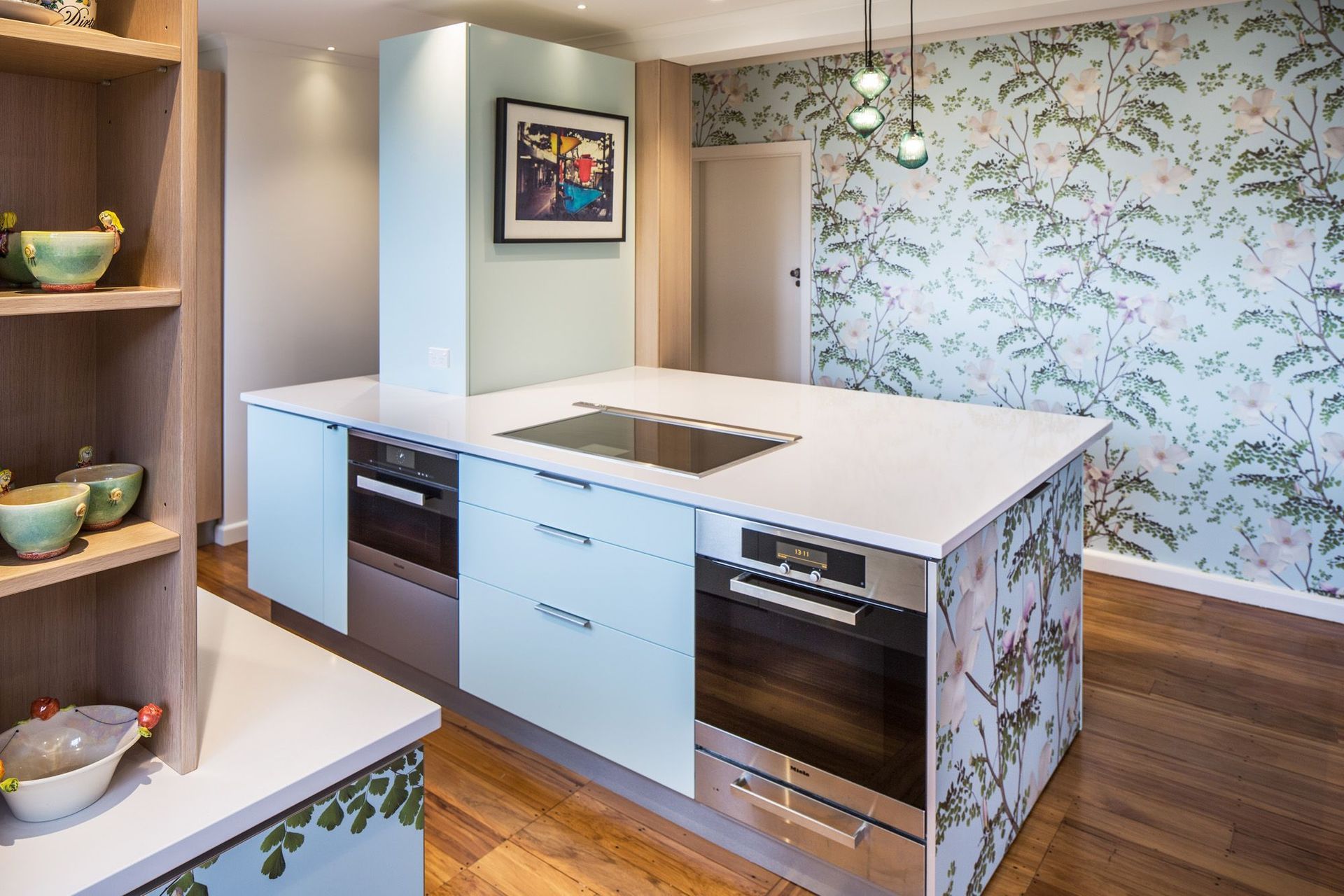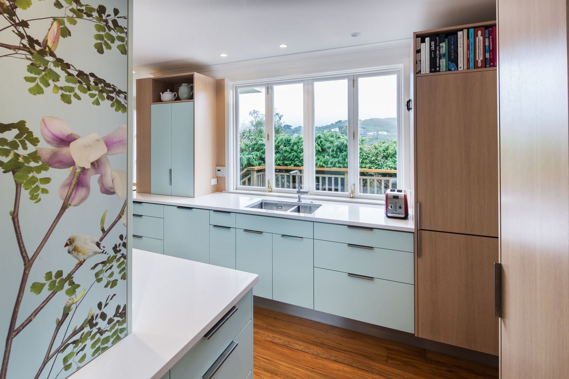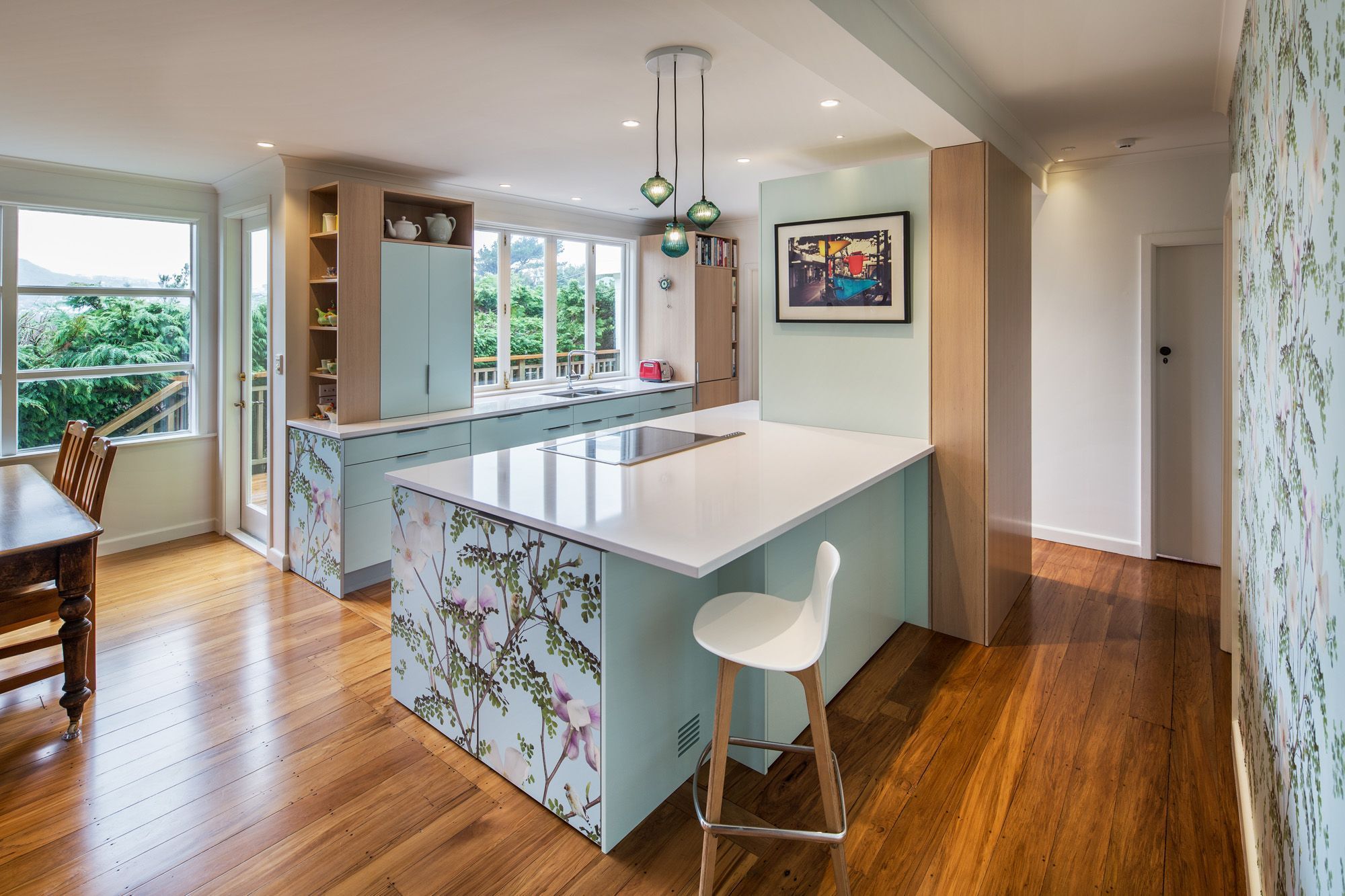 ArchiPro Project Summary - A vibrant kitchen renovation blending botanical imagery with modern functionality, featuring a spacious island, integrated appliances, and enhanced storage, all while maximizing natural light and views in a charming 1960s home.
