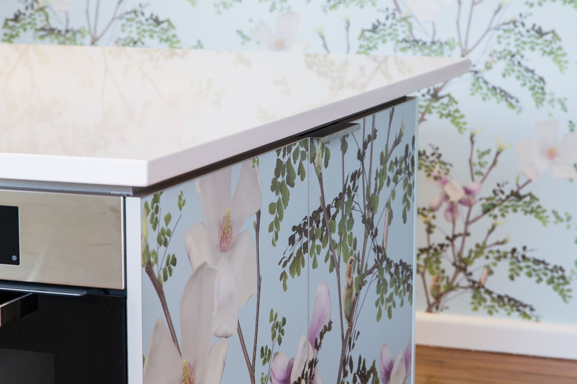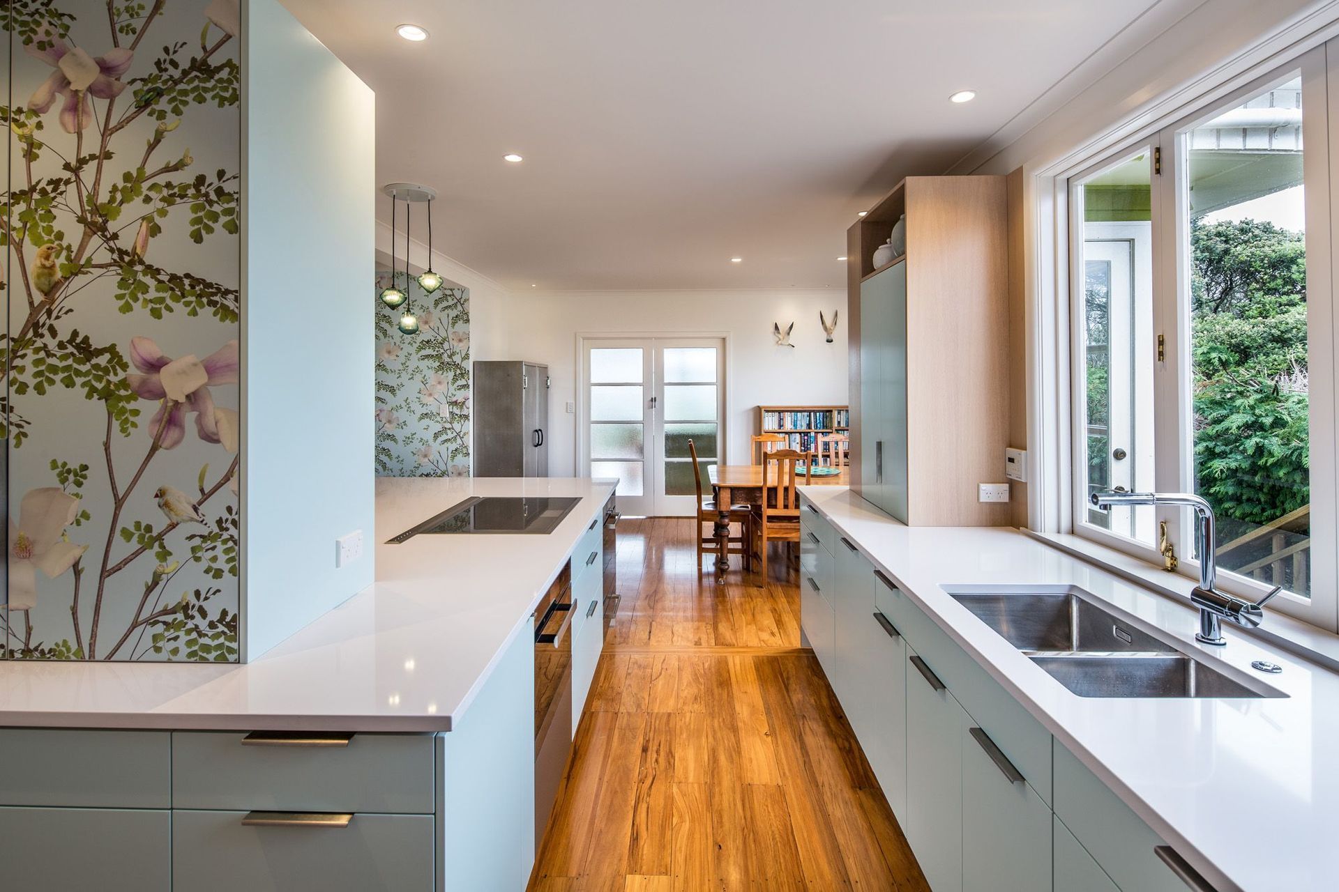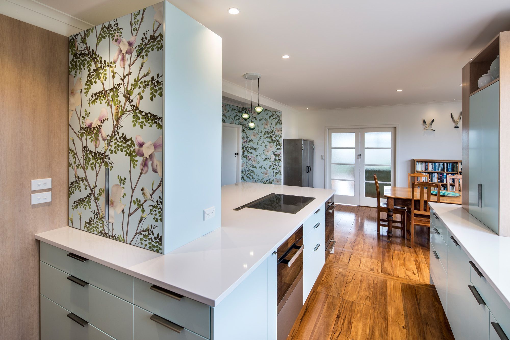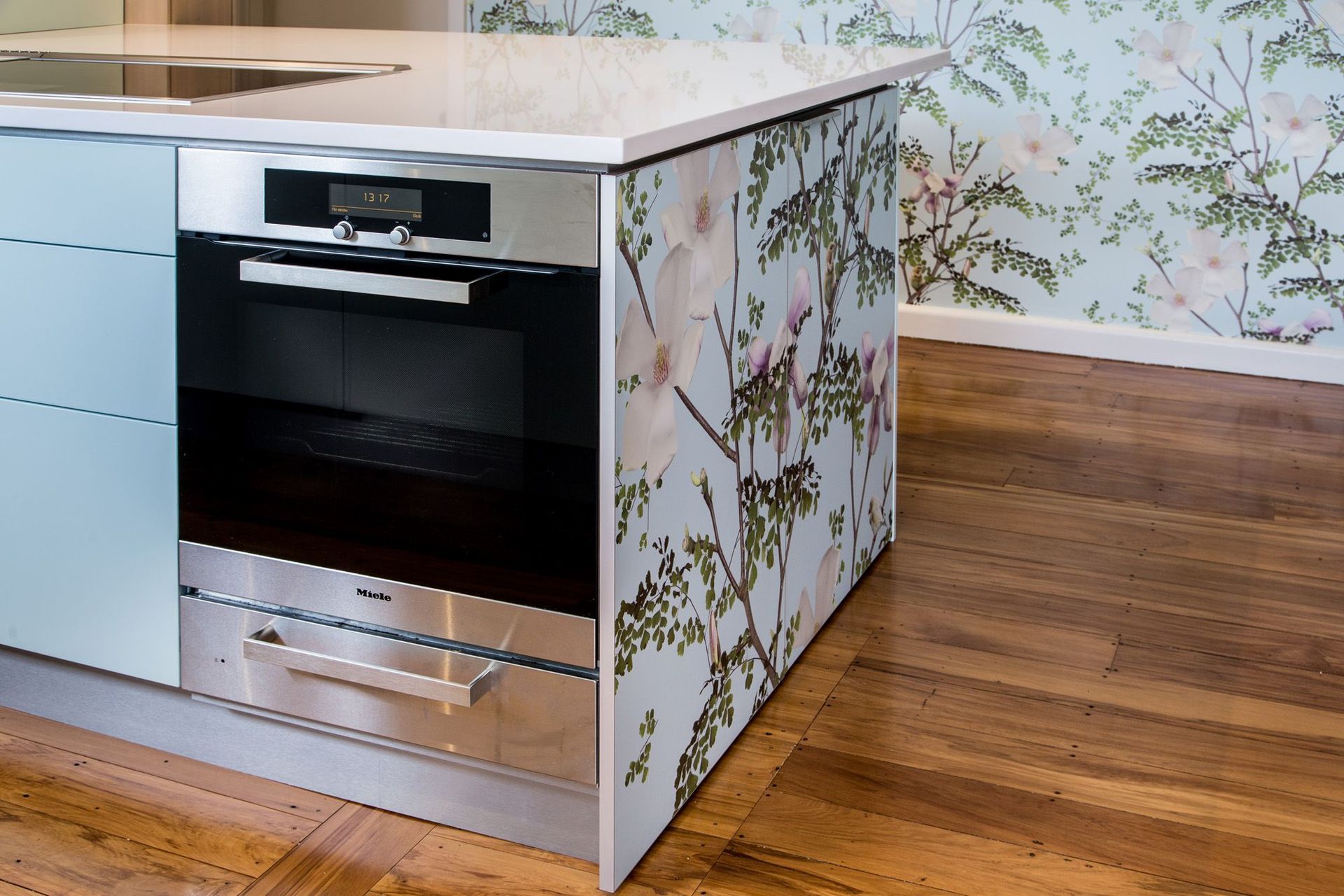 ArchiPro Project Summary - A vibrant kitchen renovation blending botanical imagery with modern functionality, featuring a spacious island, integrated appliances, and enhanced storage, all while maximizing natural light and views in a charming 1960s home.