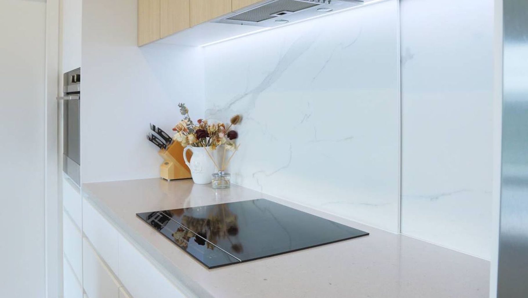 ArchiPro Project Summary - A bright and uplifting kitchen featuring Melteca Soft Touch White Linen cabinetry and Bestwood Perfect Oak overhead cupboards, complemented by a Dekton Aura splashback with a hidden panel for convenient storage, perfectly harmonizing with coastal views.