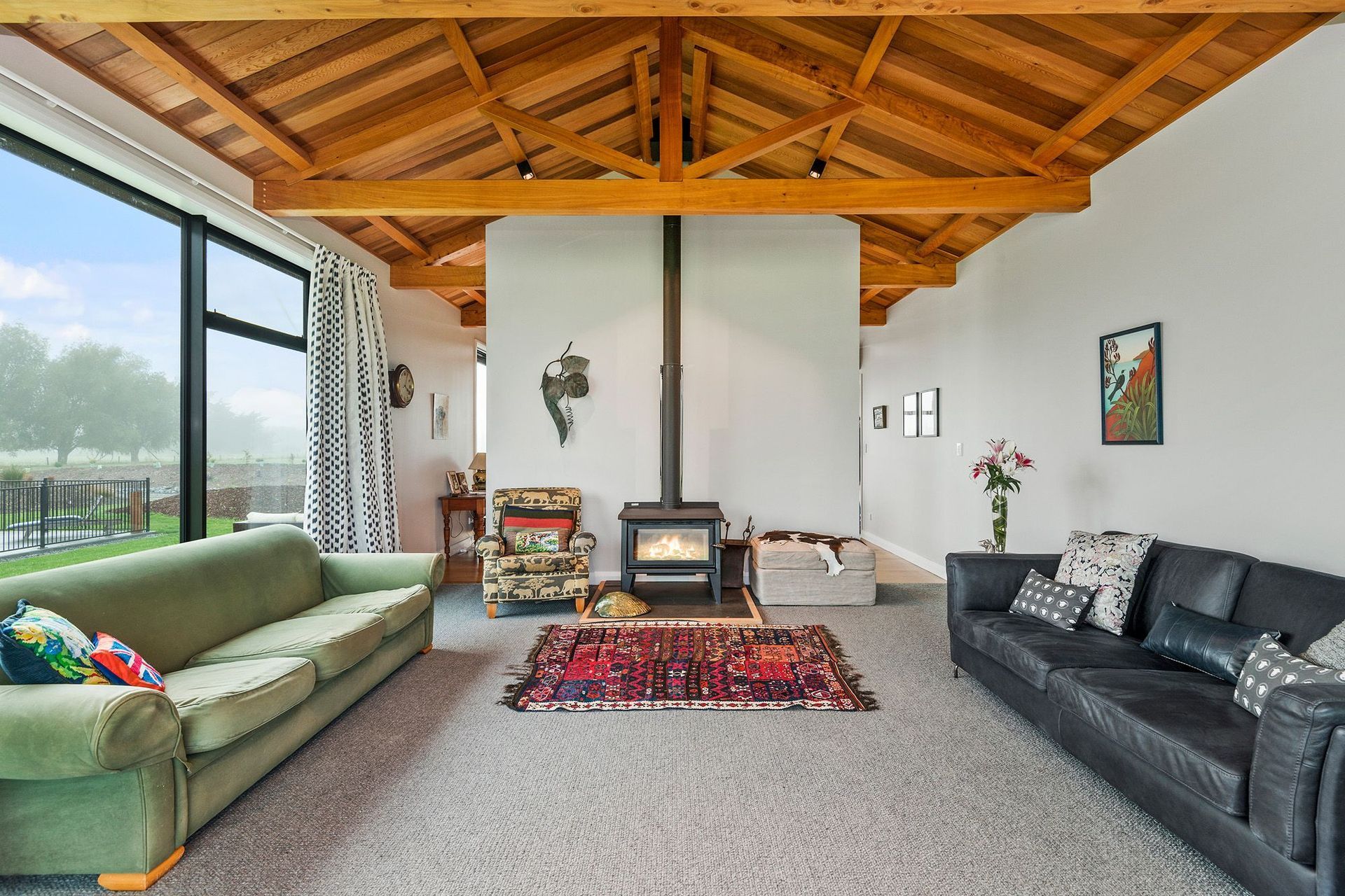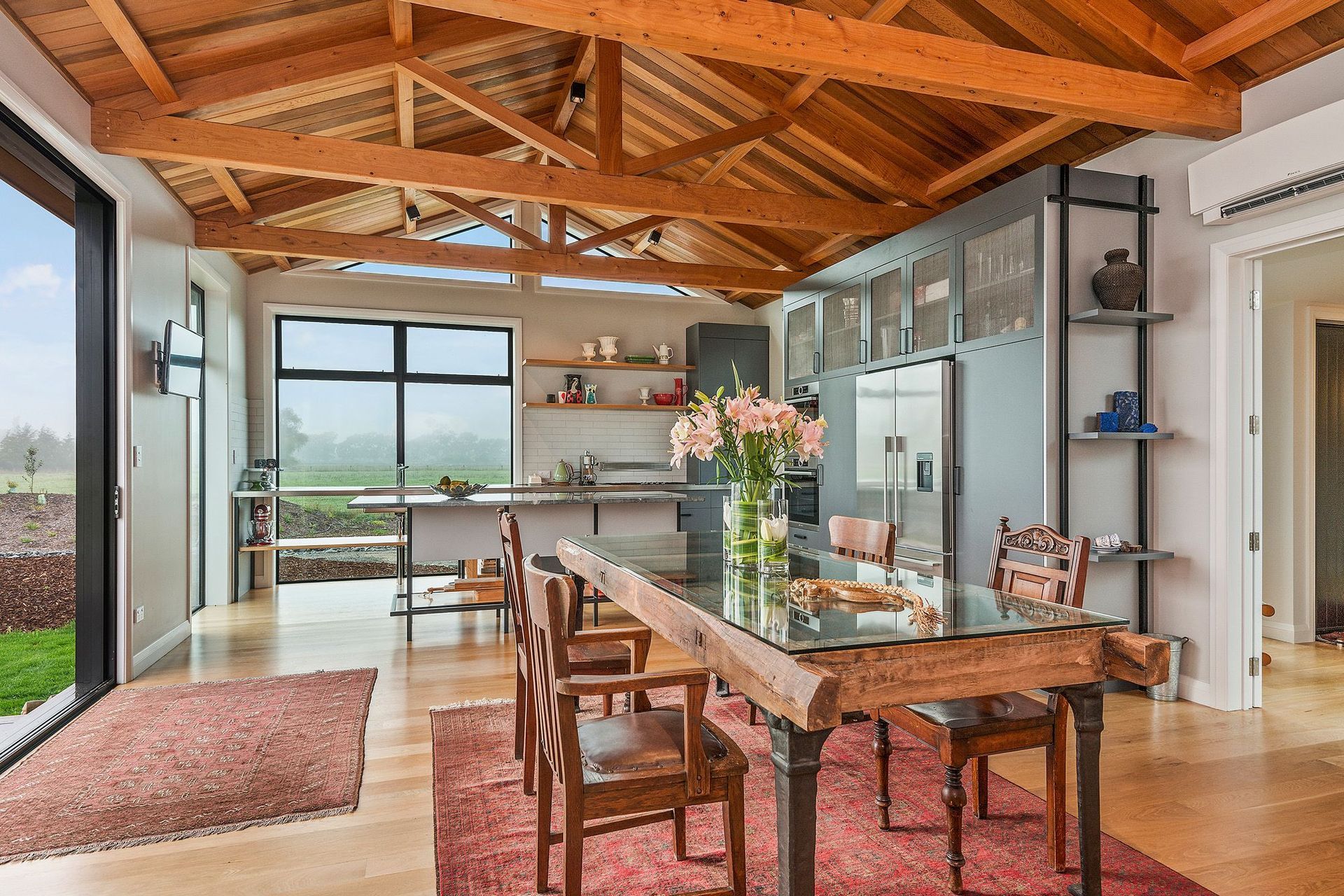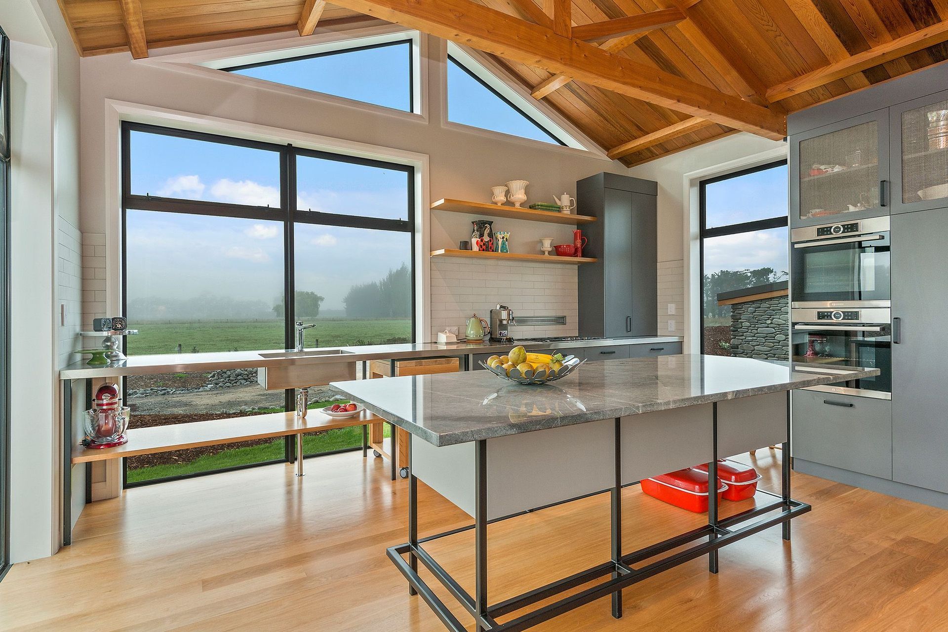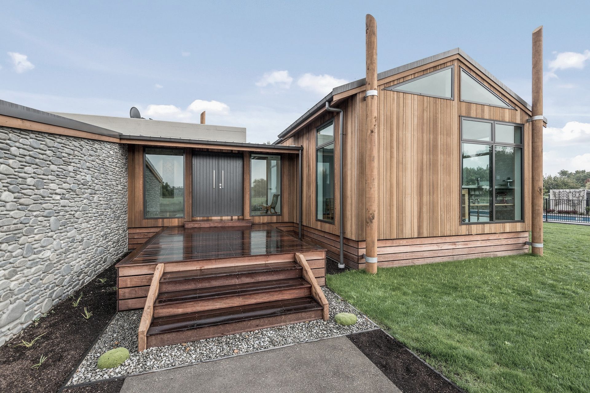 ArchiPro Project Summary - A stunning Maimai-inspired home featuring handmade Macrocarpa trusses, a robust cast-in-situ concrete spine wall, elegant cedar ceilings and claddings, oak flooring, handpicked river stone accents, and a lodge-style kitchen with a striking stainless steel bench. Winner of a House of the Year Gold Award.