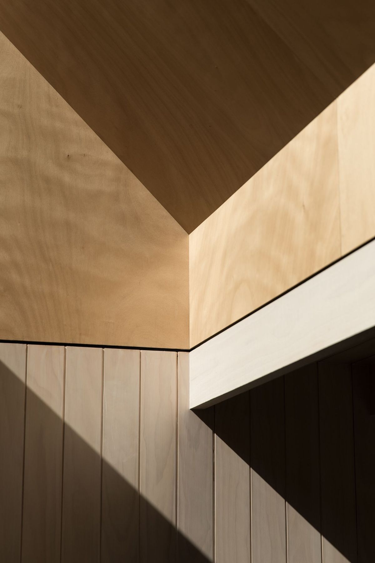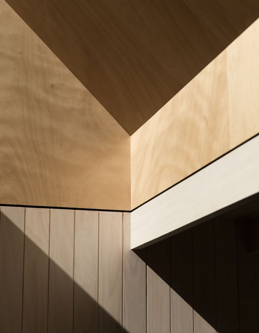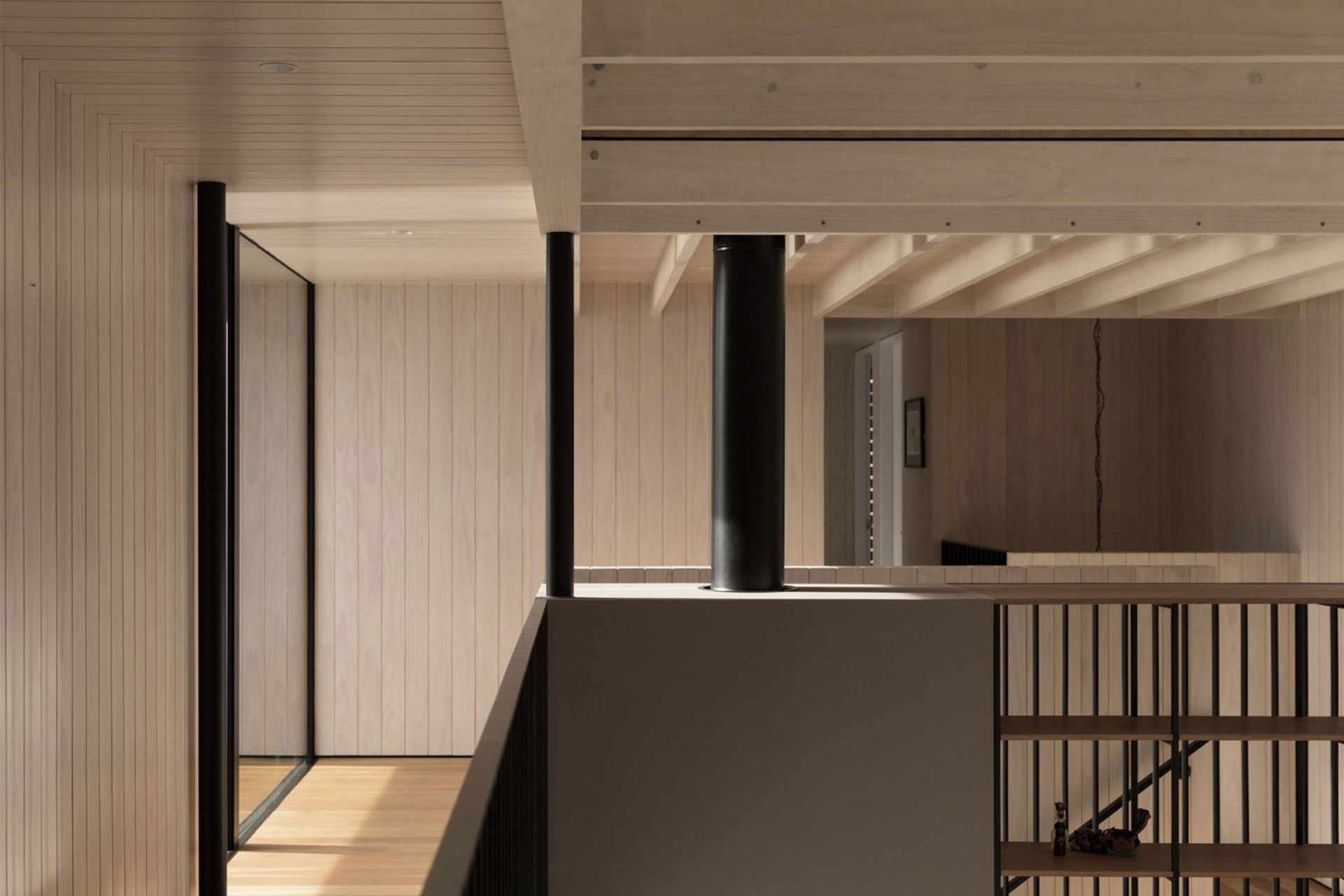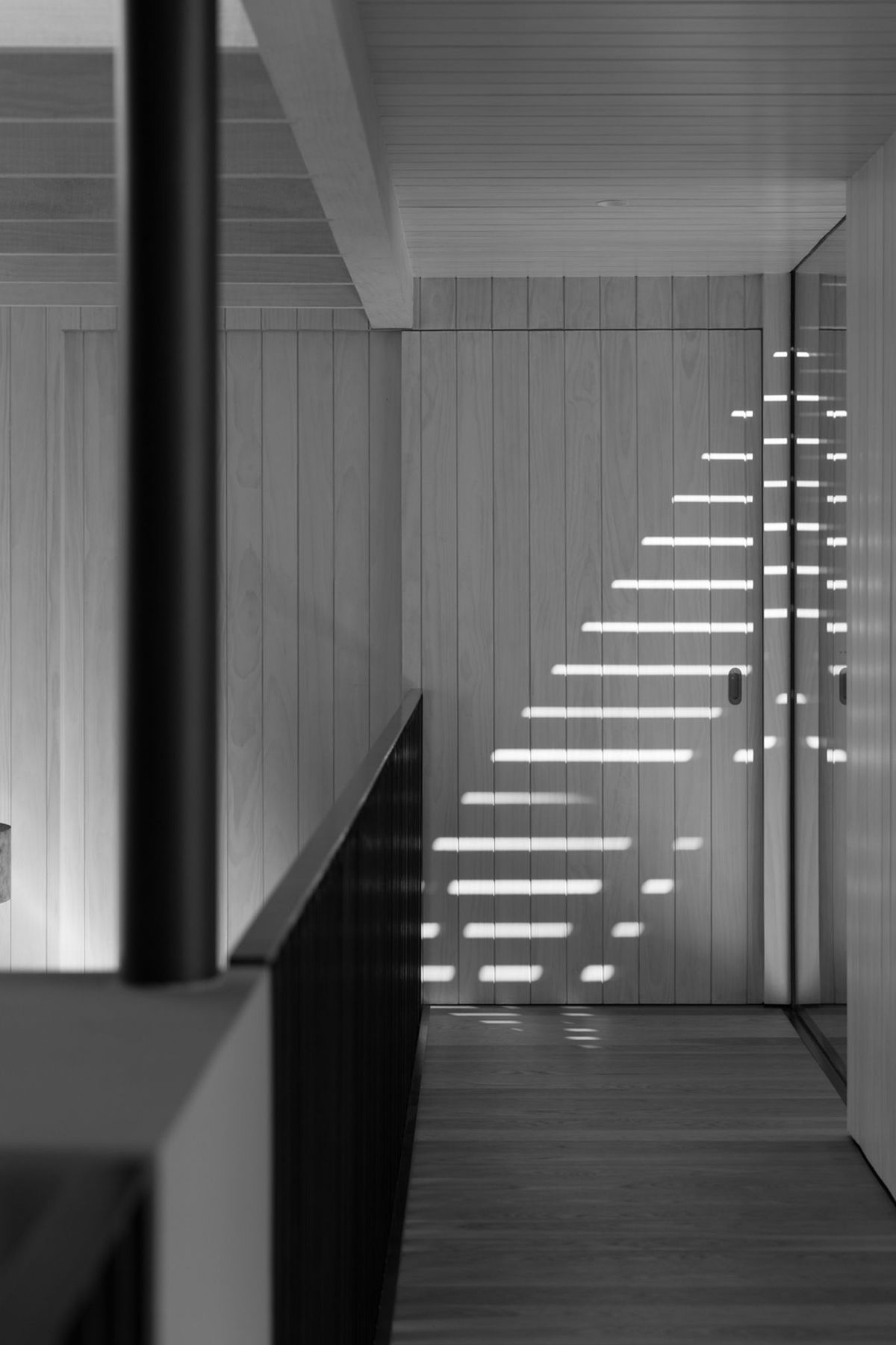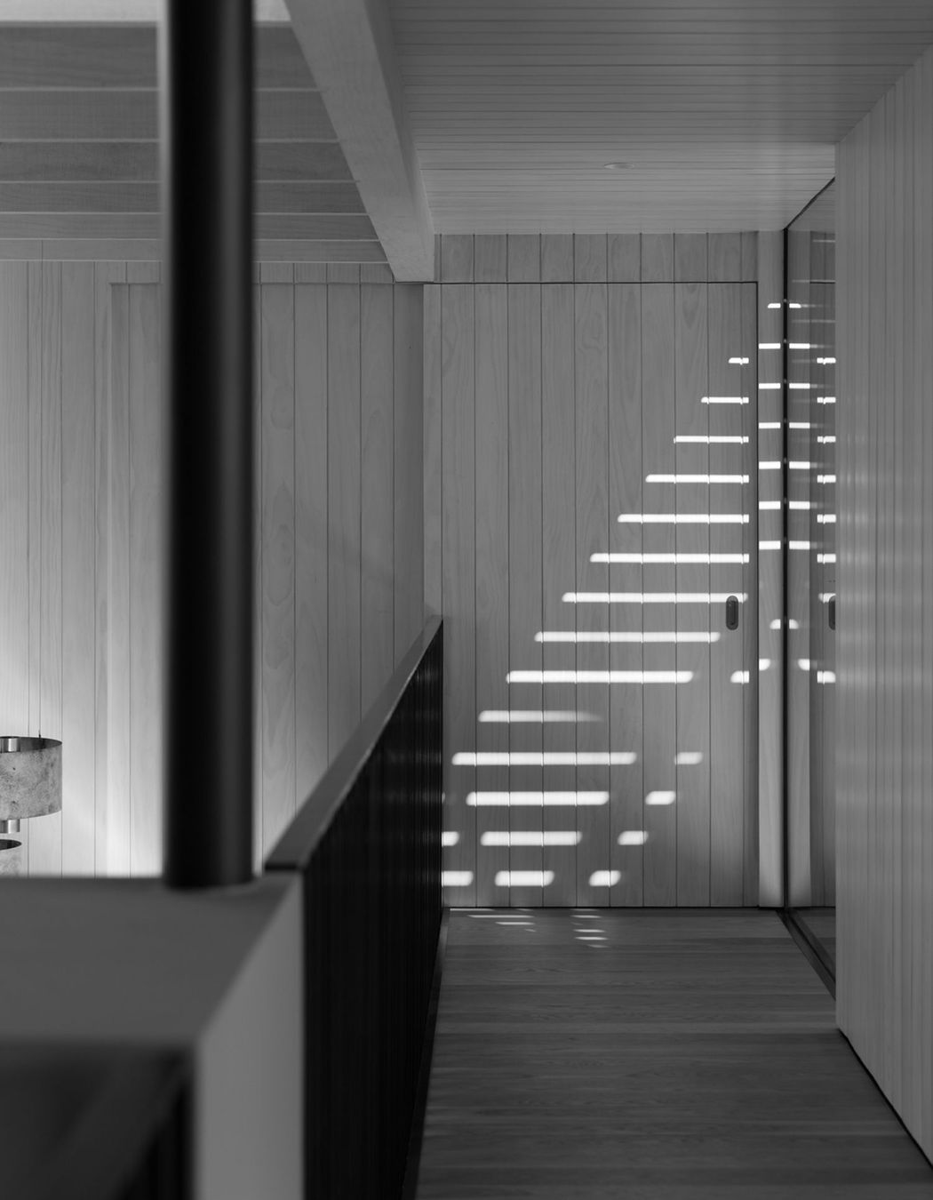 The architects wanted the entire house to be hermetically sealed in timber and designed the interior walls in whitewashed timber sarking. This vertical panelling creates lovely areas of light and darkness in the home, with an endless kaleidoscope of sunshine patterns that move across the interior throughout the day.