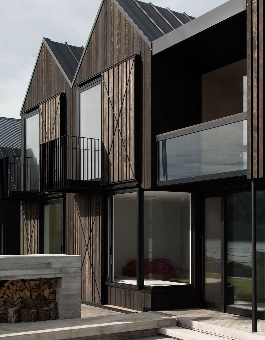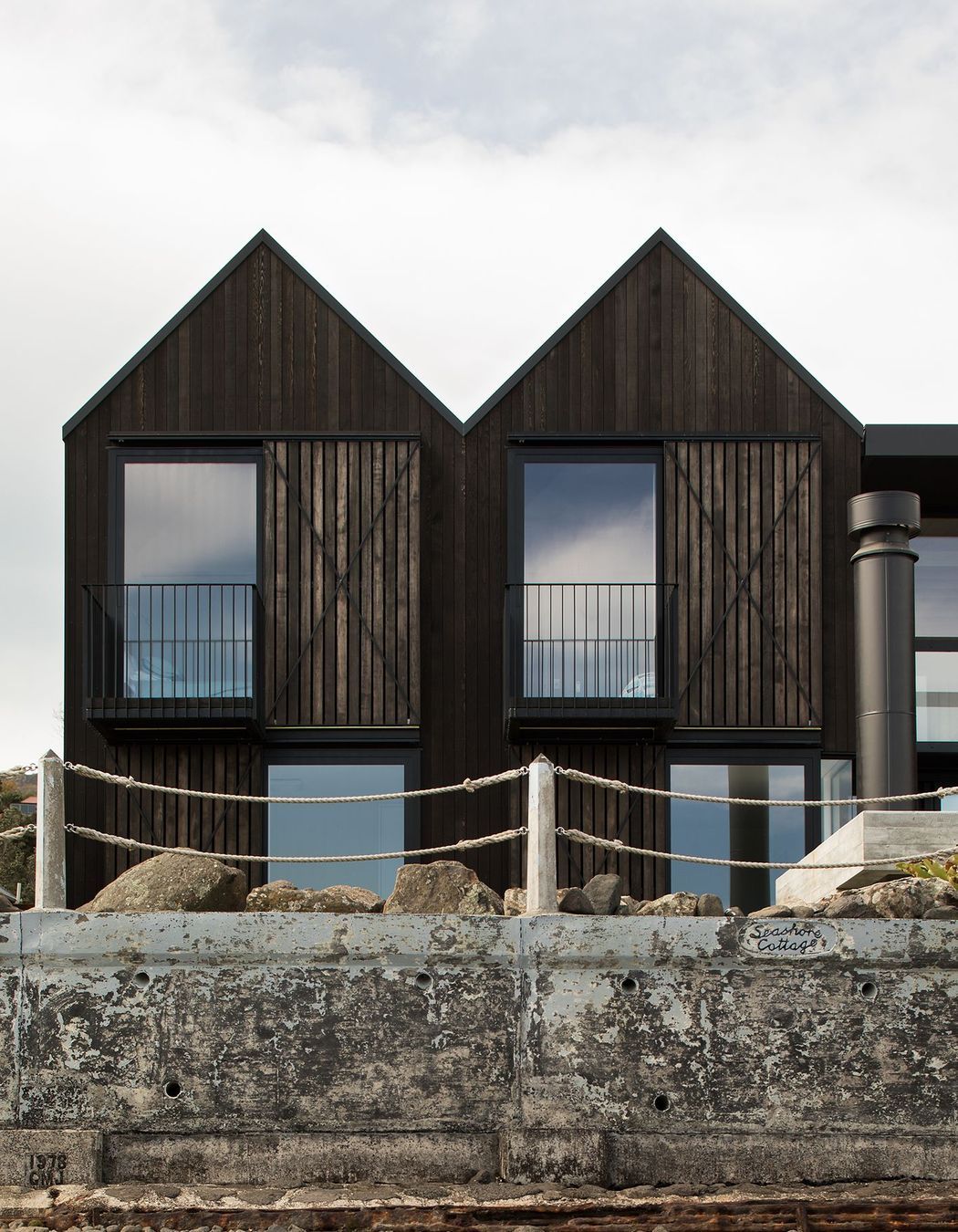 The upper level of the home is mainly timber clad with windows punched in at random, in keeping with the older buildings of the area. Alongside the timber and glass, a good amount of concrete has been used, visible in the interior flooring, the exterior fireplace and in the steps leading down to the rocks and boulders that have been placed along the front of the site.