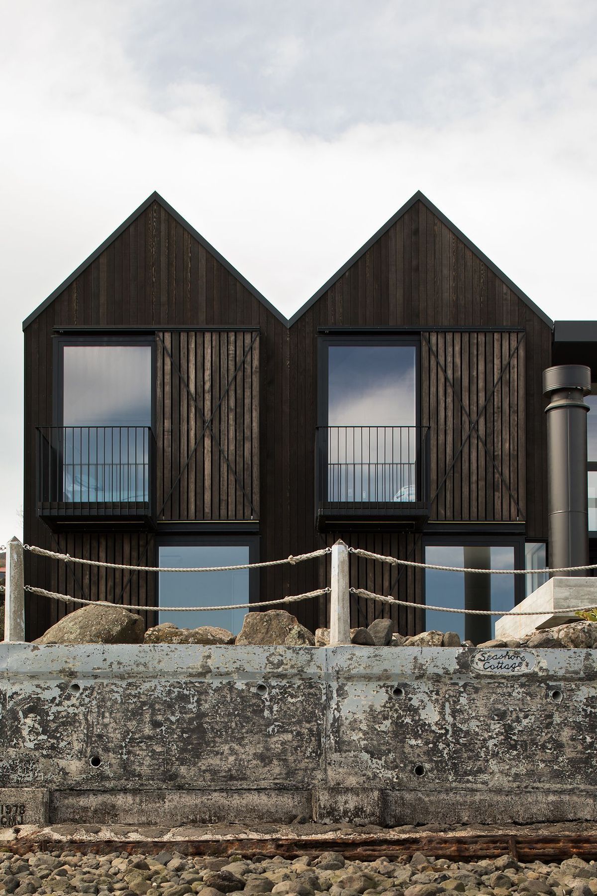 Being located so close to the harbour, it was important to include different exterior spaces to sit in at various times of the day, depending on the weather and prevailing sun. There is an easterly morning courtyard and a sunken front courtyard with a large concrete fireplace for all-year-round use, which is set further back from the adjacent sea wall for privacy and shelter.