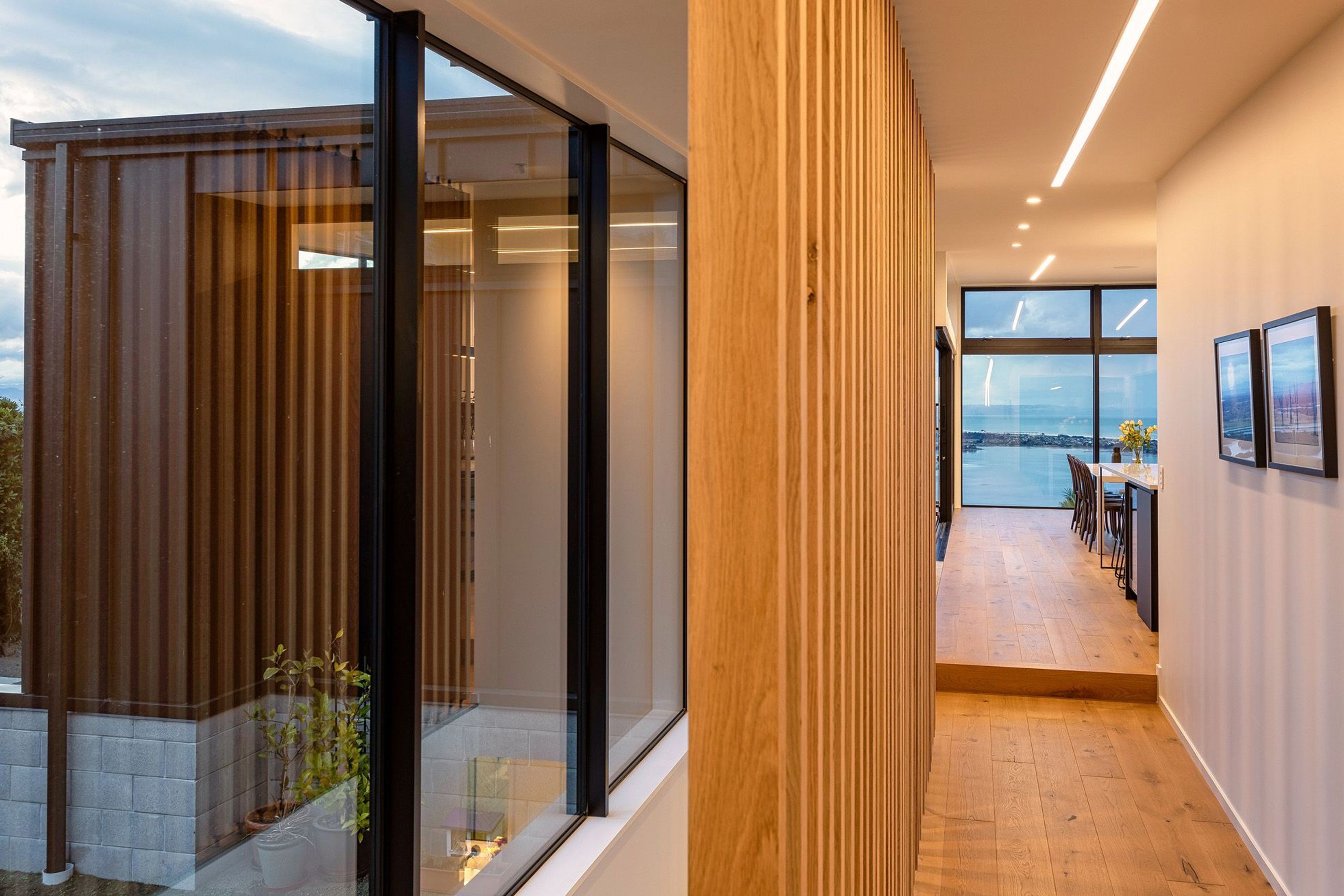 ArchiPro Project Summary - A thoughtfully designed residence featuring a single pitch sloping roof that harmonizes with the natural terrain, offering stunning views of the Kaikoura ranges and the ocean, while creating a gradual reveal of space and light as one moves through the home.