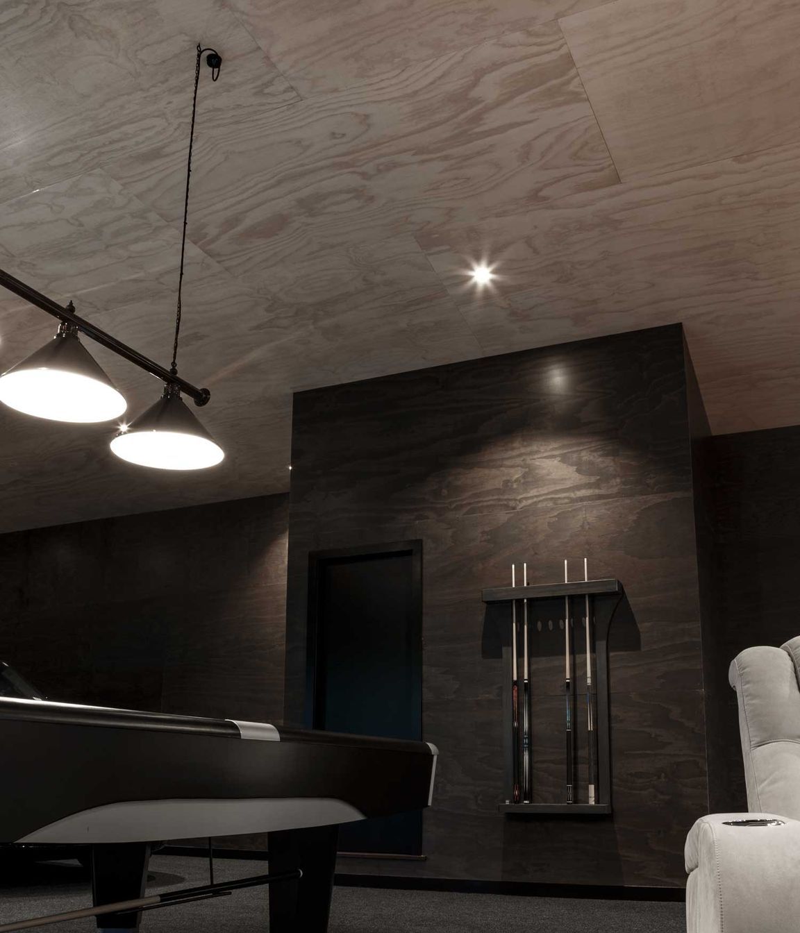 ArchiPro Project Summary - A meticulously finished man cave in Riverhead, featuring a spacious 170 square metre layout with a kitchen, bathroom, and personal gym, all designed for comfort and entertainment, showcasing PlyPlay's innovative materials and soundproofing capabilities.