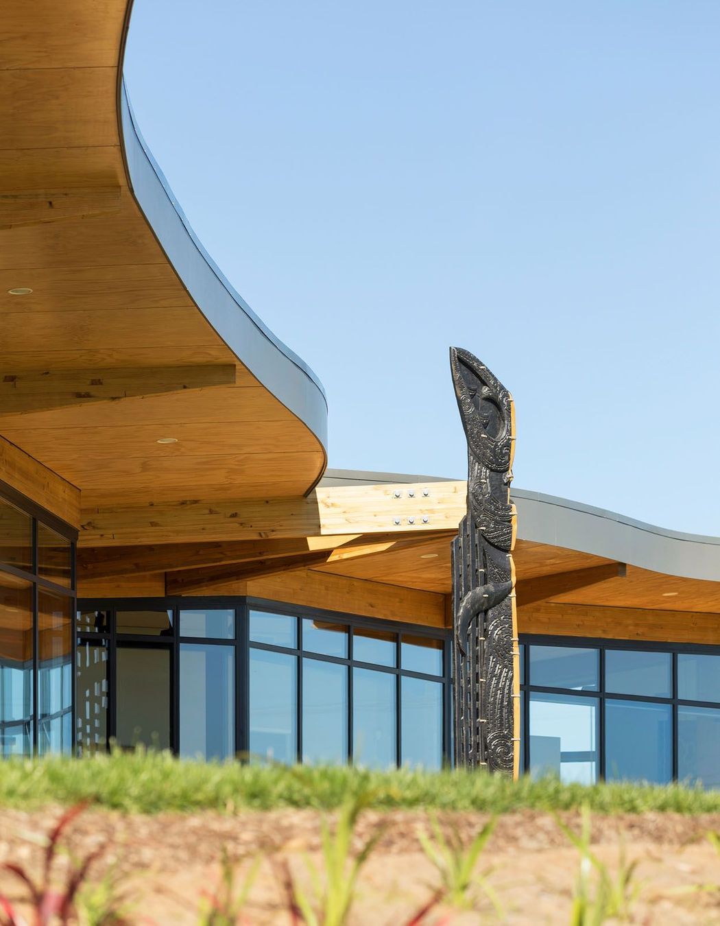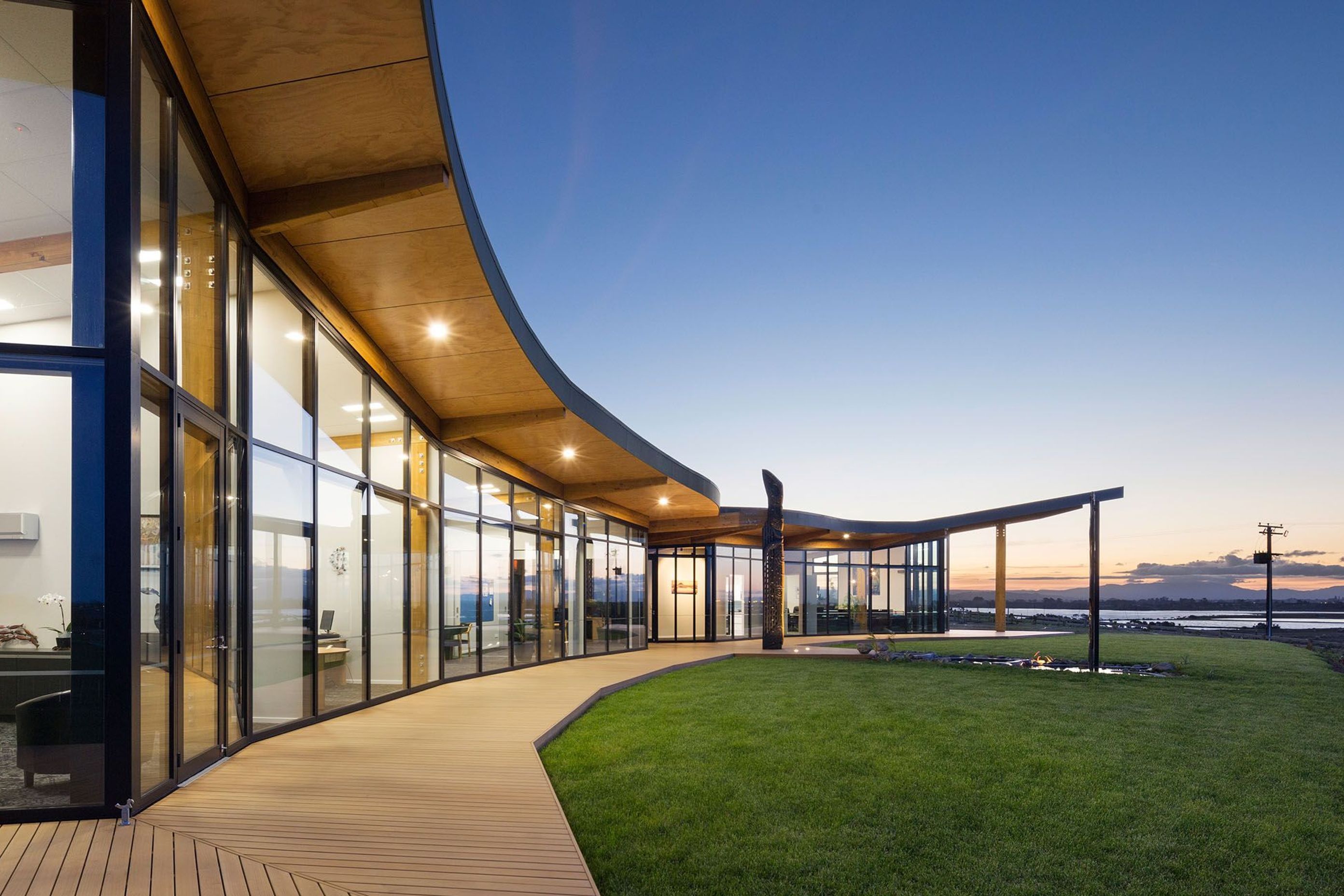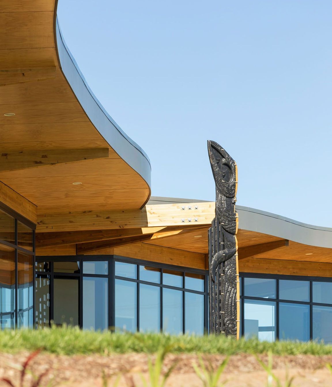 ArchiPro Project Summary - A culturally significant office building inspired by the legend of Mangatawa, featuring a whale tail roof design, carved pou, and stunning views of the Bay of Plenty, fostering community pride and connection to heritage.