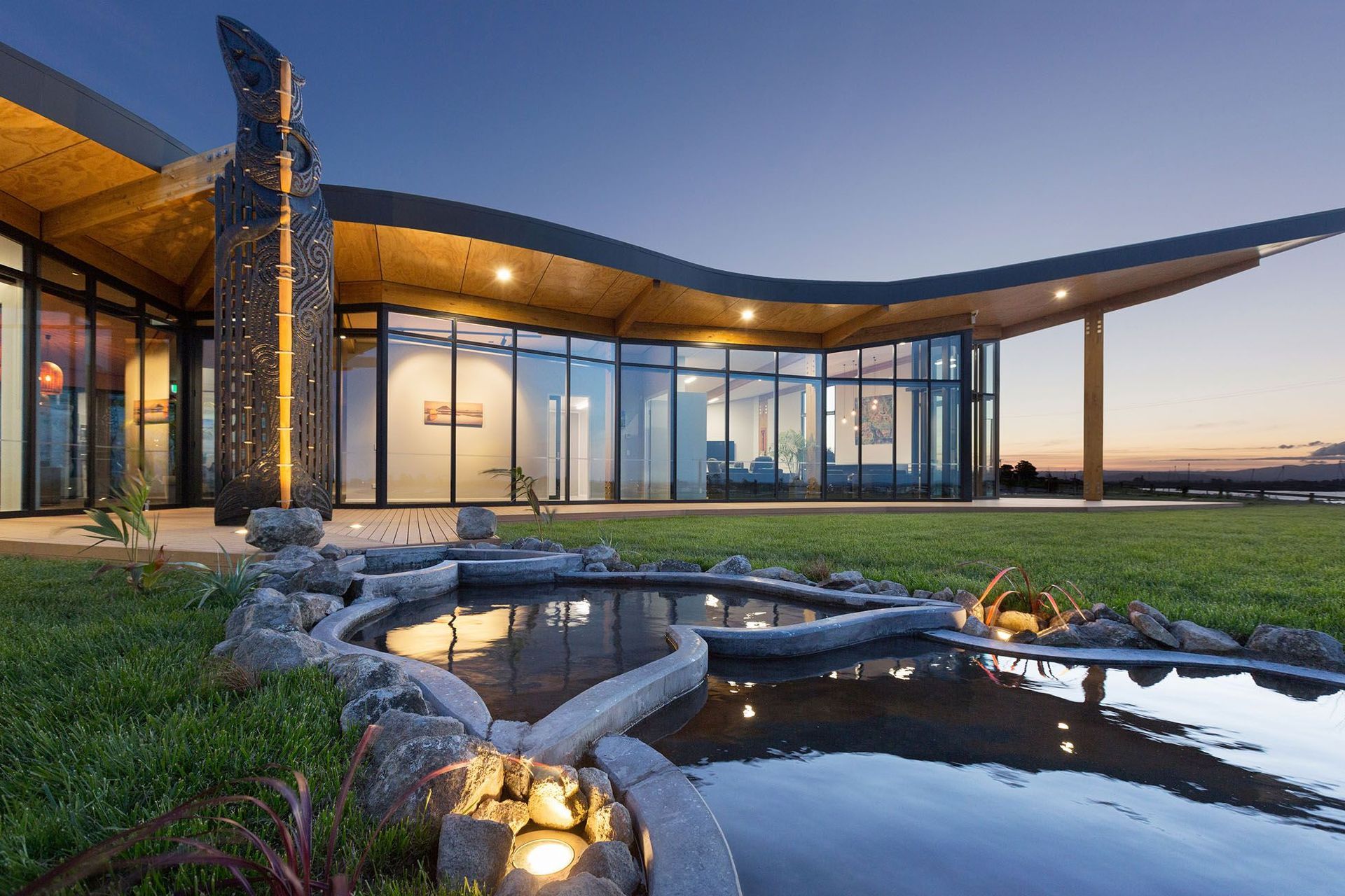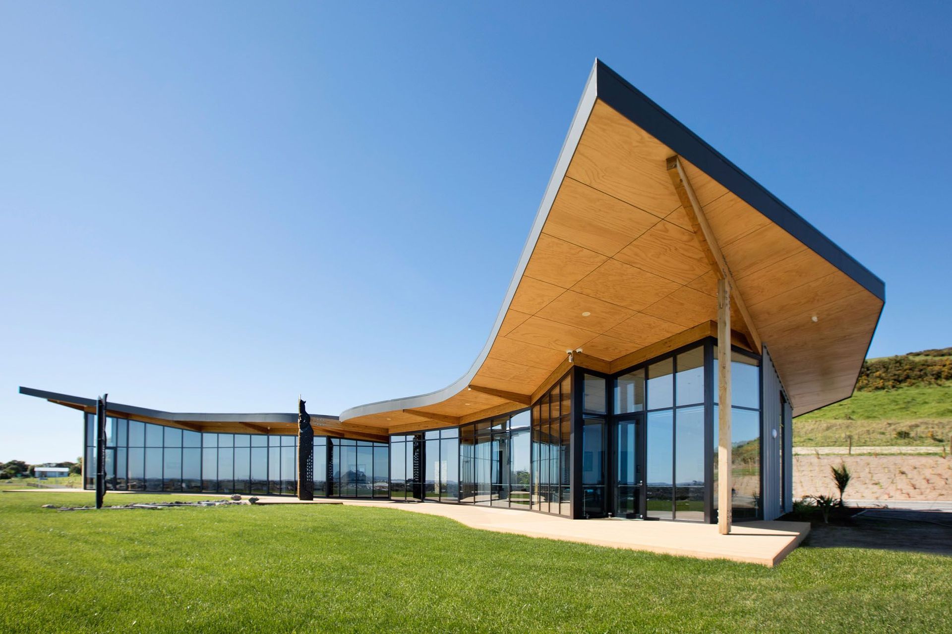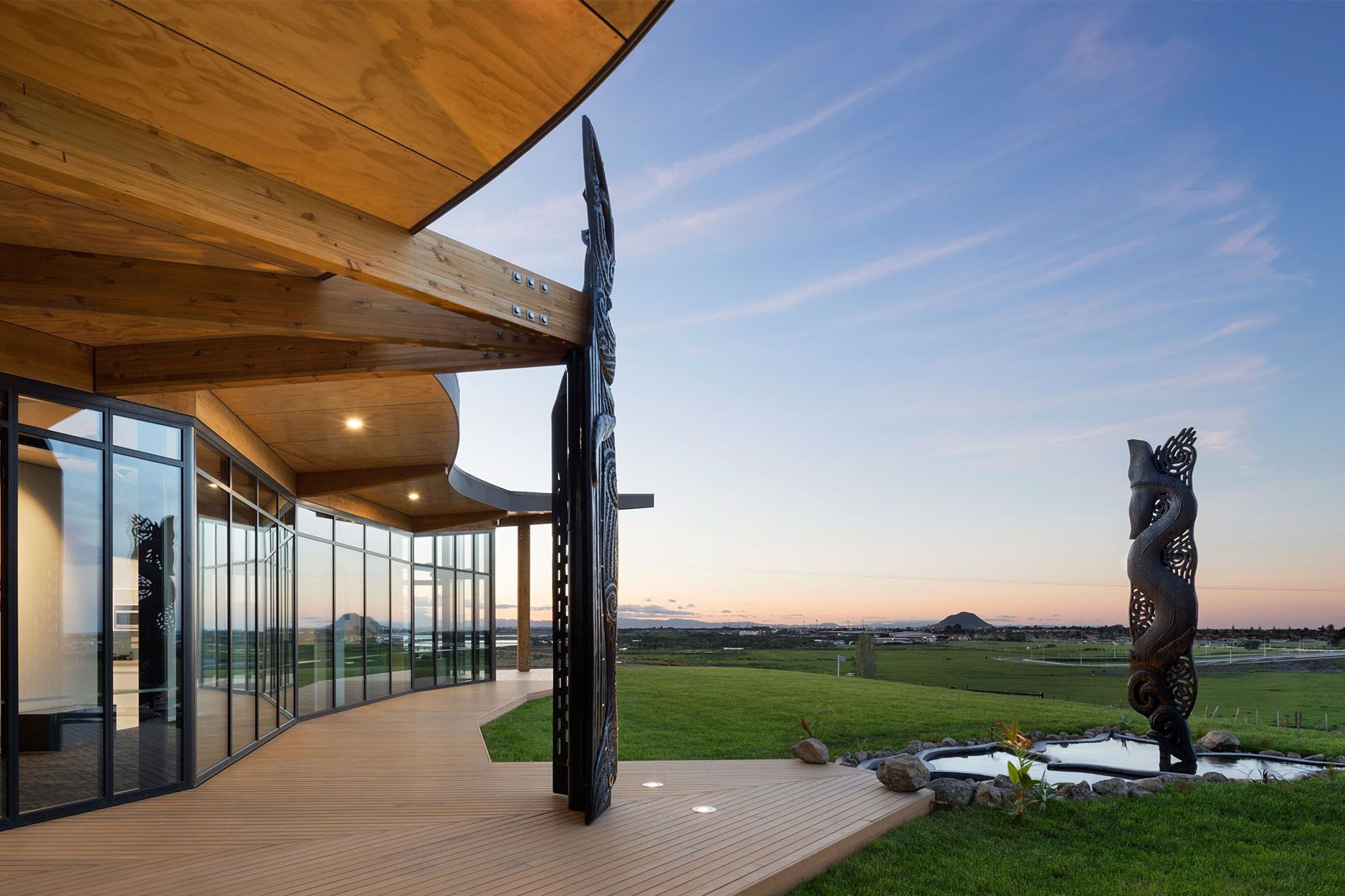 ArchiPro Project Summary - A culturally significant office building inspired by the legend of Mangatawa, featuring a whale tail roof design, carved pou, and stunning views of the Bay of Plenty, fostering community pride and connection to heritage.