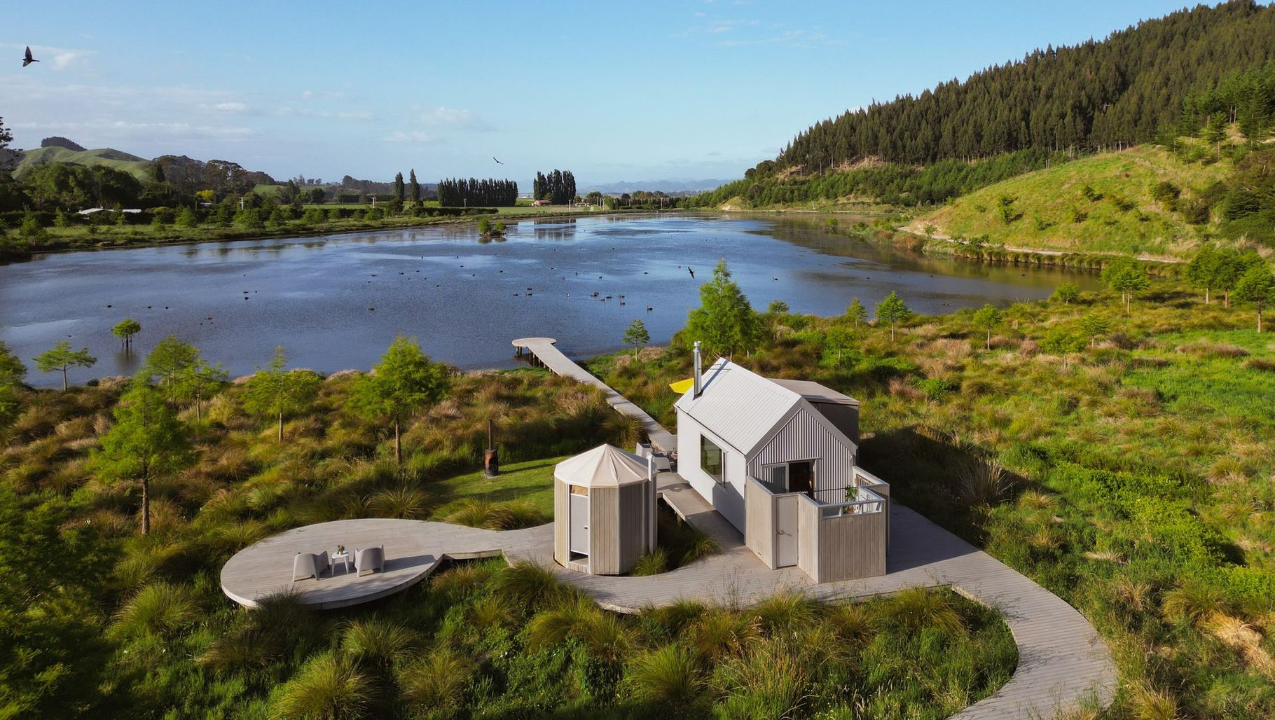 ArchiPro Project Summary - A serene gable roof cabin designed for Manutuke Eco Retreat, featuring a cozy interior with Birch ply and exposed beams, complemented by large windows. Nestled by a wetland lake, it includes interconnecting decks and a semi-outdoor bathroom, enhancing the natural surroundings.